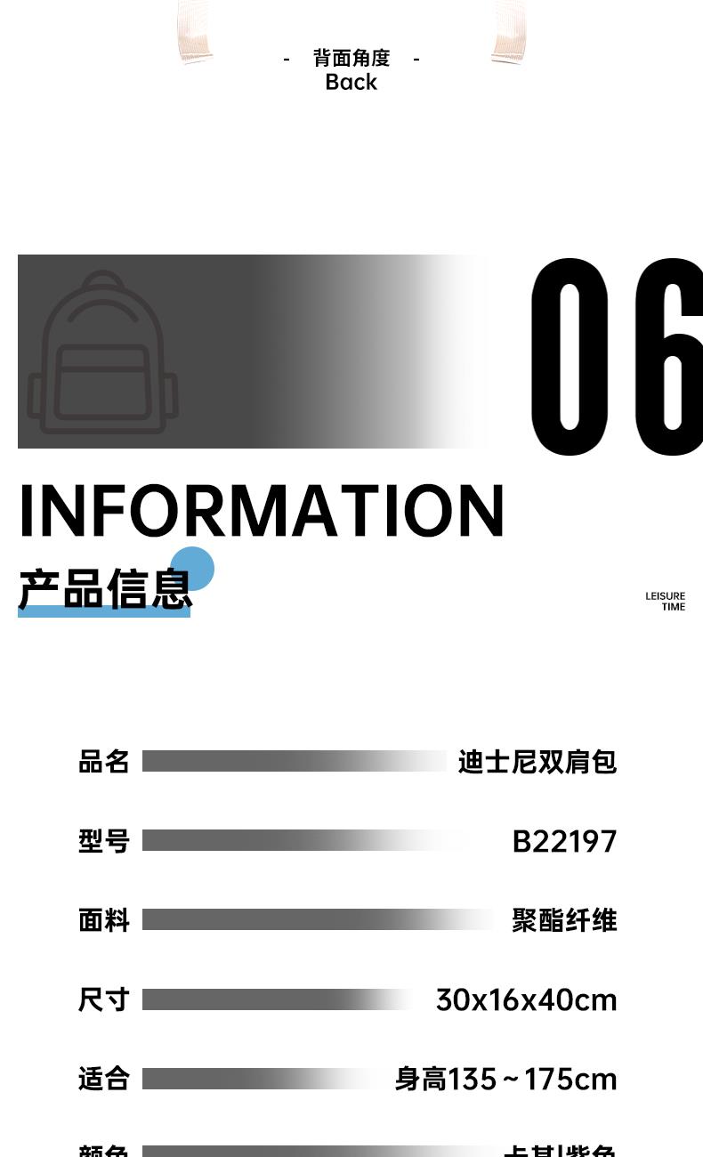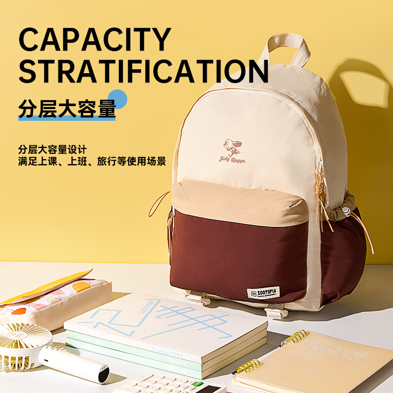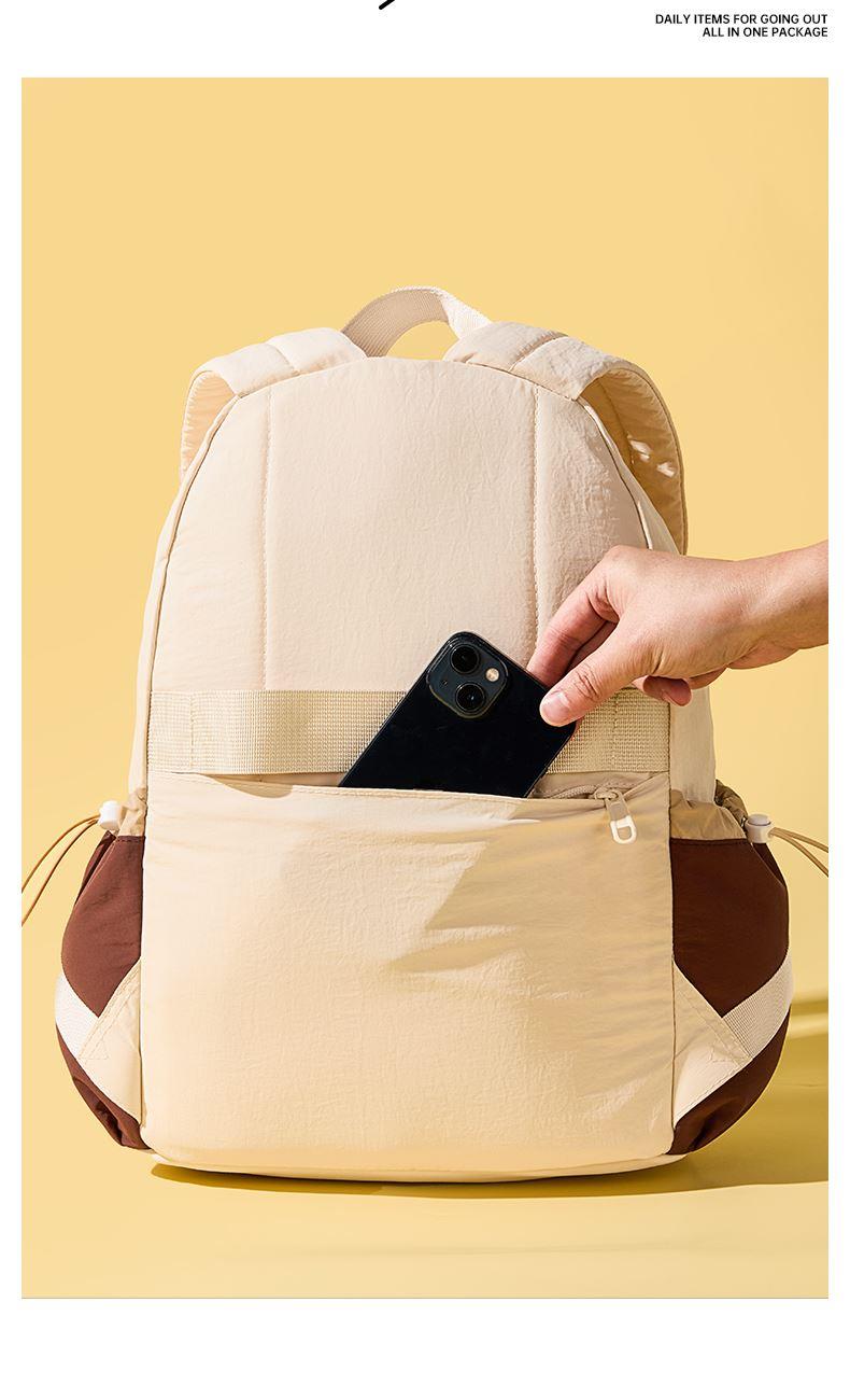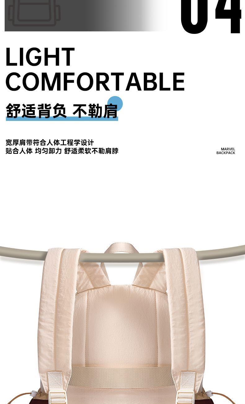 材质:聚酯纤维 尺寸:30*16*40CM 建议身高:135-175cm 卖点: ①分层大容量设计满足上课、上班、旅行等使用场景空间尽然有序 便于分类存放和快速找到所需物品 ②柔软面料,隐藏背袋;柔软的触感设计独具时尚感,适配多种穿搭风格 ③舒适背负,不勒肩,宽厚肩带符合人体工程学设计贴合人体、均匀卸力、舒适柔软不勒肩脖 ④独特的拼色设计 采用流行的色彩赋予它一种沉稳、低调而又时尚的气质能够展现使用者的个性和品味