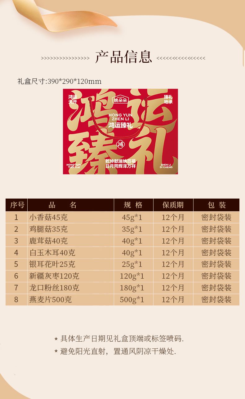 小香菇45克 鸡腿菇35克 鹿茸菇40克 白玉木耳40克 银耳花叶25克 新疆灰枣120克 龙口粉丝180克 纯燕麦片500克 包装盒-鸿运臻礼