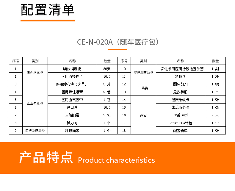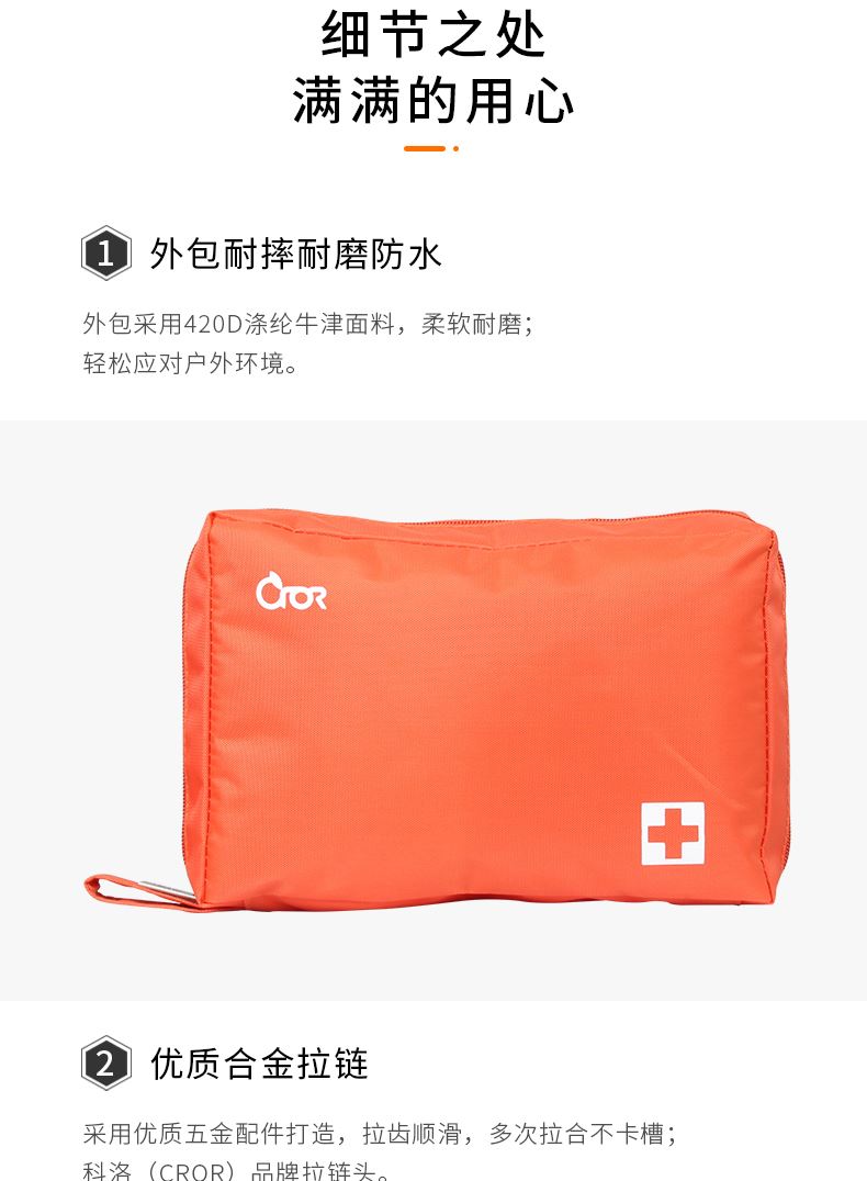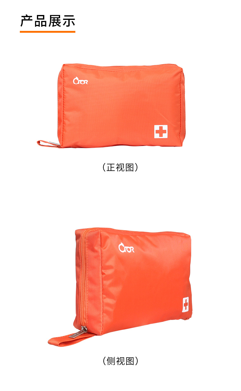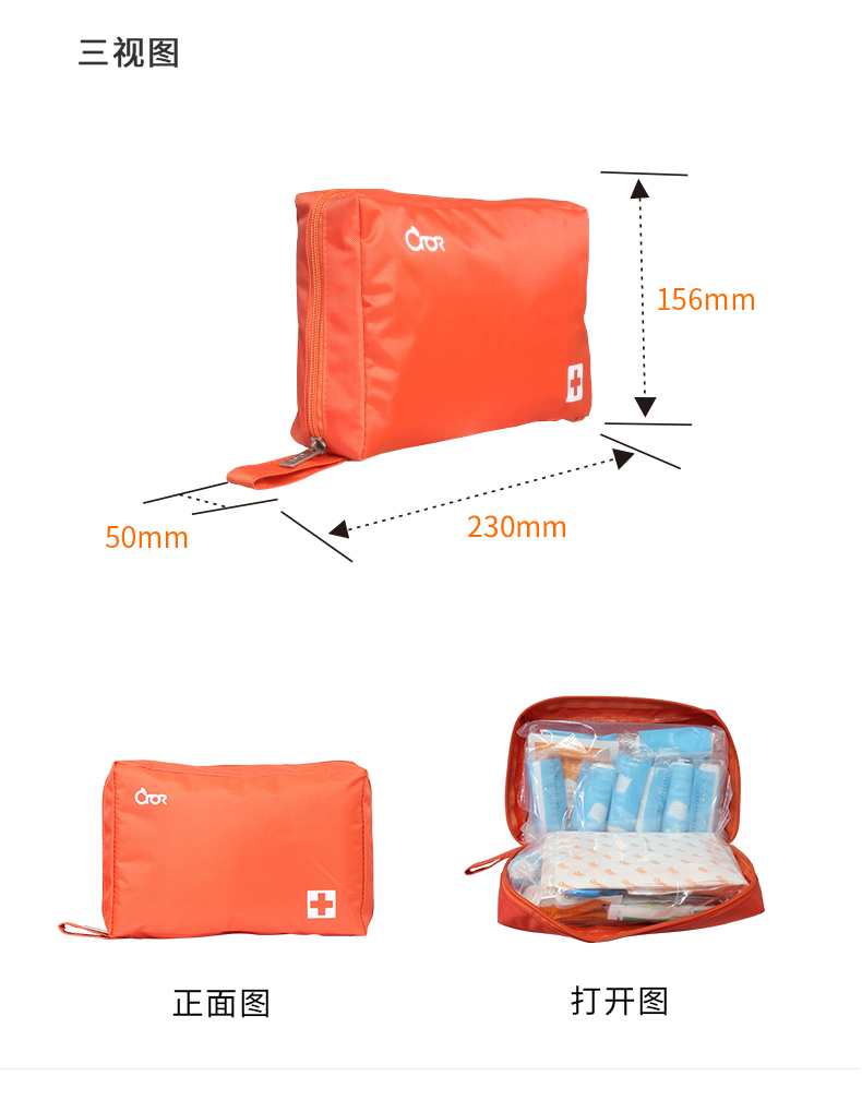 产品材质:420D 牛津布 产品规格:230*156mm50mm 产品颜色:安全橙 产品配置:含5大类18种急救用品