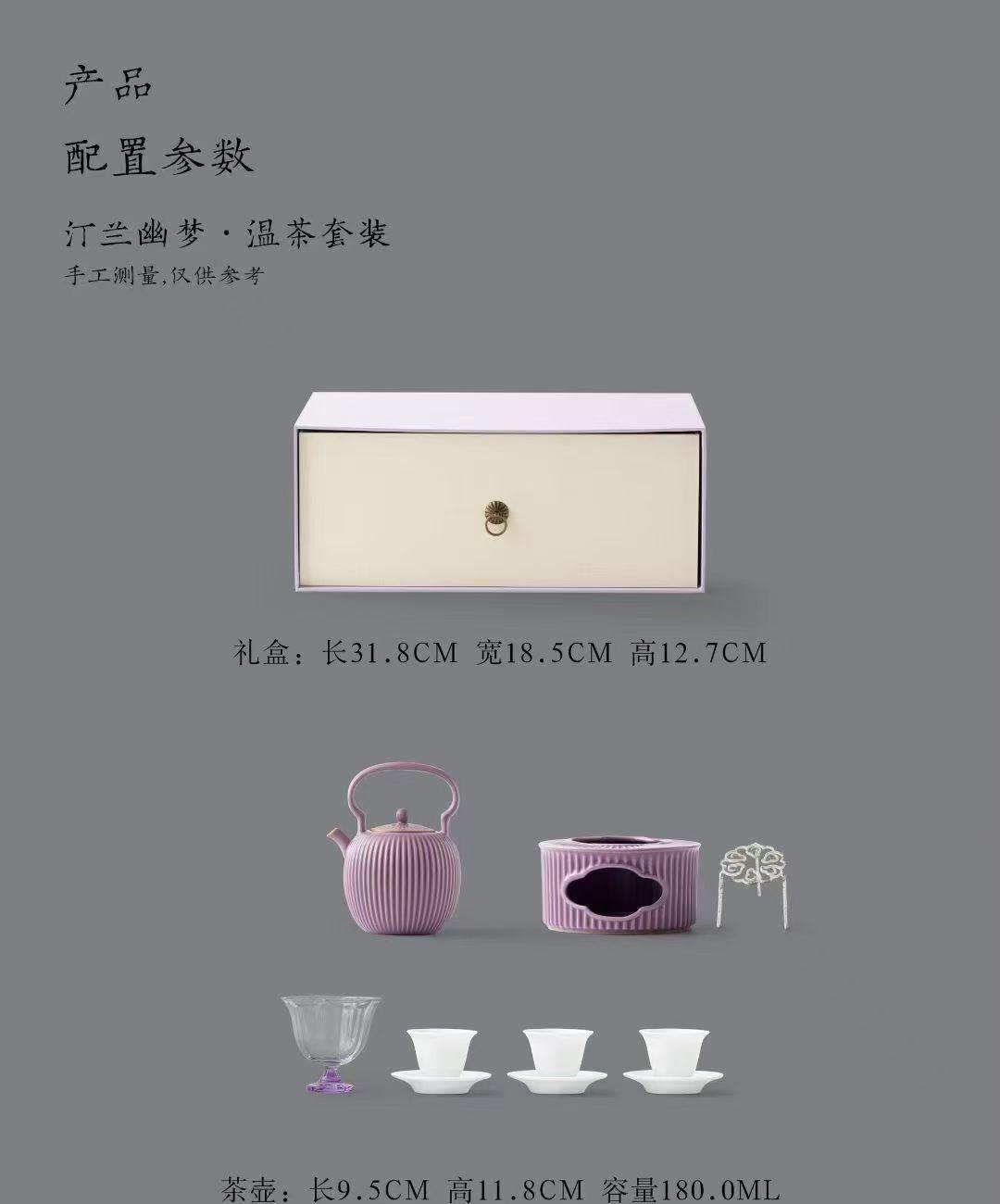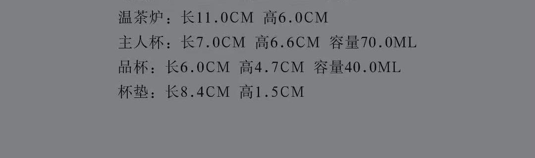 配置:提梁壶*1,茶炉*1,主人杯*1,茶杯*3,杯垫*3. 茶壶:长9.5CM高11.8CM容量180.0M, 温茶炉:长11.0CM高6.0CM, 主人杯:长7.0CM高6.6CM容量70.0ML, 品杯:长6.0CM高4.7CM容量40.0ML, 杯垫:长8.4CM高1.5CM, 礼盒:长31.8CM宽18.5CM高12.7CM。