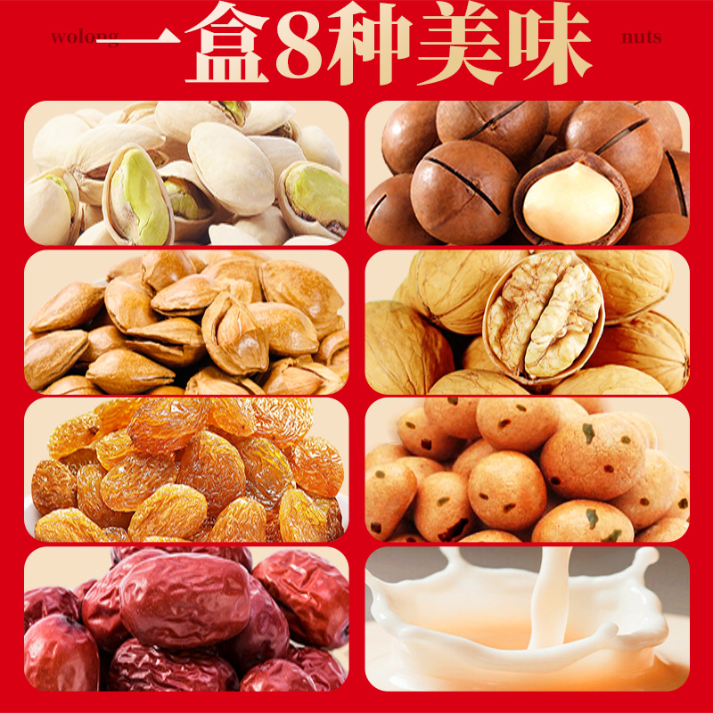 开心果 50g*1袋 夏威夷果 100g*1 袋 纸皮核桃 160g*1 袋 小白杏 260g*1 袋 鱼皮花生 180g*1袋 提子干 120g*1 袋 灰枣 160g*1 袋 坚果乳 240ml*2罐