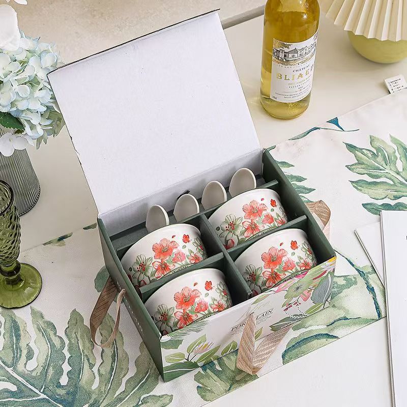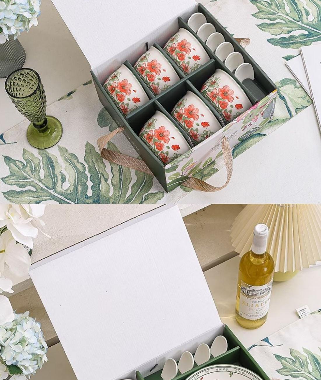 礼盒尺寸:11.8*23.8*19.2cm 外箱尺寸:50*40*62CM 21kg 材 质:新骨瓷 产品特点: 表面透明釉质保护层,可直接与食物接触。不含铅镉元素,安心享受美食滋味! 餐具整理厚实防烫,久经耐用,釉面光滑,清洗方便! 餐具包装美观大方,贴心手提设计,送礼大气又档次