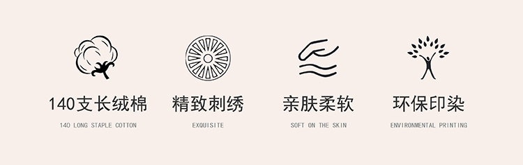 床单:245x270cm 被套:200x230cm 枕套:48x74cm 【面 料】新疆长绒棉 (140支长绒棉) 产品特点: 1. 面料选用140支新疆长绒棉,棉中奢品,高支高密,如蚕丝般丝滑,柔软舒适; 2.精致绣花工艺,美观时尚,充满现代轻奢风; 3.活性印染,环保,色牢度高,不易褪色; 4.床单双层圆角贴边设计,品质。
