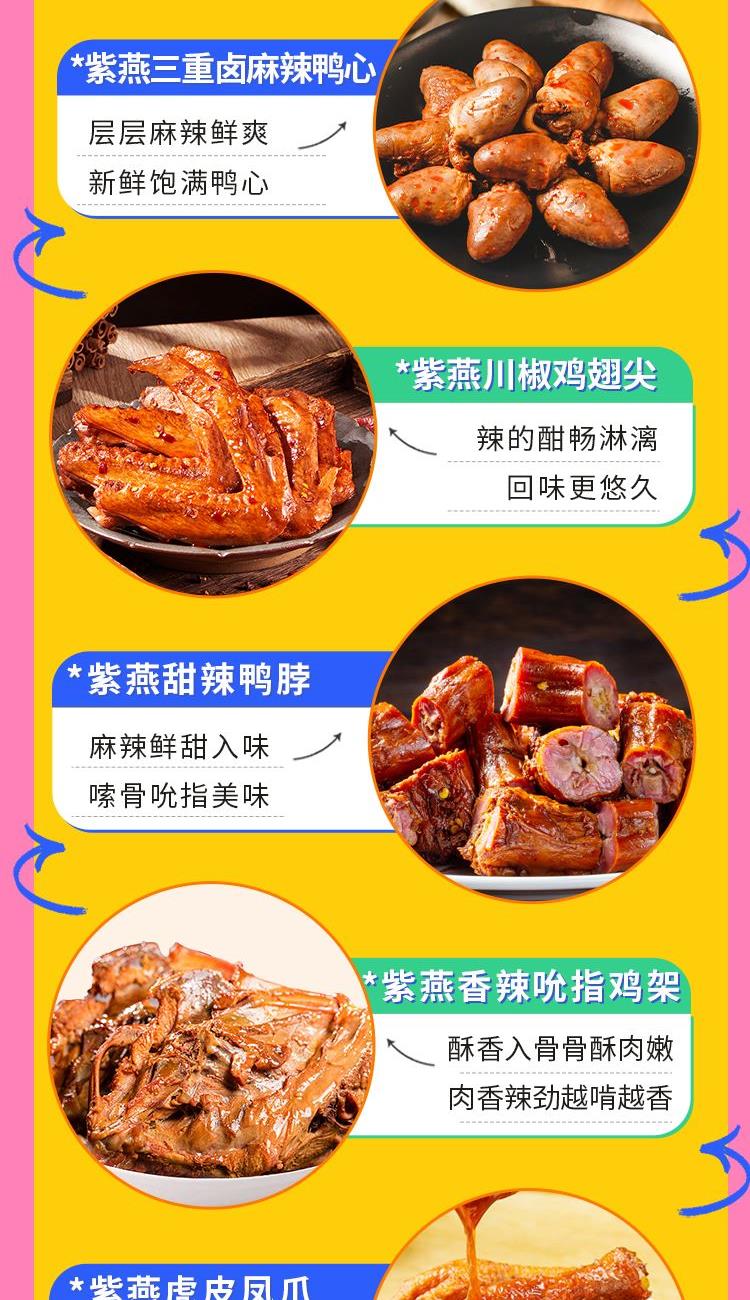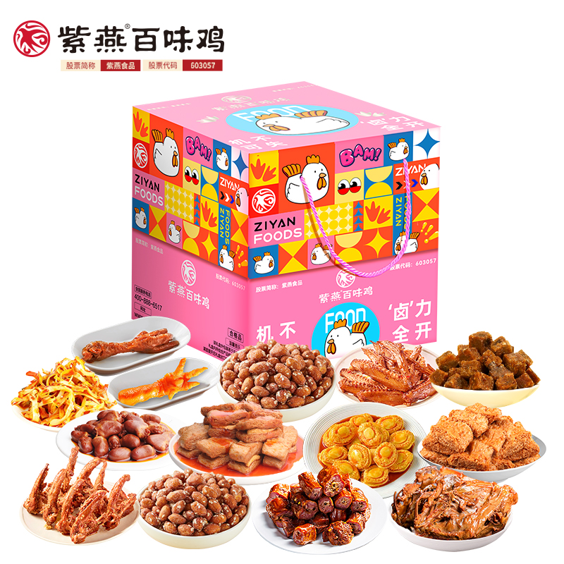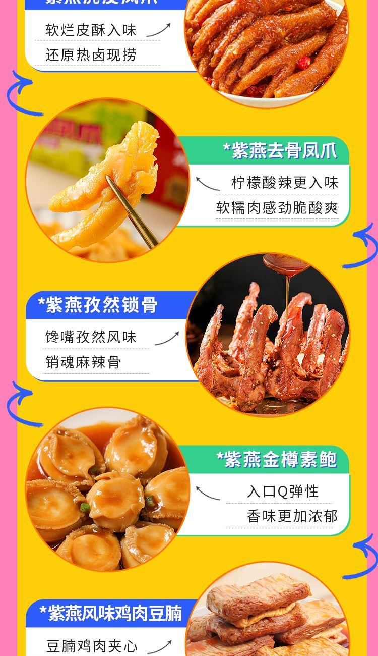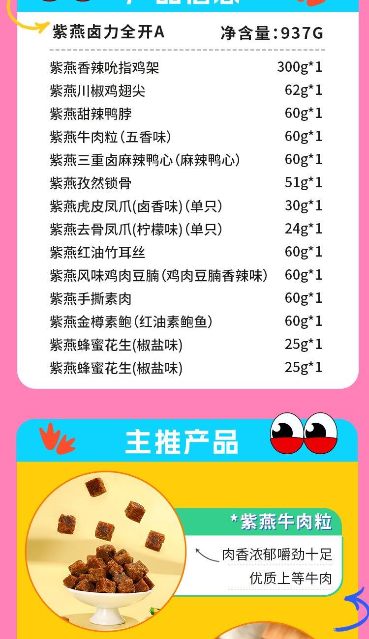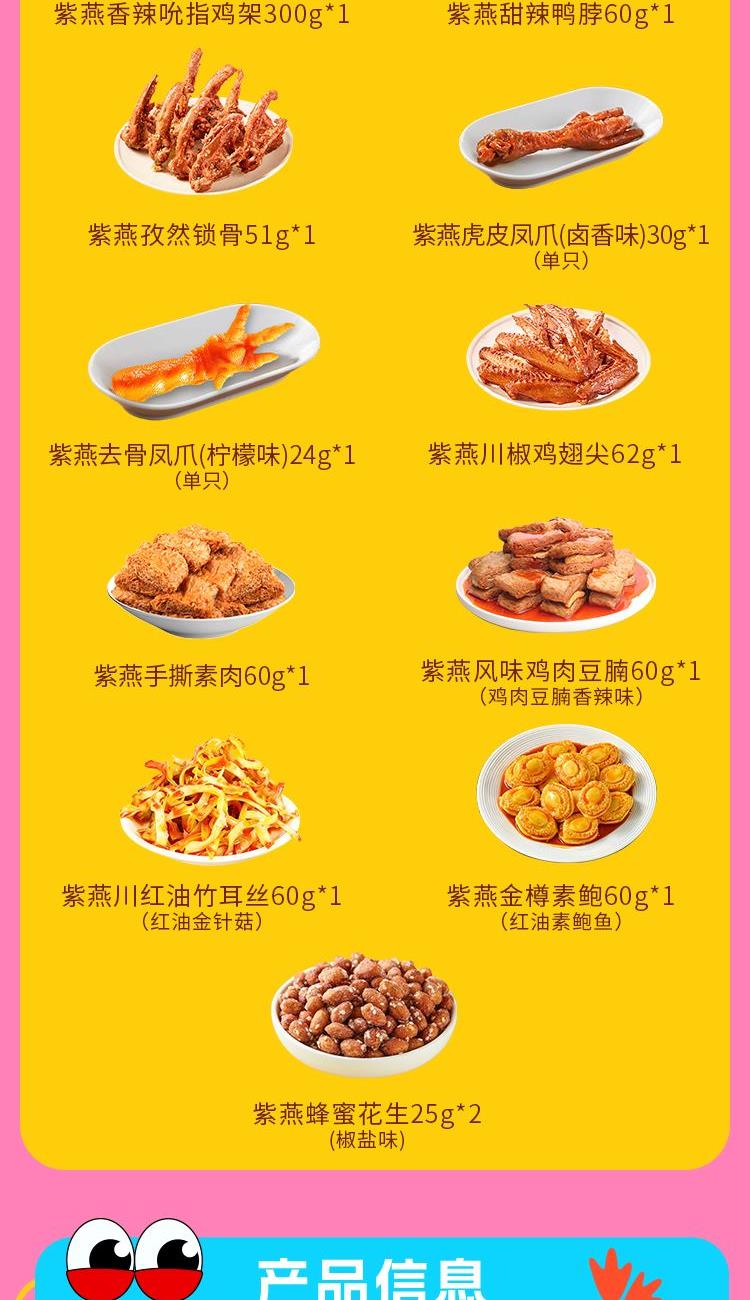 紫燕香辣吮指鸡架300g*1 紫燕川椒鸡翅尖62g*1 紫燕甜辣鸭脖60g*1 紫燕牛肉粒(五香味)60g*1 紫燕三重卤麻辣鸭心(麻辣鸭心)60g*1 紫燕孜然锁骨51g*1 紫燕虎皮凤爪(卤香味)(单只)30g*1 紫燕去骨凤爪(柠檬味)(单只)24g*1 紫燕红油竹耳丝60g*1 紫燕风味鸡肉豆腩(鸡肉豆腩香辣味)60g*1 紫燕手撕素肉60g*1 紫燕金樽素鲍(红油素鲍鱼)60g*1 紫燕蜂蜜花生(椒盐味)25g*2 礼盒+组装+外盒