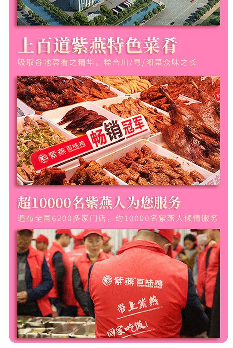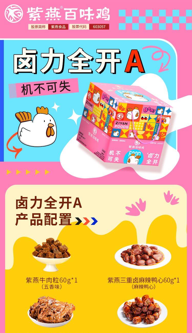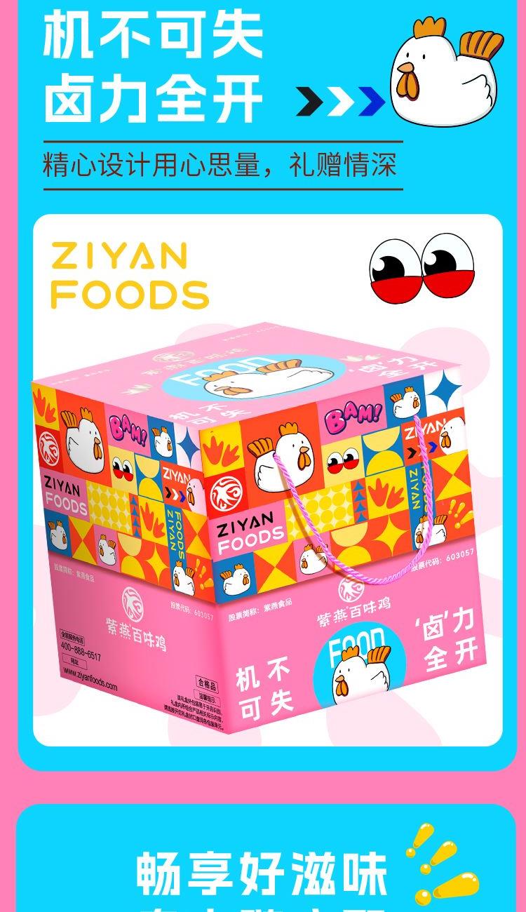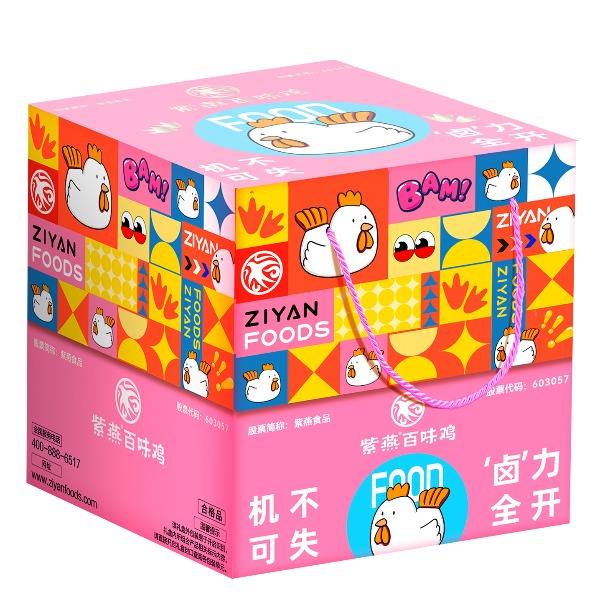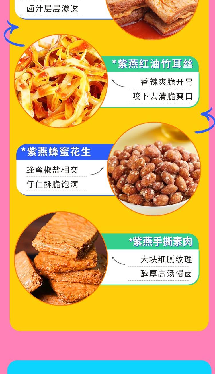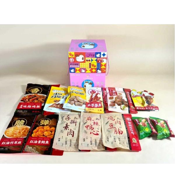 紫燕香辣吮指鸡架300g*1 紫燕川椒鸡翅尖62g*1 紫燕甜辣鸭脖60g*1 紫燕牛肉粒(五香味)60g*1 紫燕三重卤麻辣鸭心(麻辣鸭心)60g*1 紫燕孜然锁骨51g*1 紫燕虎皮凤爪(卤香味)(单只)30g*1 紫燕去骨凤爪(柠檬味)(单只)24g*1 紫燕红油竹耳丝60g*1 紫燕风味鸡肉豆腩(鸡肉豆腩香辣味)60g*1 紫燕手撕素肉60g*1 紫燕金樽素鲍(红油素鲍鱼)60g*1 紫燕蜂蜜花生(椒盐味)25g*2 礼盒+组装+外盒