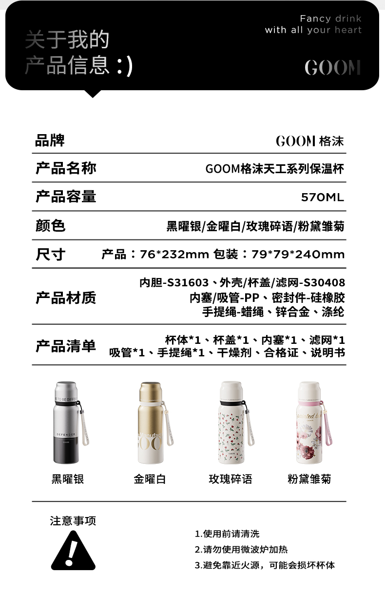 型 号:GM-25AW-B18 颜 色:黑曜银/金曜白/粉黛雏菊/玫瑰碎语 材 质:内胆—奥氏体不锈钢S31603,外壳/杯盖/滤网—奥氏体不锈钢S30408,内塞/吸管—PP聚丙烯(丙烯均聚物),密封件-硅橡胶,手提绳-蜡绳、锌合金、涤纶 容 量:570ml 1、一杯四饮:痛快敞口喝、直饮口小口防呛、精致吸管口不花妆、分享盖晾凉爱分享 2、密封防漏:360密封,安心无忧,多种场景放心畅饮 3、安心材质:食品级316内胆、长效锁温锁冷 4、黄金容量:570ml贴心续航,满足日常饮水需求! 5、便携随行:素雅提绳,点睛自然气息,携带轻松,外出便捷。