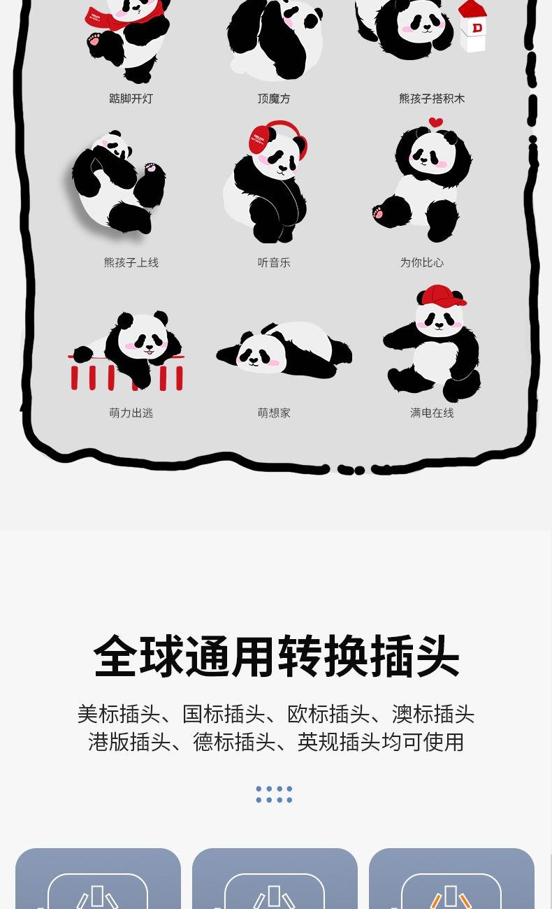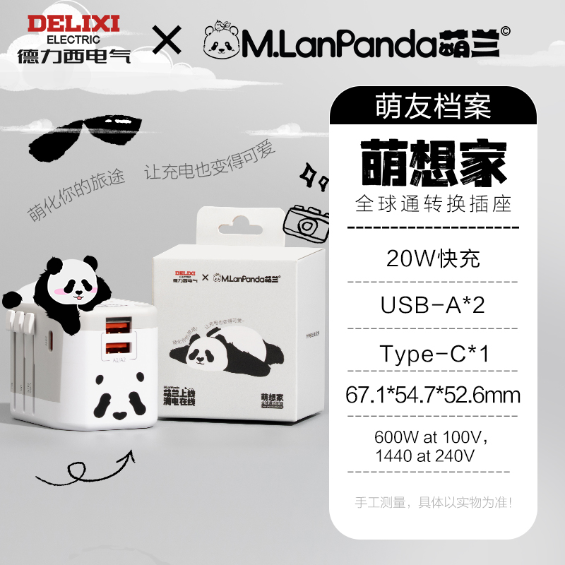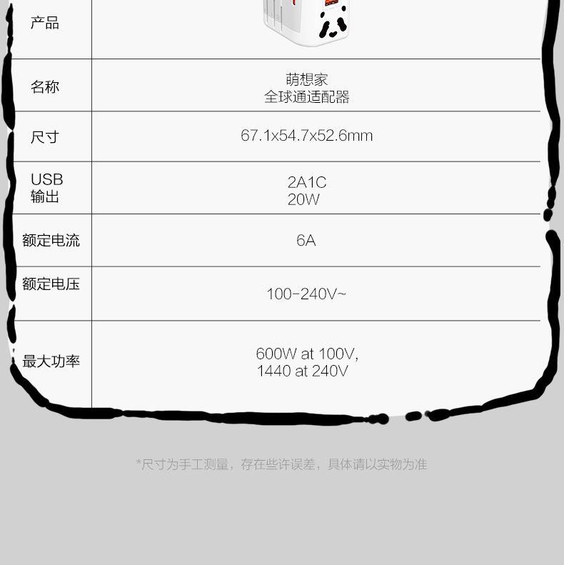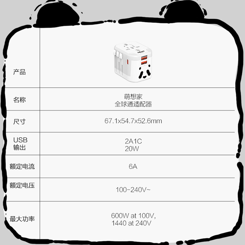 20W,2A1C口, 灰白色,萌想家,55*65*70mm*139g 产品型号:CD98-SPQ(HE) 20W/B ML 产品尺寸:54.7*52.6*67.1mm 产品材质:PC+ABS 阻燃材料 额定保险丝:6A USB-C输出:5.0V 3A ,9V 2.22A,12V 1.67A USB-A输出:5.0V 3A ,9V 2.22A,12V 1.67A 功率:600W at 100V~,1440W at 240V~ 产品位数:2USB、1type-c、一位二孔、一位三孔、欧标、英标、美标、澳标、无线