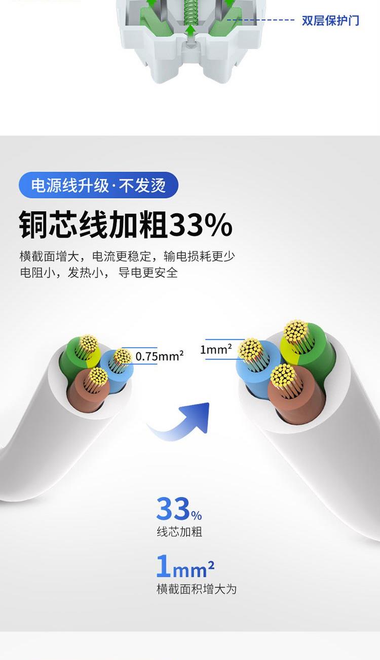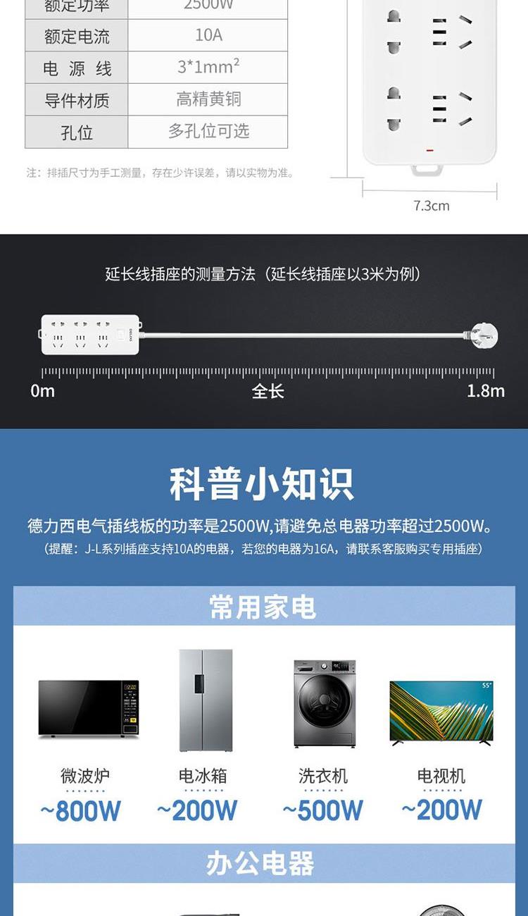 产品型号:CD98J-LK3X3Z 1.8 产品尺寸:186*73*30mm 适用标准 :国标 额定电流:10A 产品重量:0.3kg 额定电压:250V 产品全长:1.8m 产品开关:总控开关 产品位数:总控、三位五孔+三位二孔、有线