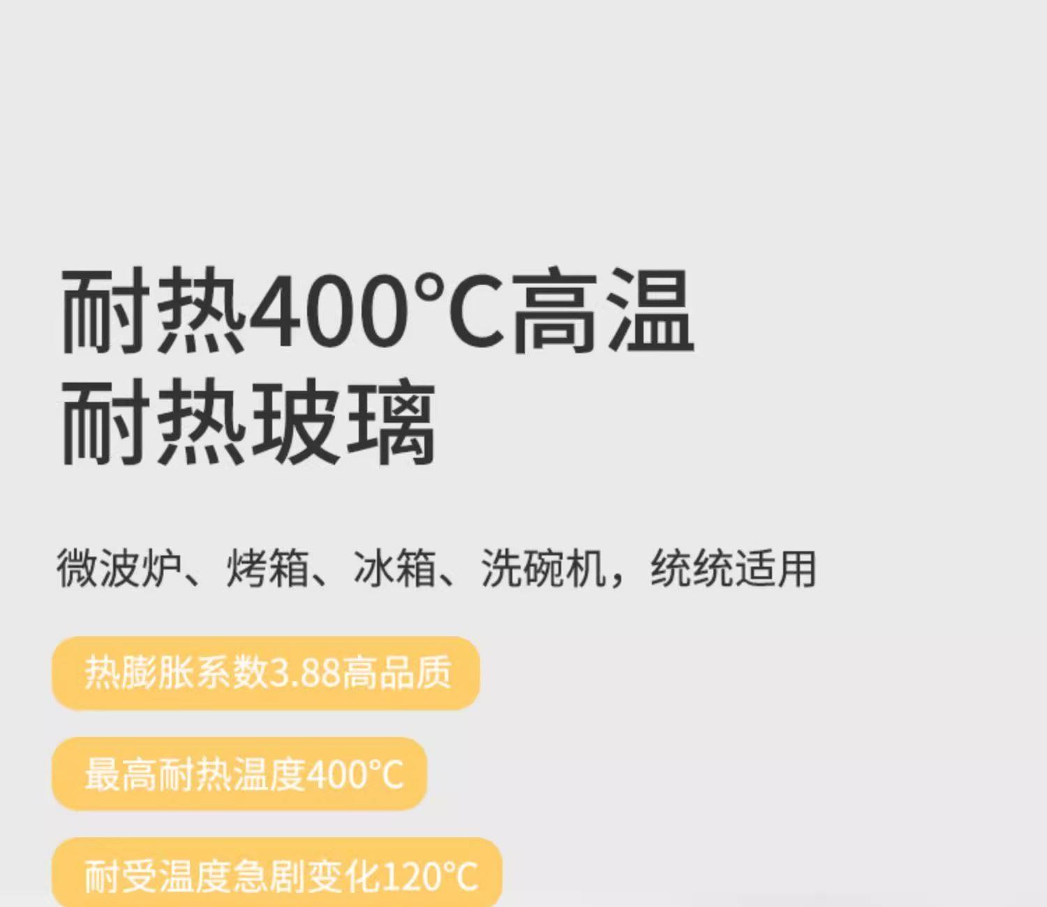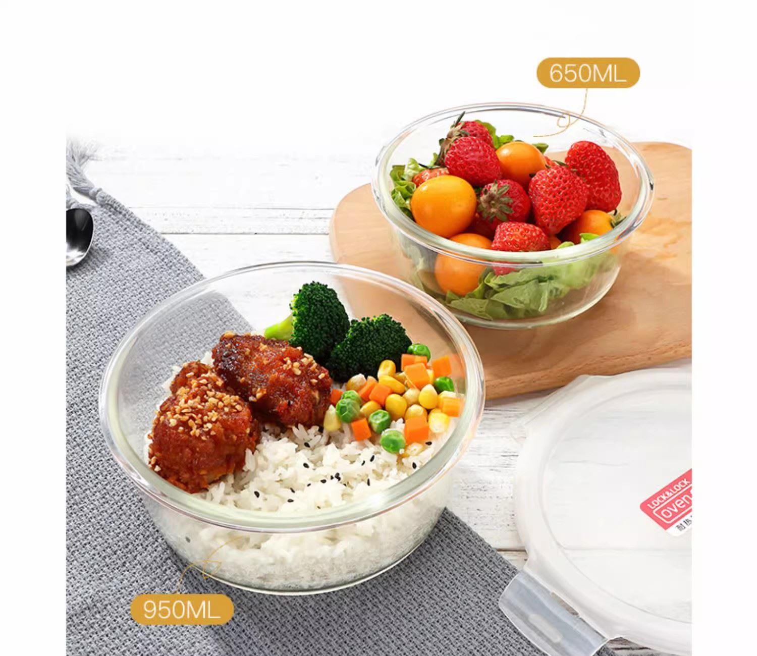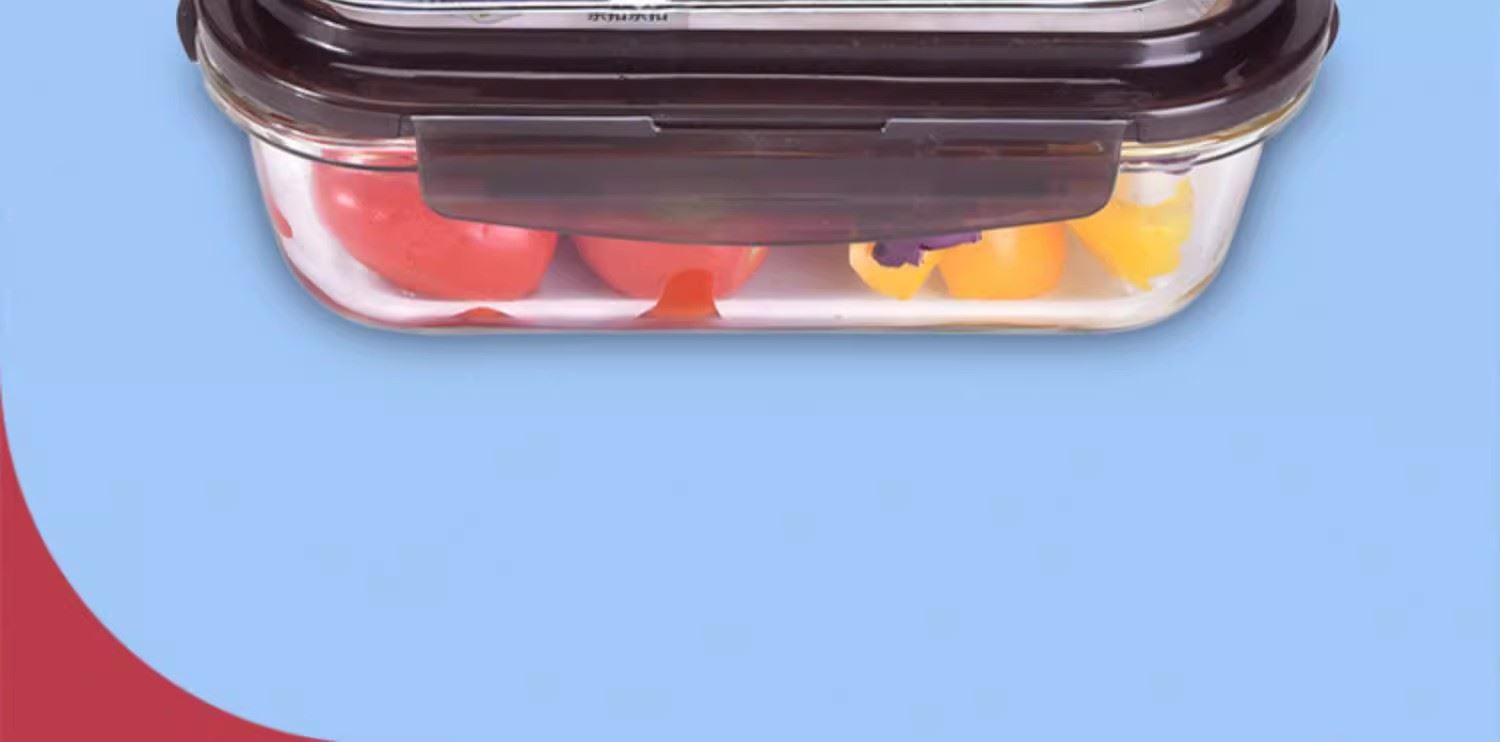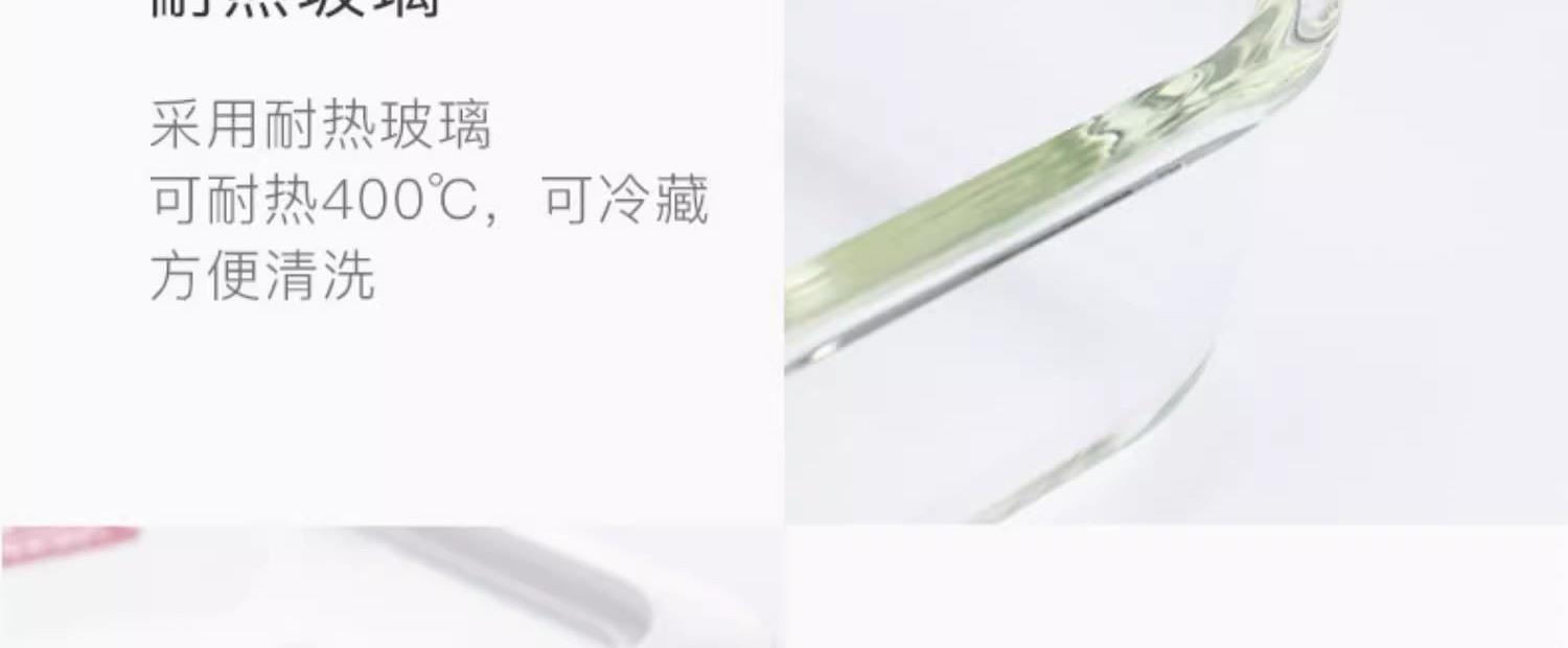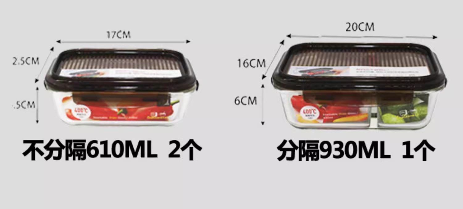产品特点: 耐热400℃高温,耐热玻璃 适用于微波炉、烤箱、冰箱、洗碗机 弯曲扣盖,经久耐用 长久保鲜,四面锁扣,密封性好,有效防止水分流失.