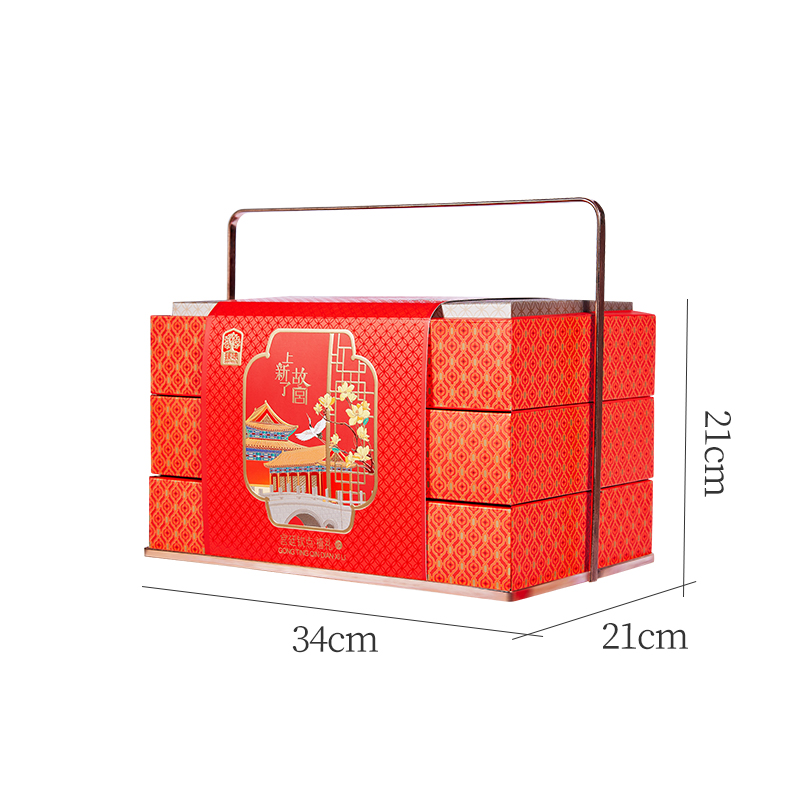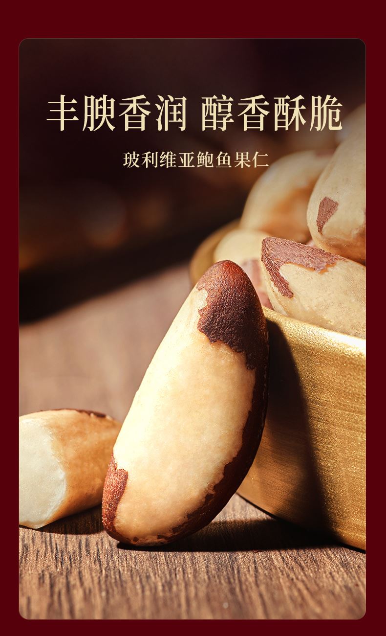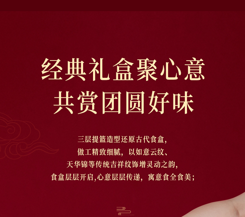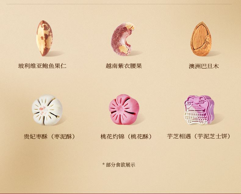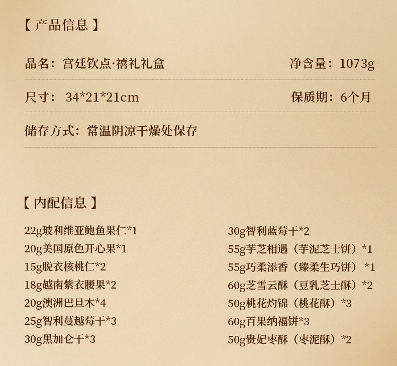 22g玻利维亚鲍鱼果仁*1 20g美国原色开心果*1 15g脱衣核桃仁*2 18g越南紫衣腰果*2 20g澳洲巴旦木*4 25g智利蔓越莓干*3 30g黑加仑干*3 30g智利蓝莓干*2 55g芋芝相遇(芋泥芝士饼)*1 55g啡韵添香(炭烧咖啡饼)*1 60g芝雪云酥(豆乳芝士酥)*2 50g桃花灼锦(桃花酥)*3 60g百果纳福饼*3 50g贵妃枣酥(枣泥酥)*2 三层提篮造型还原古代食盒,做工精致细腻,以如意云纹、天华锦等传统吉祥纹饰增灵动之韵,食盒层层开启,心意层层传递,寓意食全食美; 净含量:1073g,内含5种坚果、3种果干、6款糕点,内配+礼盒承载着浓浓的祝福,可收纳珠宝首饰、珠串文玩,赏用华贵之至。
