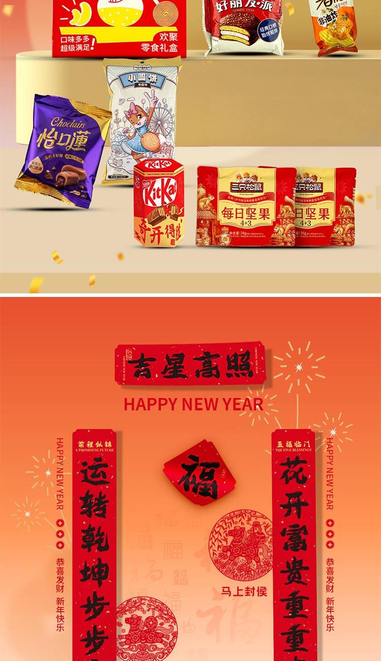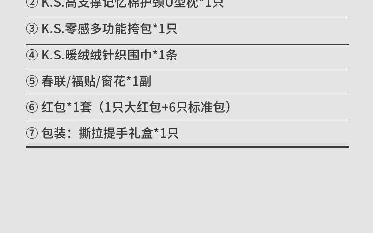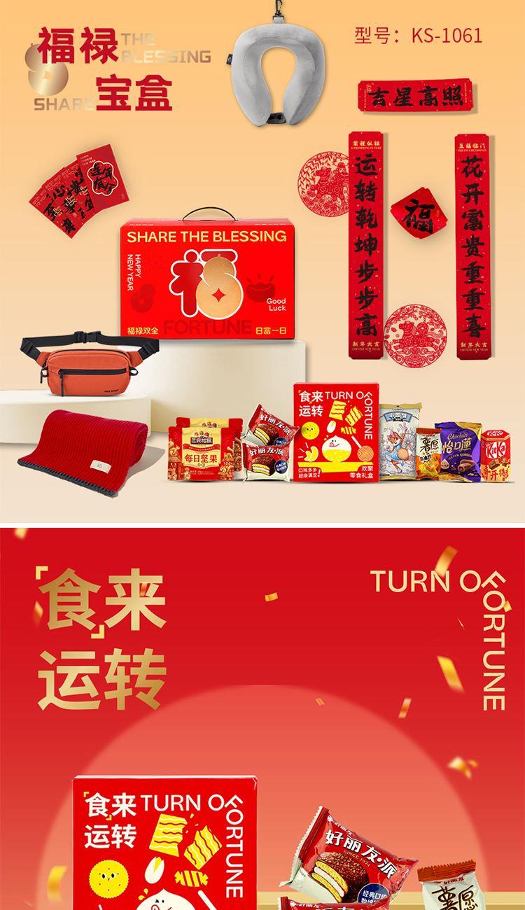 精选传统年味春联、红包、窗花与零食礼盒构成经典组合,并搭配实用好物(针织围巾、斜挎包、U型枕),支持产品替换,灵活自由。