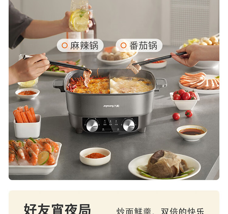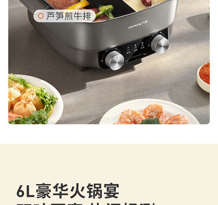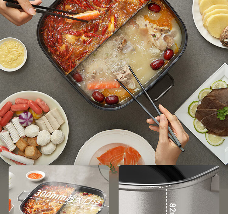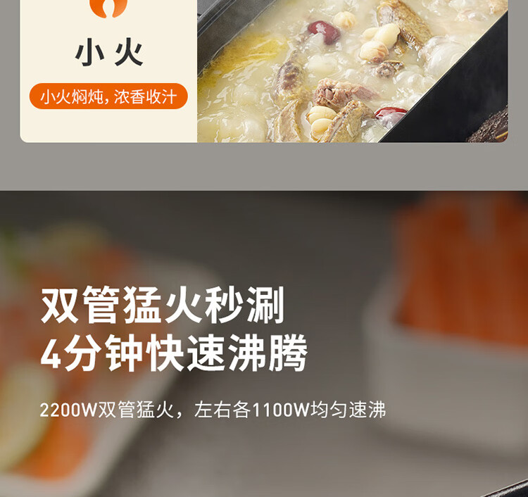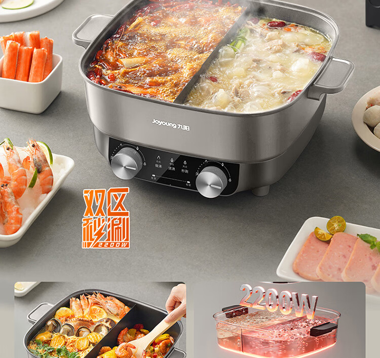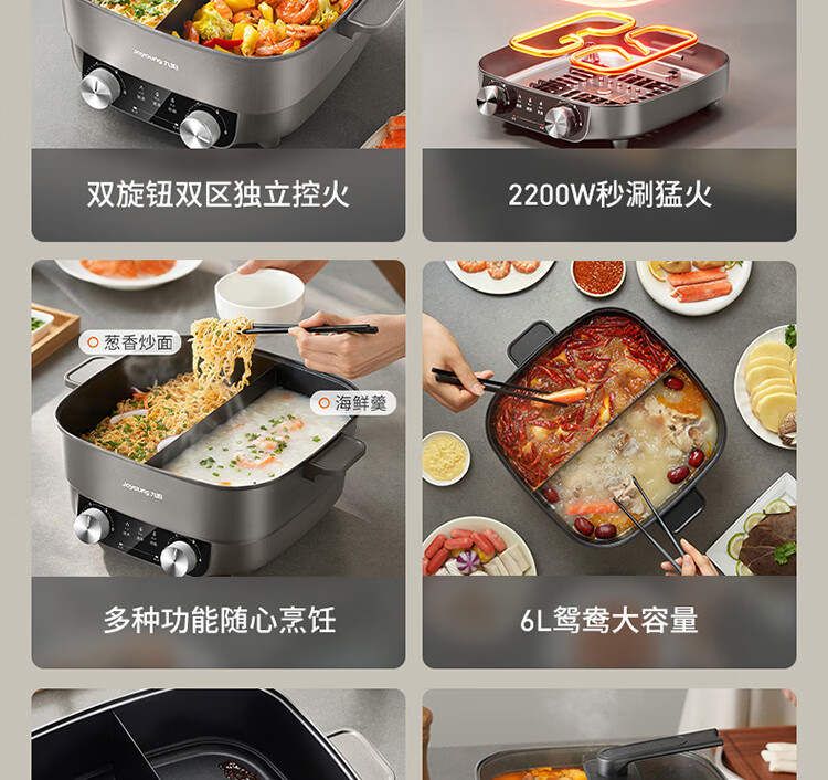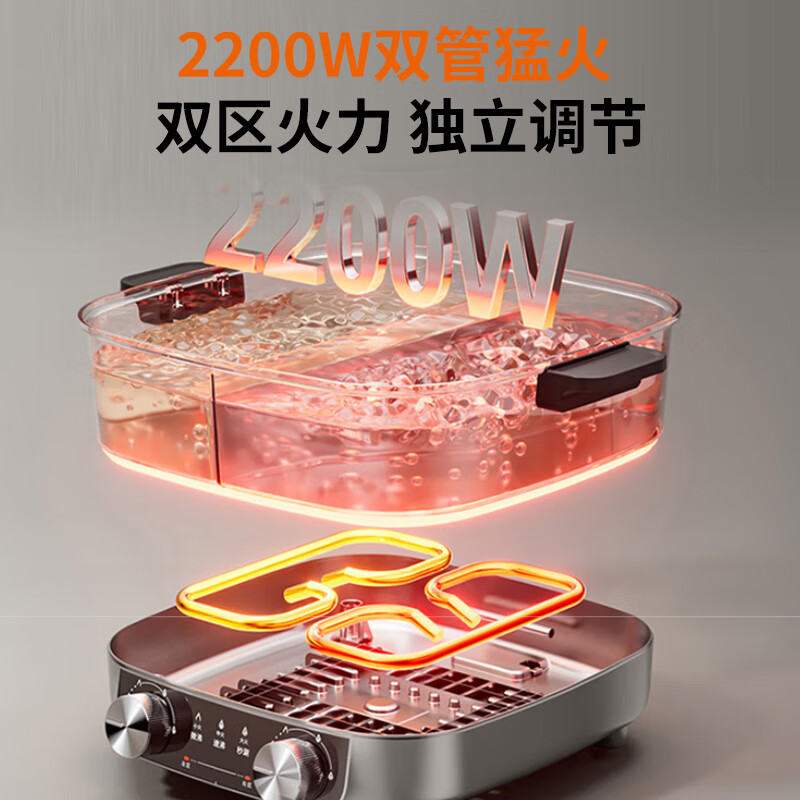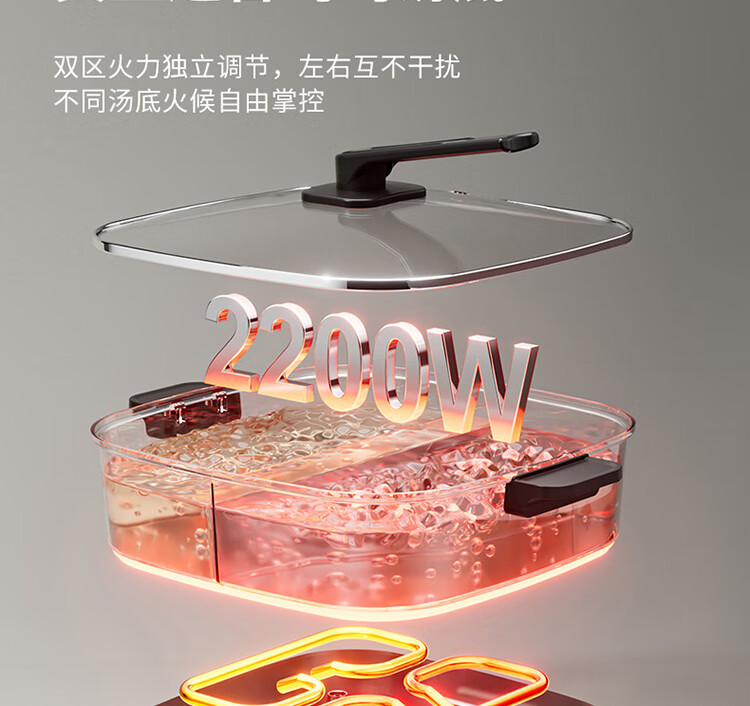 82mm锅身 6L大容量 不粘易清洗 2200W大功率 双旋扭功能:双区秒涮