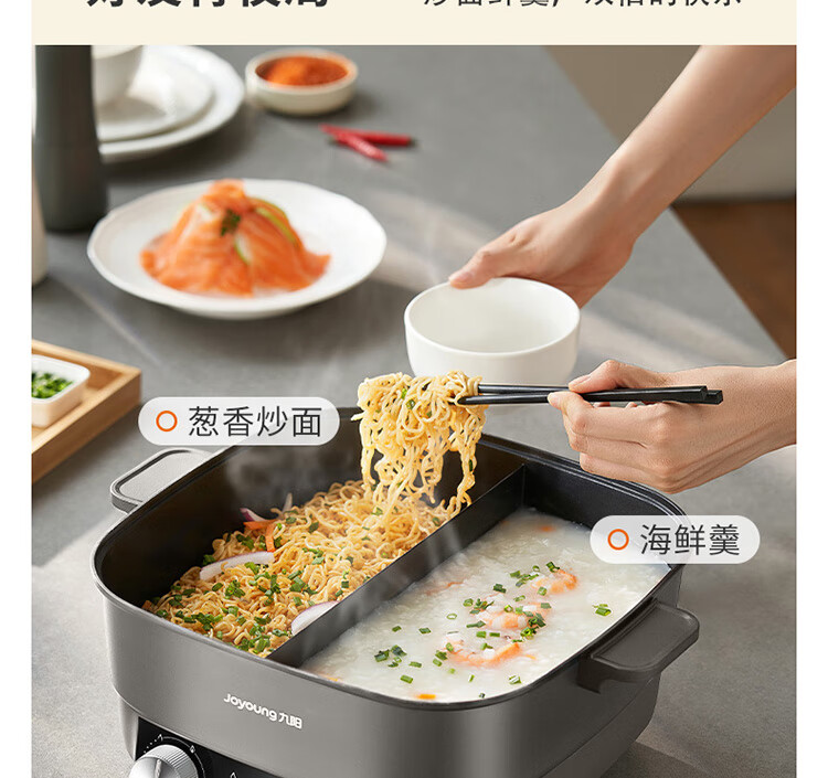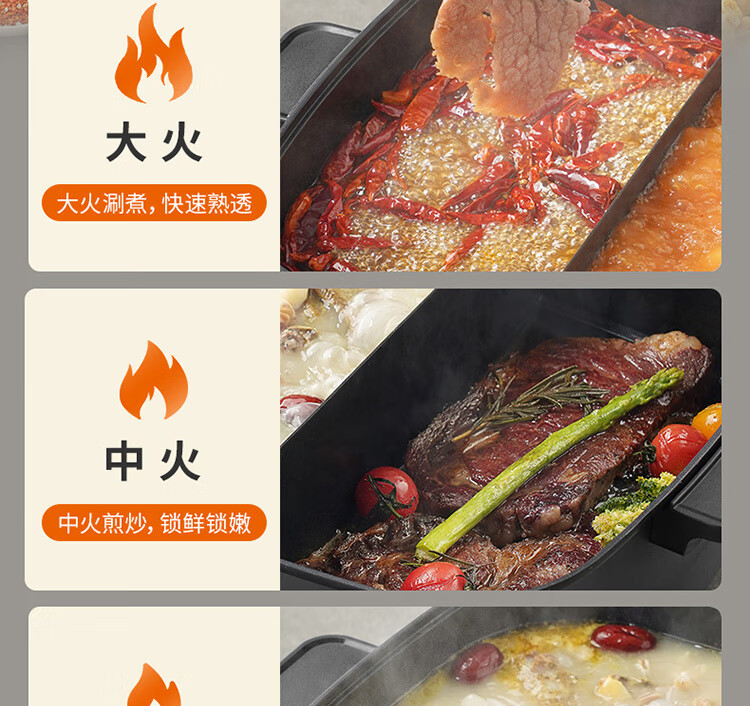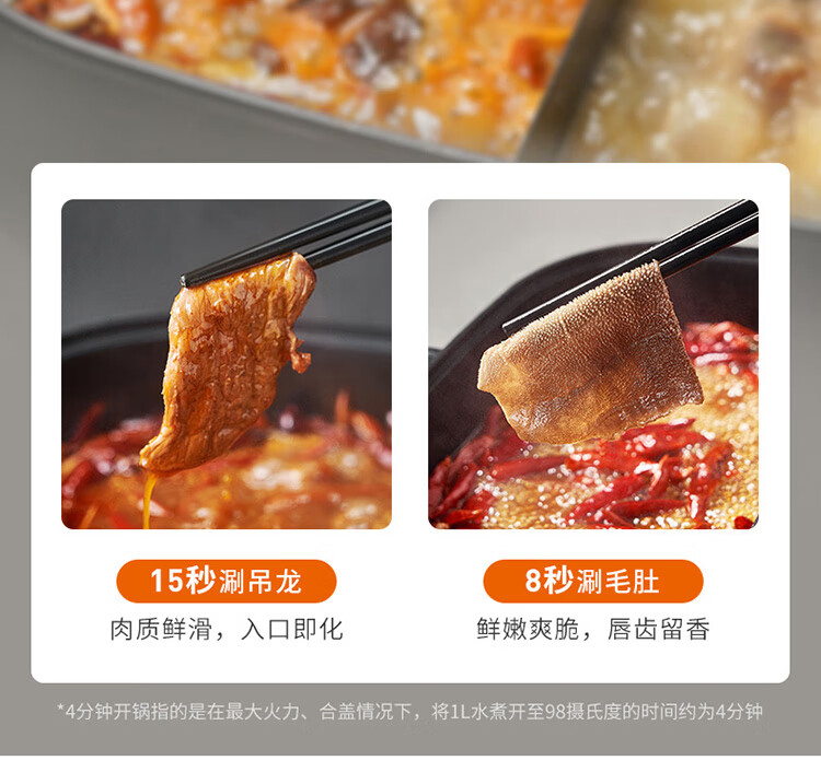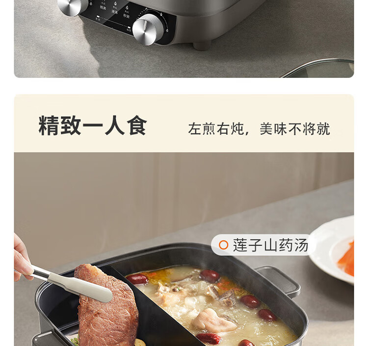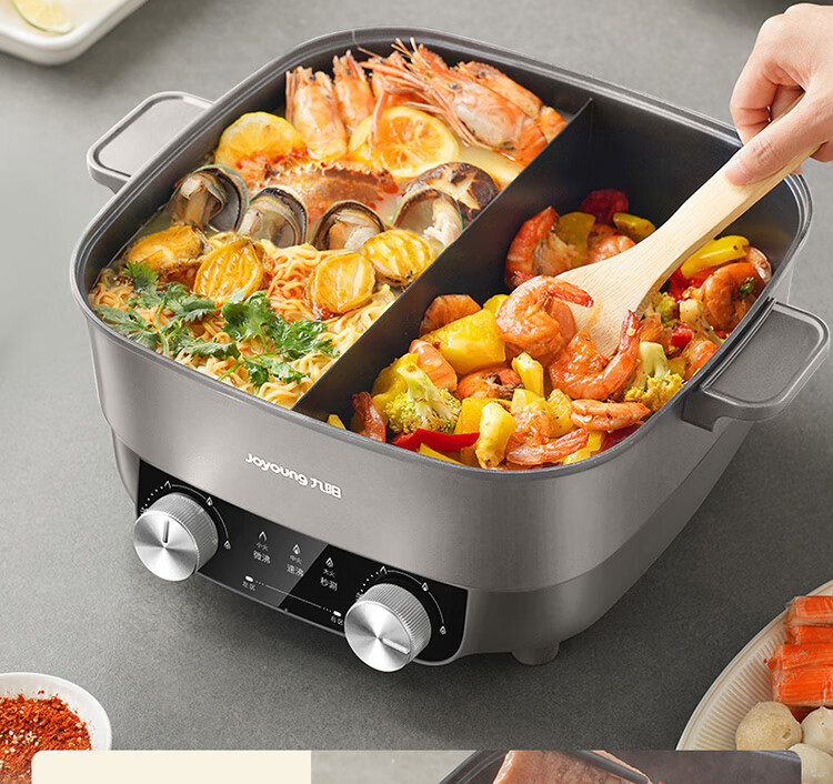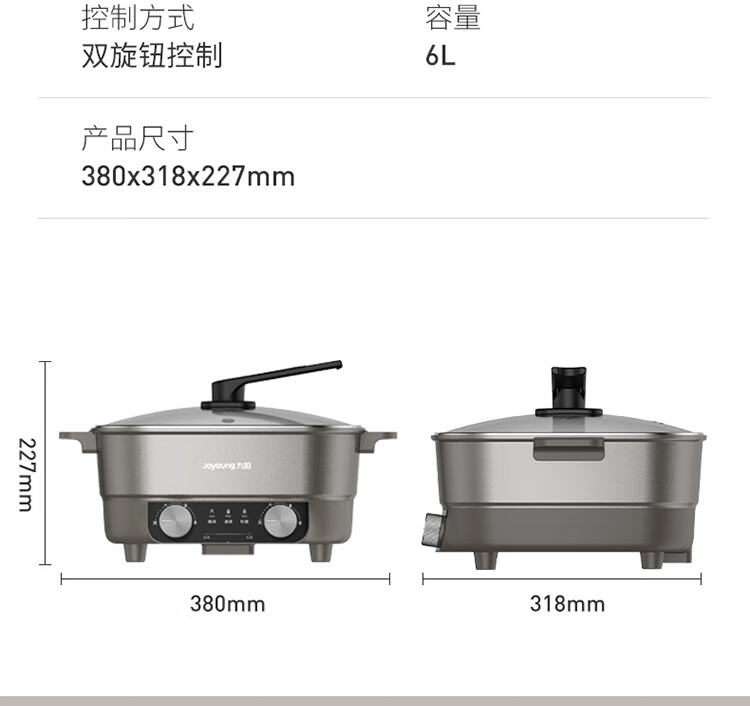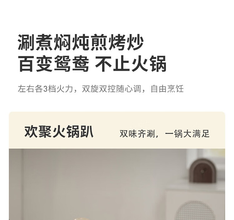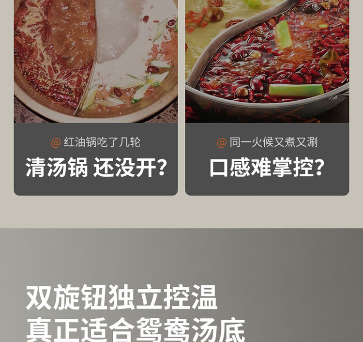 82mm锅身 6L大容量 不粘易清洗 2200W大功率 双旋扭功能:双区秒涮