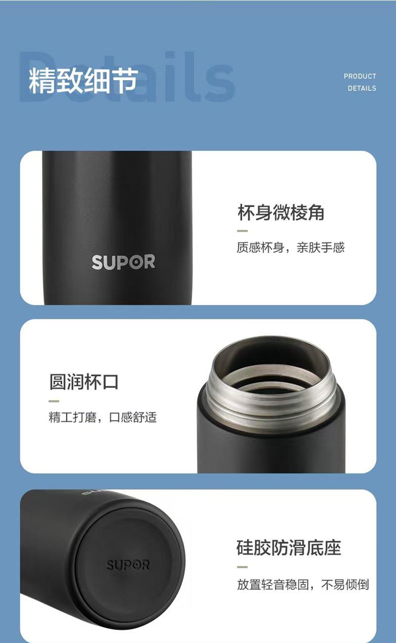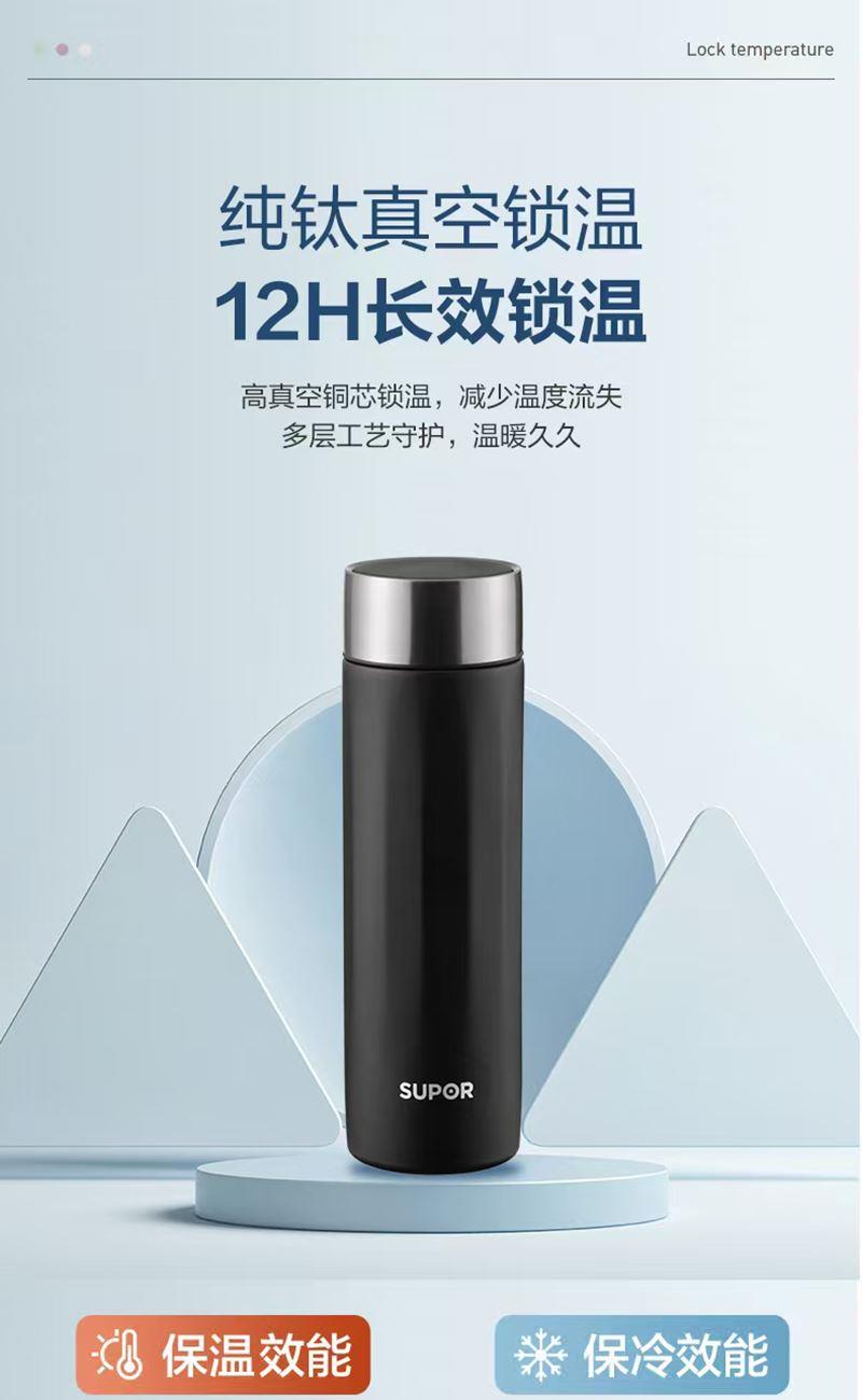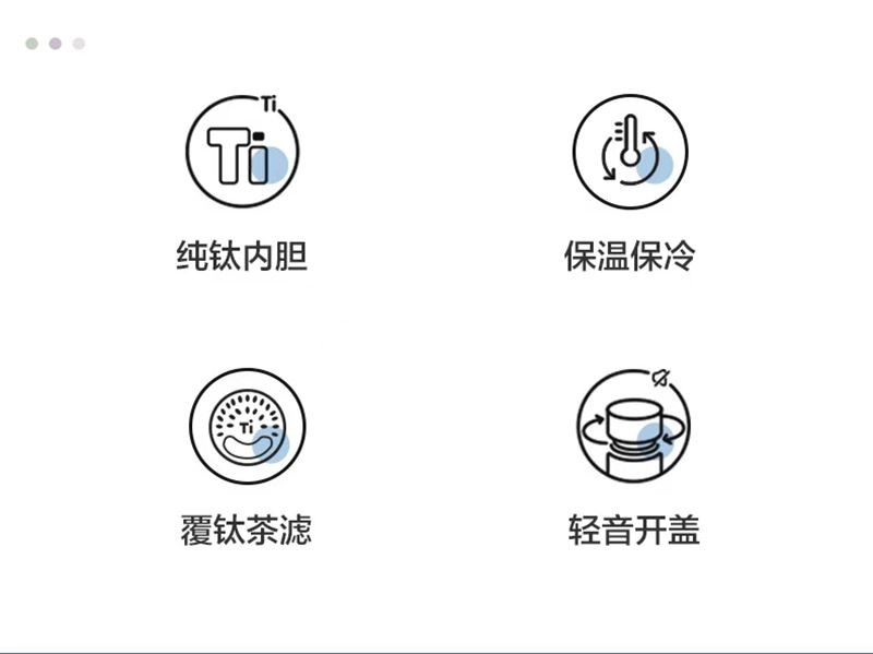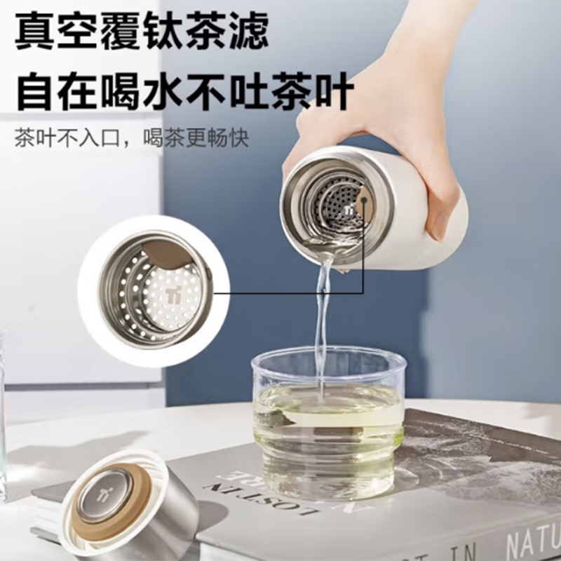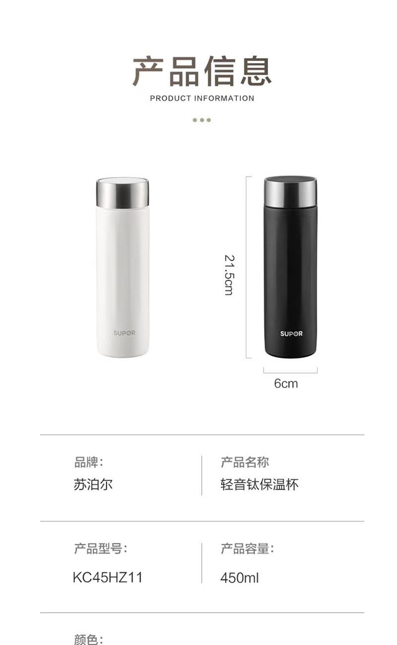 容量(L) 450ML 材质 钛 规格参数 产品说明 颜色:珠光白.曜石黑 商品毛重(kg):0.354kg 功能卖点 1、316L不锈钢,耐磨耐用耐腐蚀 2、饮口轻松拆卸,清洗更便捷 3、轻音杯垫,摆放轻音,不易倒 4、密封设计,倒置不漏