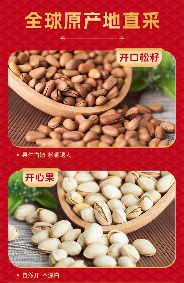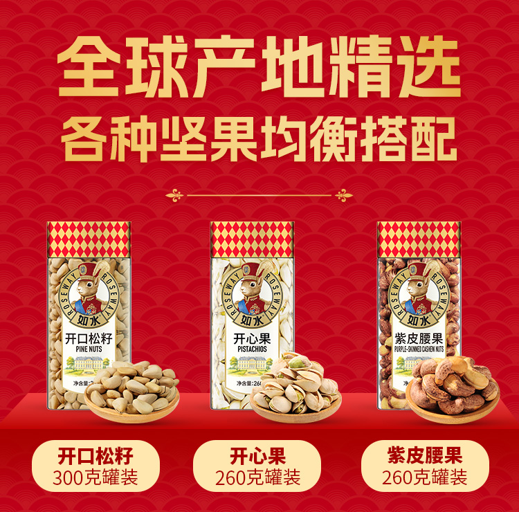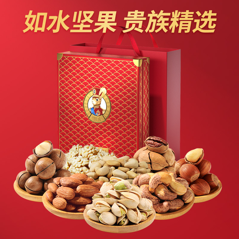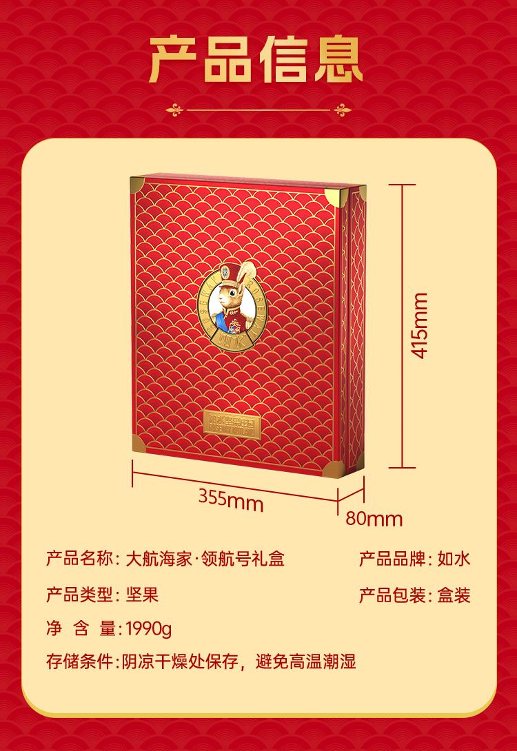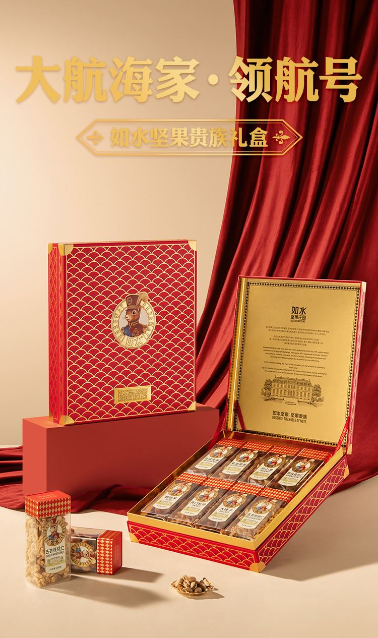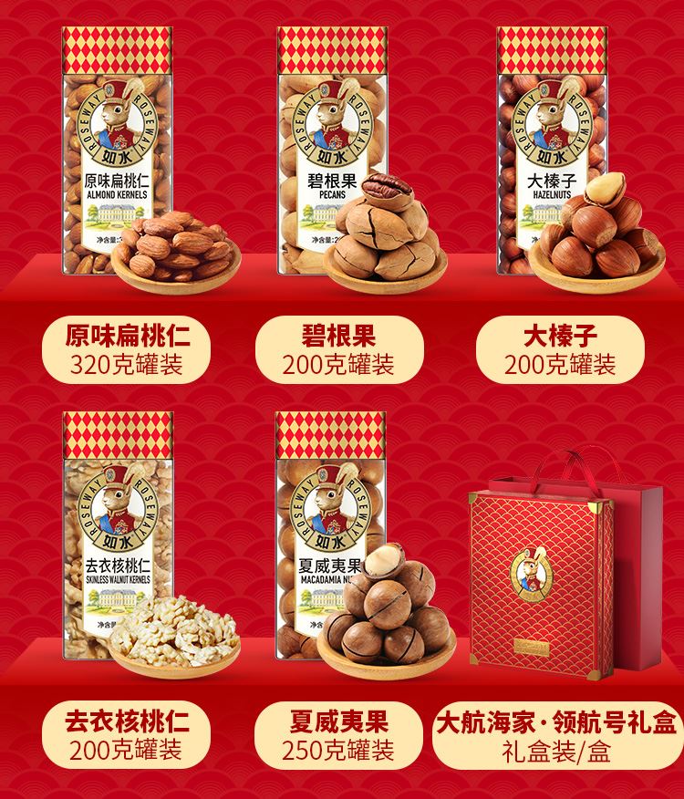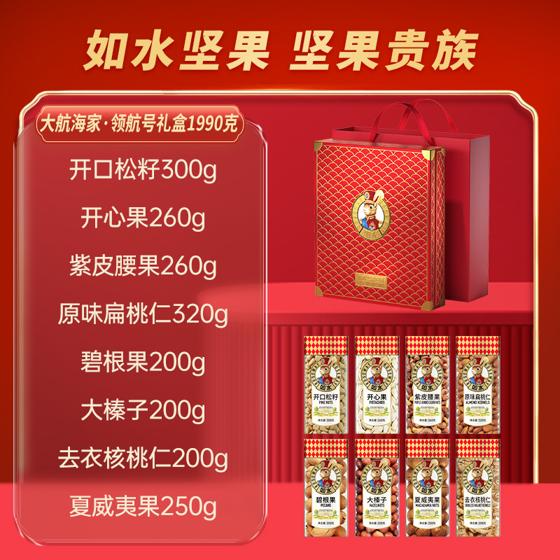 如水大航海家·领航号礼盒 净含量:1990g 如水开口松籽300g 如水开心果260g 如水紫皮腰果260g 如水原味扁桃仁320g 如水碧根果200g 如水大榛子200g 如水去衣核桃仁200g 如水夏威夷果250g