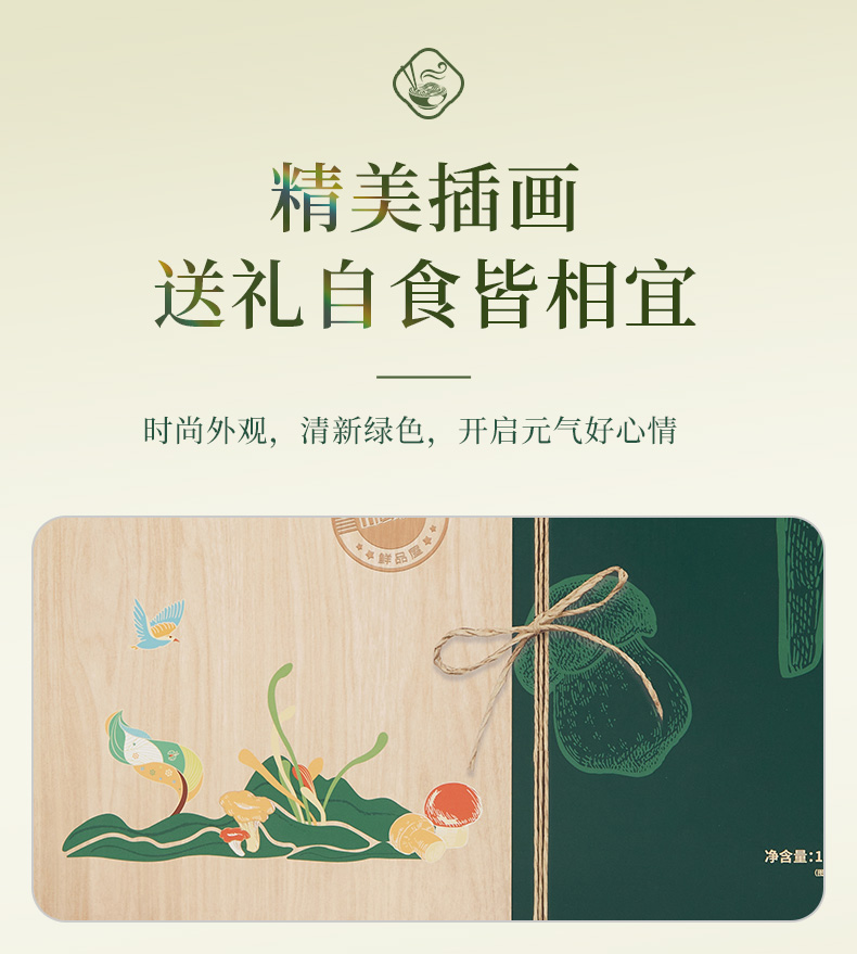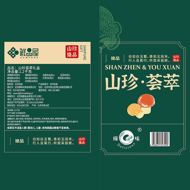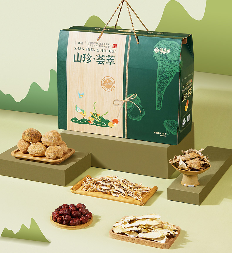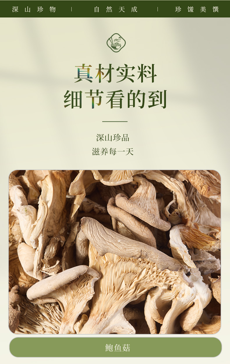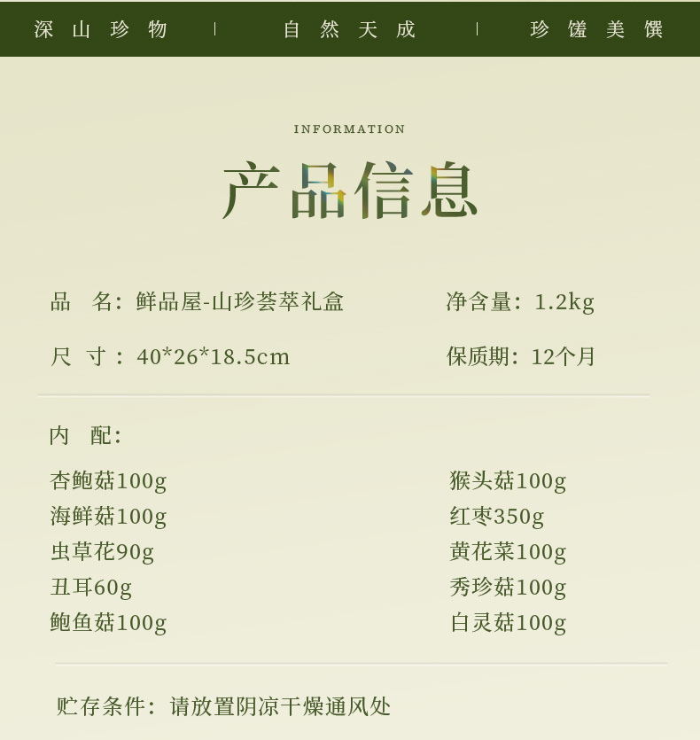 杏鲍菇100g 海鲜菇100g 虫草花90g 丑耳60g 鲍鱼菇100g 猴头菇100g 红枣350g 黄花菜100g 秀珍菇100g 白灵菇100g