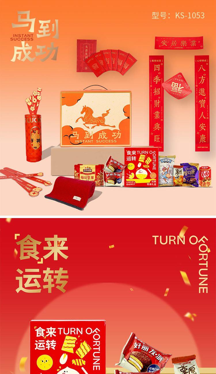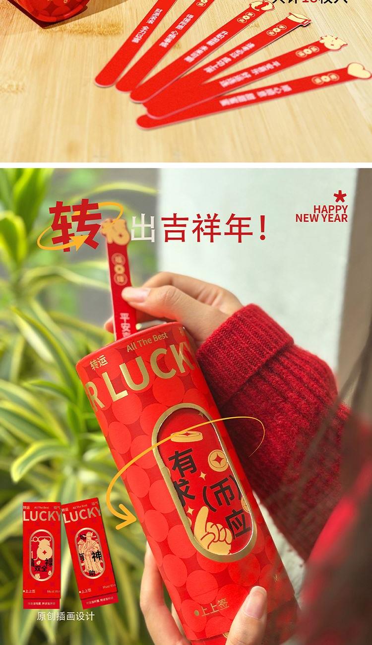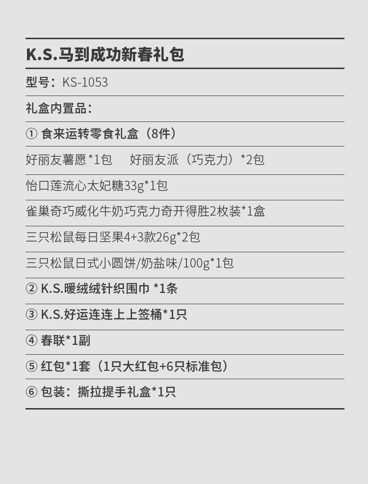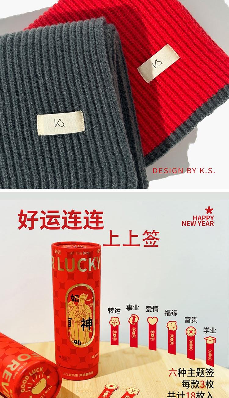 内含经典春联红包套装,零食礼盒、求签桶、针织围巾。