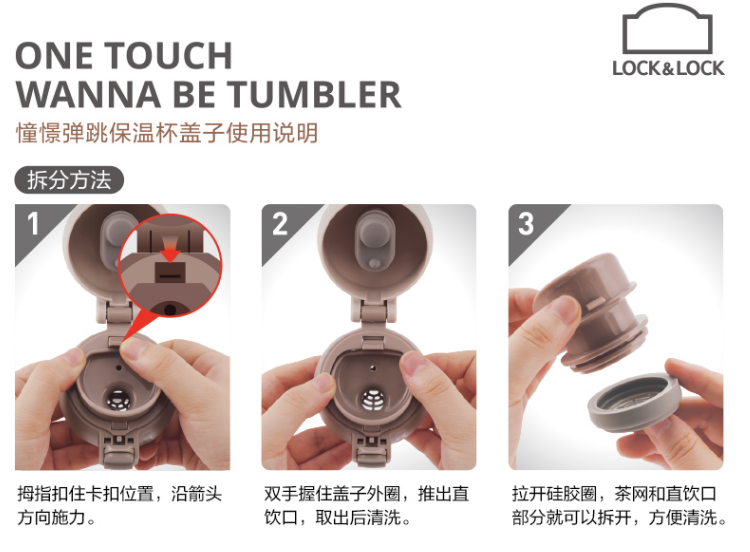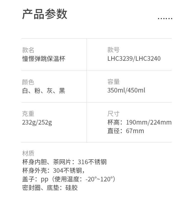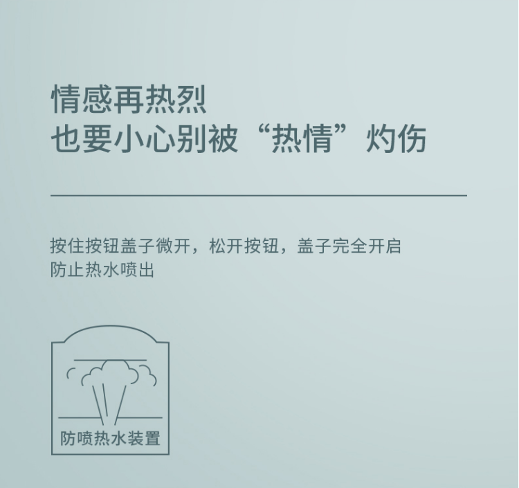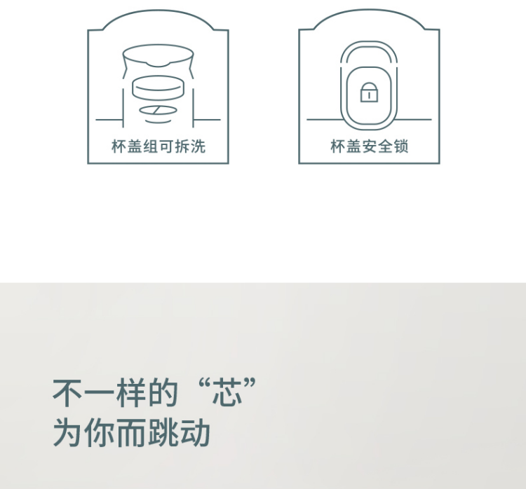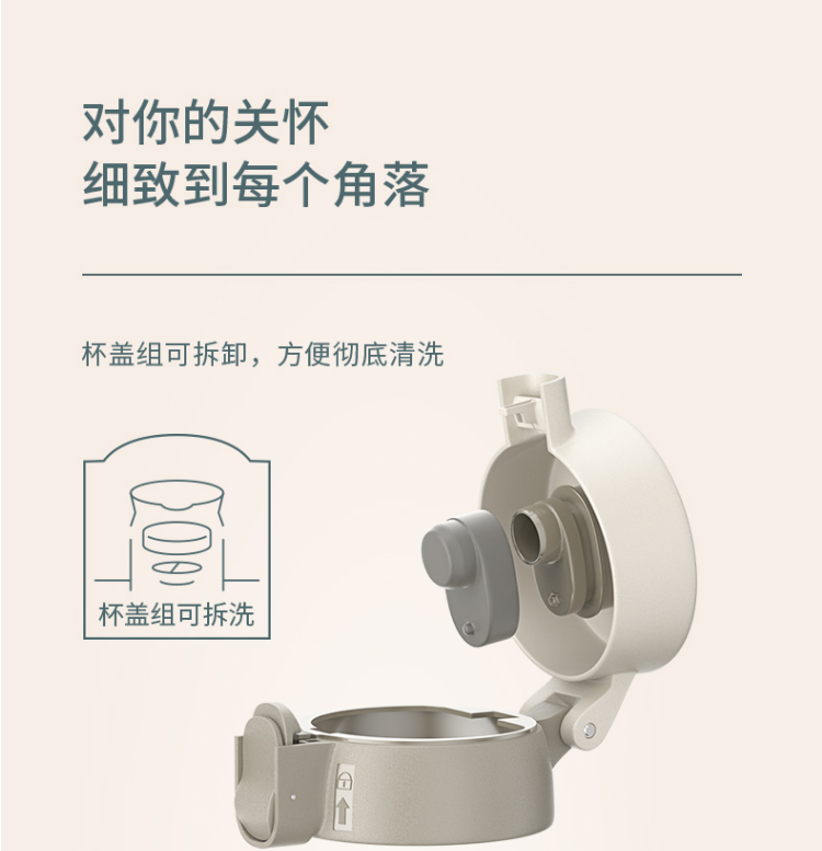 产品特点: 杯盖组可拆卸,方便清洗。 杯盖有安全锁,防止不小心按压开关而导致水流出 一键式开启,设有防喷热水装置,安全贴心 容量:450毫升