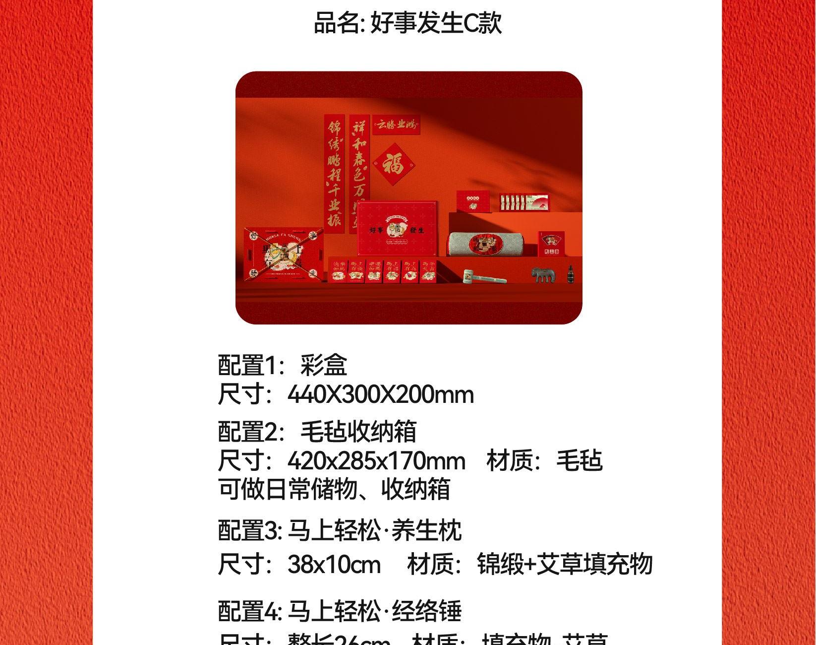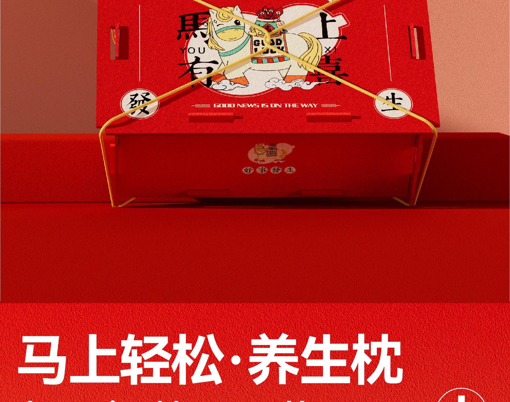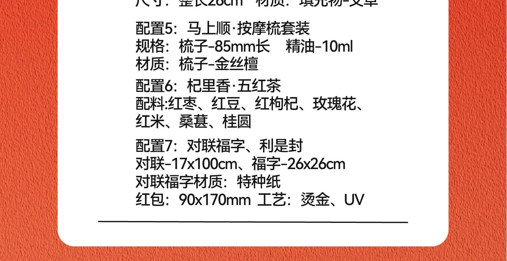 礼盒配置 提盒x1、毛毡收纳箱x1 马上轻松·养生枕x1 马上轻松·经络锤x1 马上顺·金丝檀按摩梳x1 杞里香五红茶 x6包 精油x1、对联福字x1 红包x6、贺卡x1