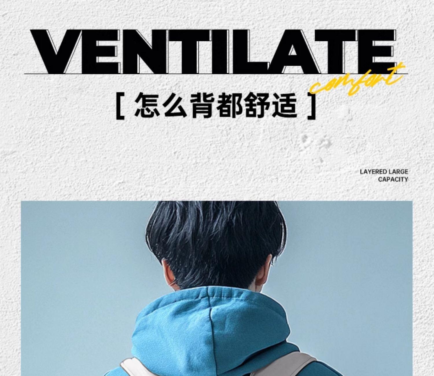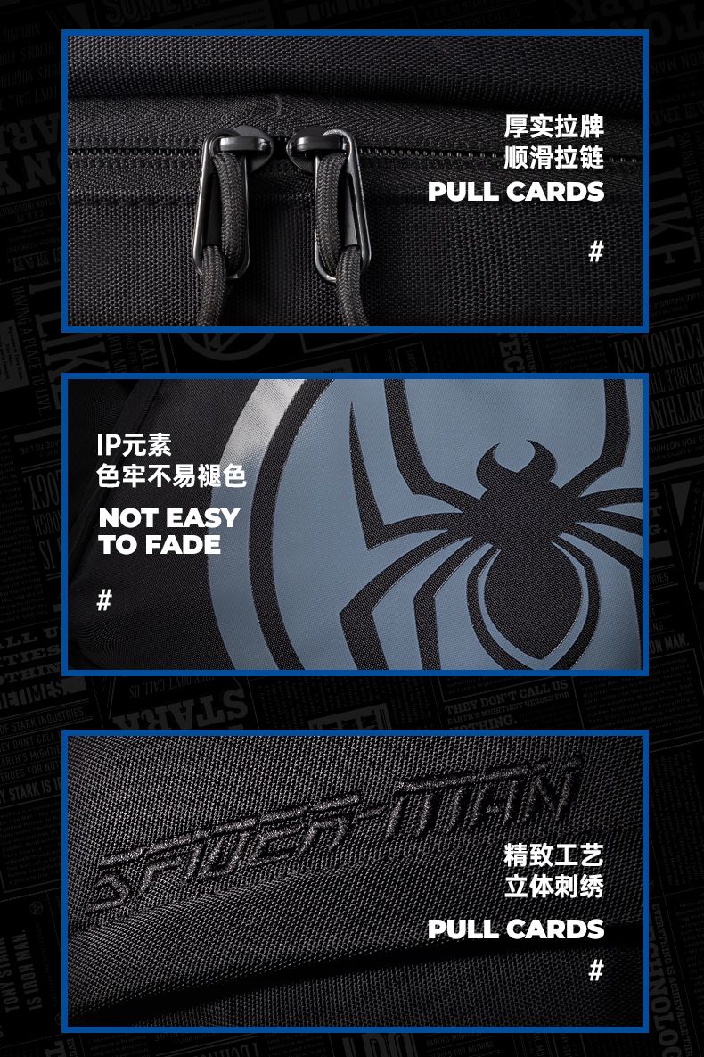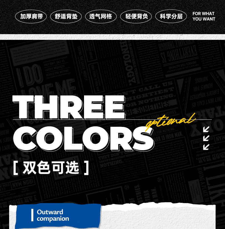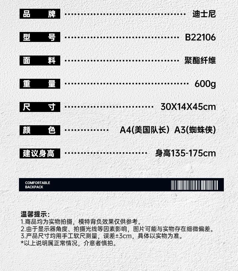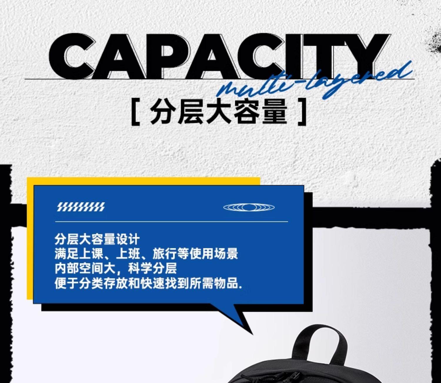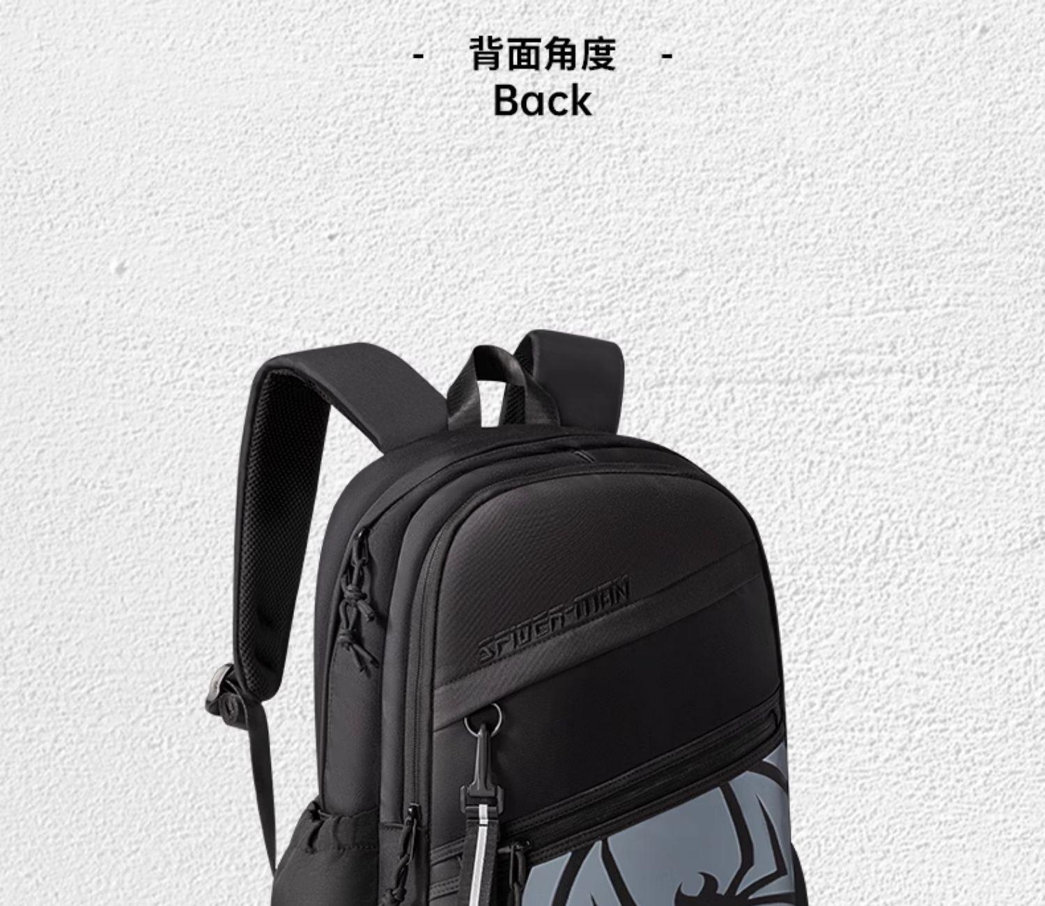 材质:聚酯纤维 尺寸:30*14*45CM 建议身高:135-175cm 卖点: ①分层大容量设计满足,内部空间大,科学分层便于分类存放和快速找到所需物品 ②加厚肩带、舒适背垫、透气网格、轻便背负、科学分层 ③防泼水 更耐脏 ④厚实拉牌顺滑拉链、IP元素色牢不易褪色、精致工艺立体刺绣 ⑤独特的材料拼接设计赋予它一种沉稳、低调而又时尚的气质能够展现使用者的个性和品味