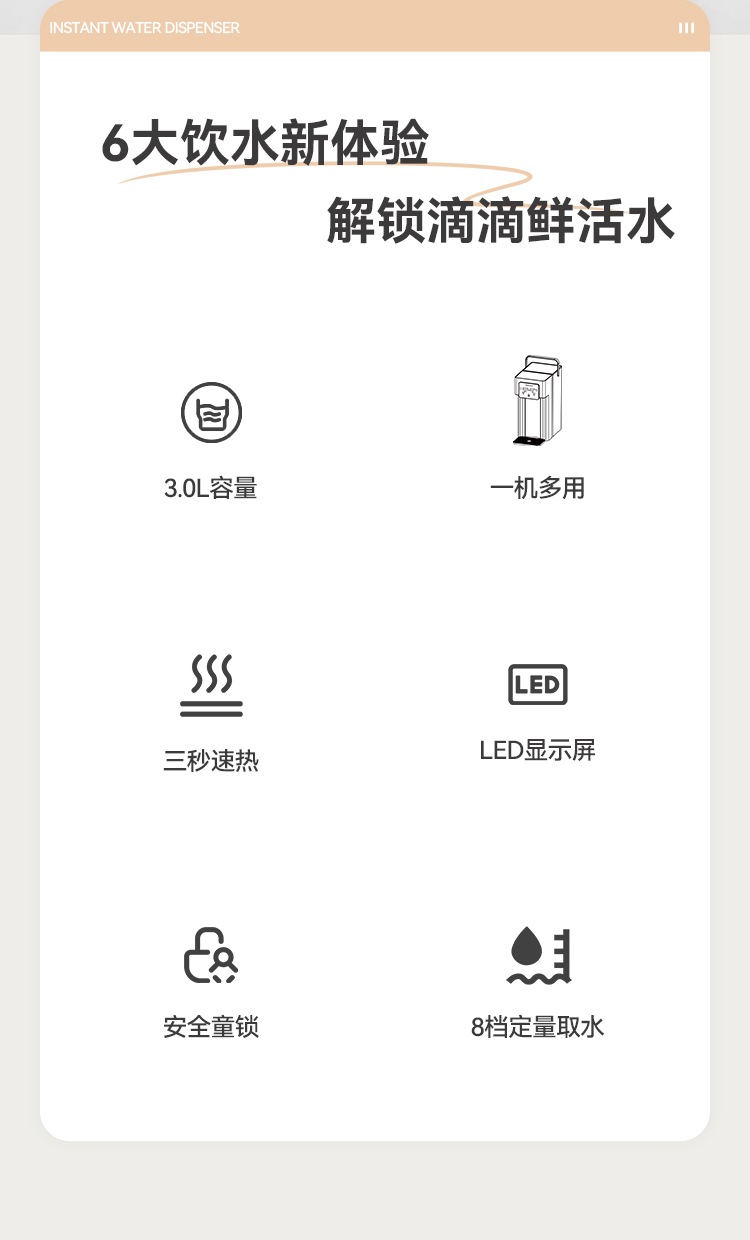 ◁3秒速热,即开即饮,智能化可调加热温度,满足多种冲泡需求