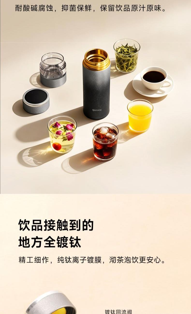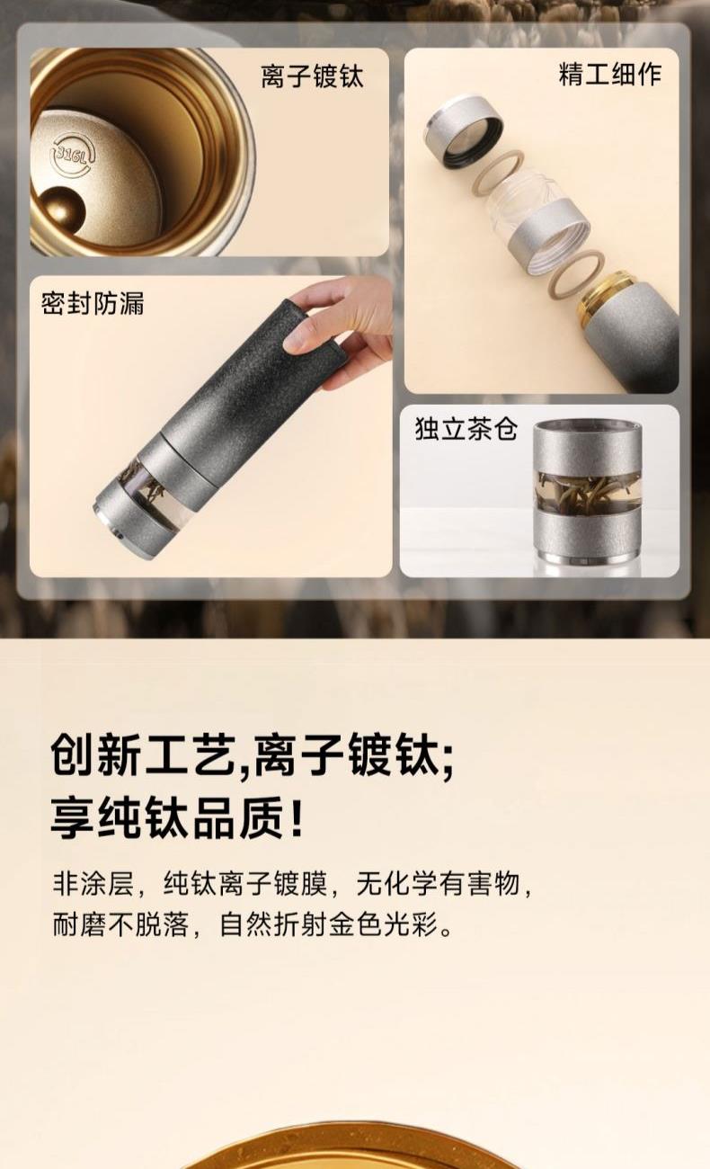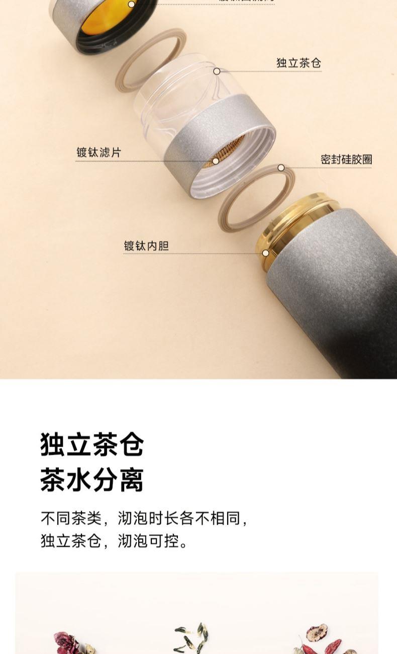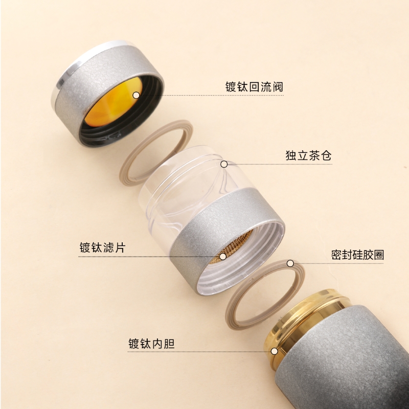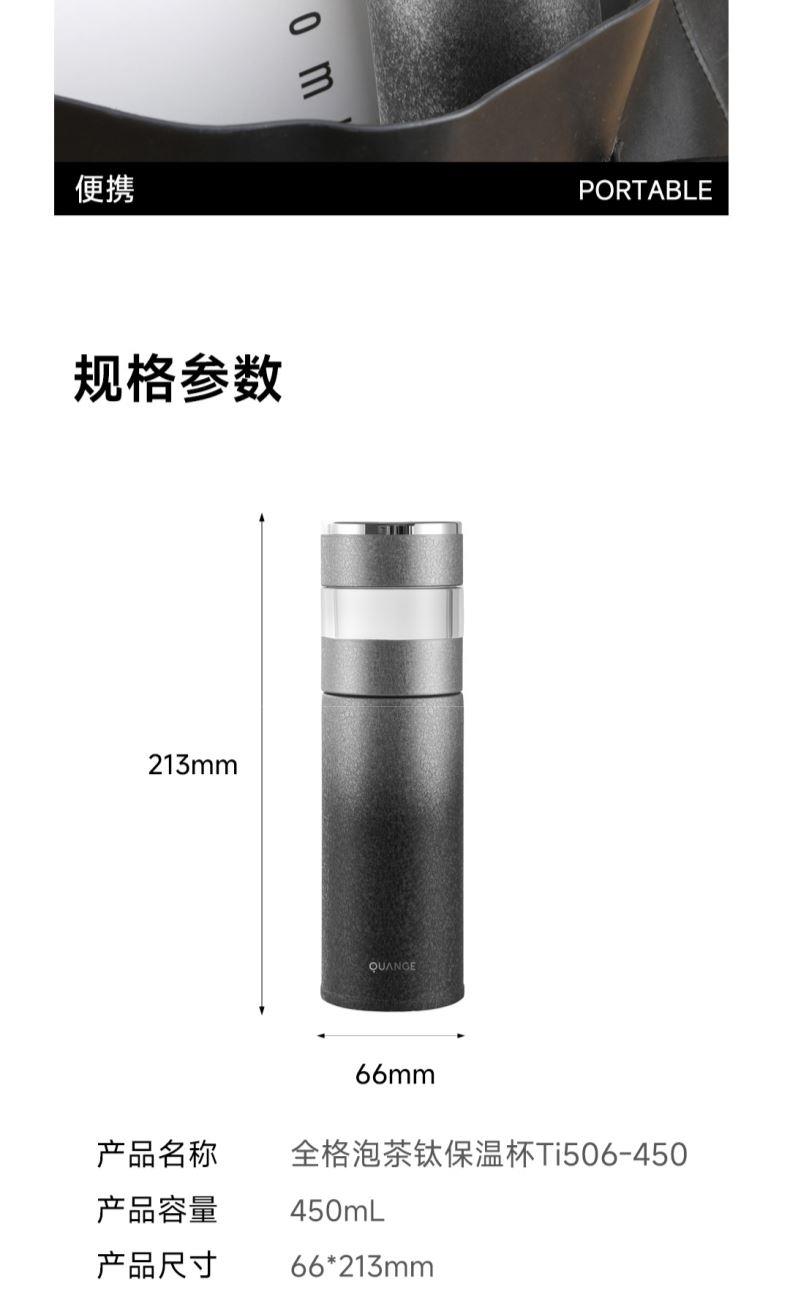 颜色:银黑 容量:450ml 材质:内胆SUS304+钛TA1(镀钛);杯盖:SUS304,茶仓塑料件:AS,杯盖:PP,密封圈:硅橡胶 配置:独立茶仓,温度显示产品尺寸:φ66*213mm 包装:彩盒,70*70*235mm 1、450ml,内胆,茶滤及内塞盖为镀钛,安心看的见 2、独立茶仓,温度显示