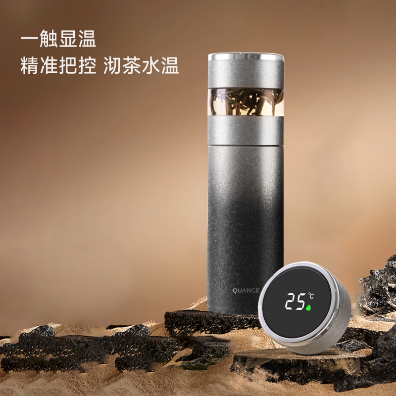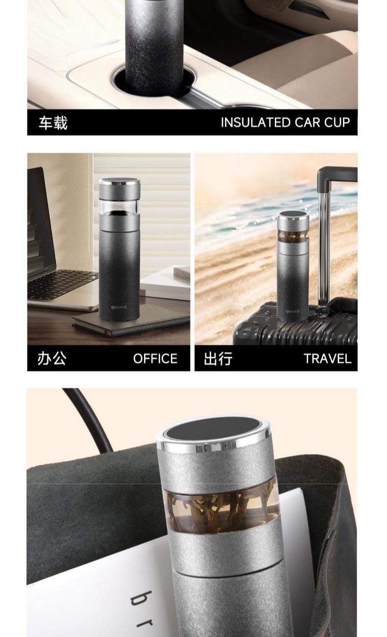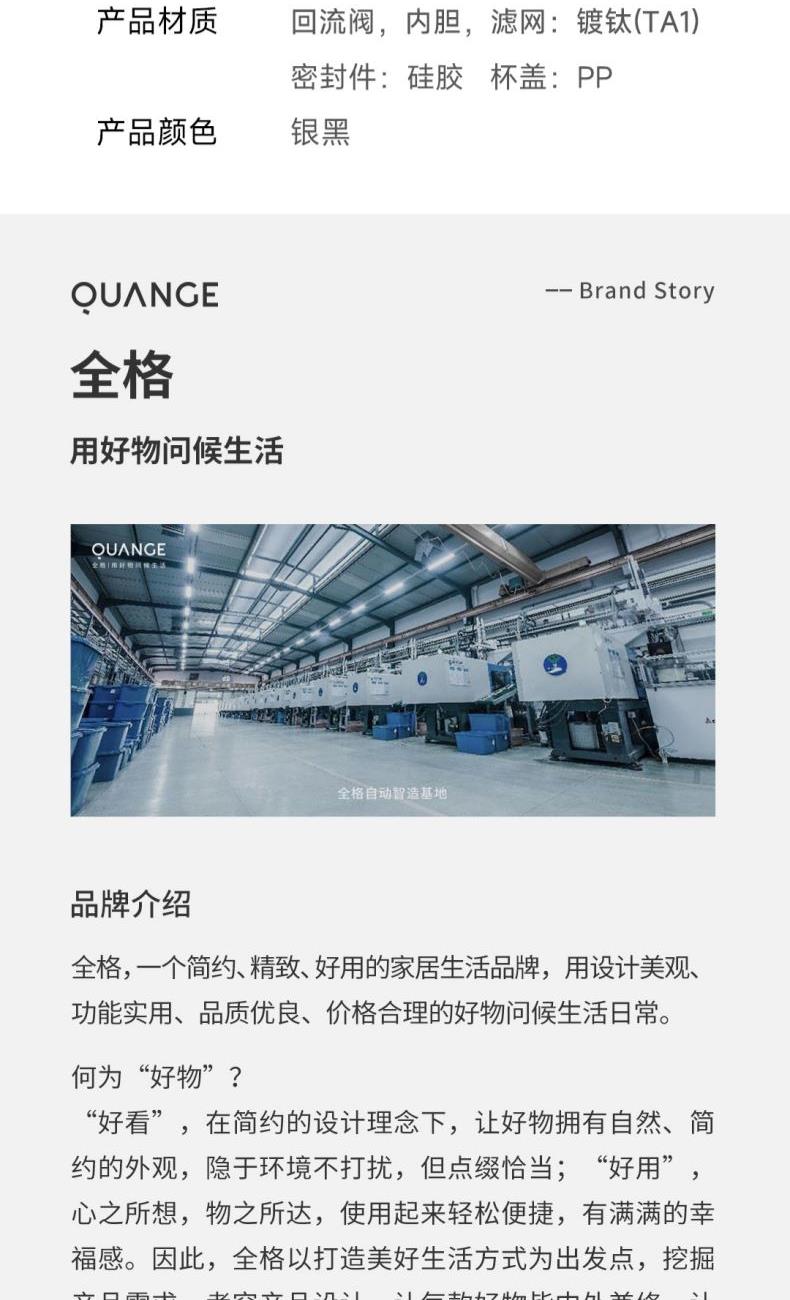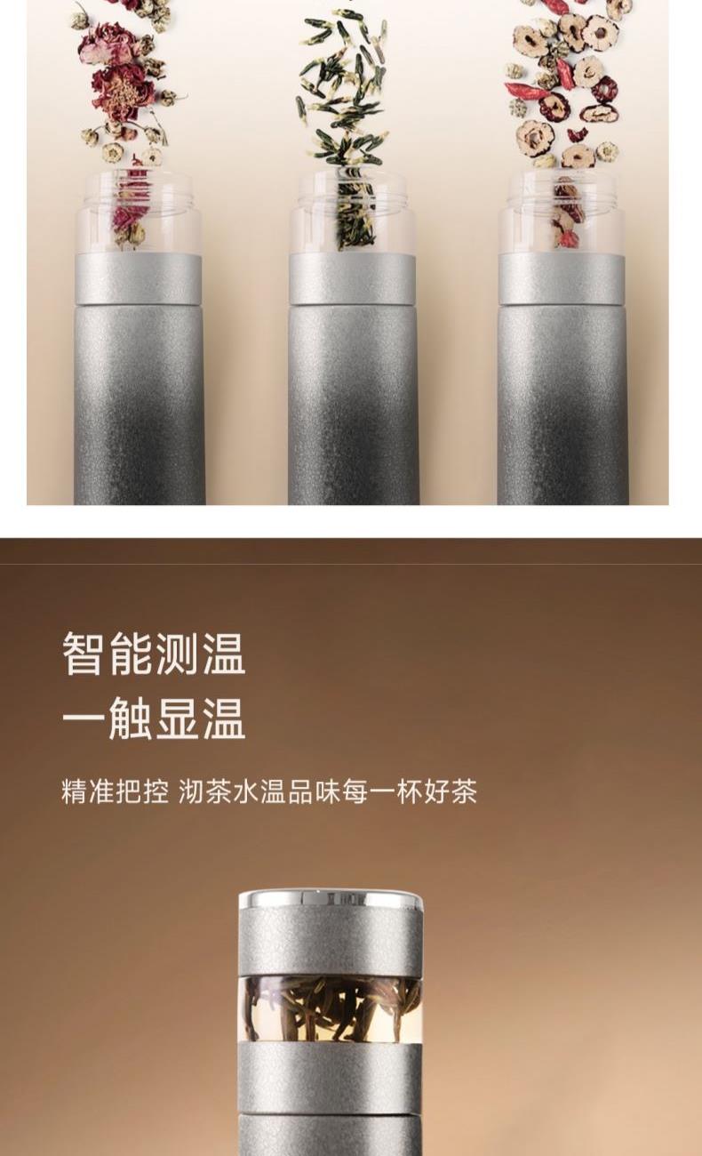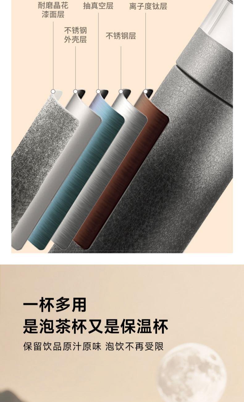 颜色:银黑 容量:450ml 材质:内胆SUS304+钛TA1(镀钛);杯盖:SUS304,茶仓塑料件:AS,杯盖:PP,密封圈:硅橡胶 配置:独立茶仓,温度显示产品尺寸:φ66*213mm 包装:彩盒,70*70*235mm 1、450ml,内胆,茶滤及内塞盖为镀钛,安心看的见 2、独立茶仓,温度显示