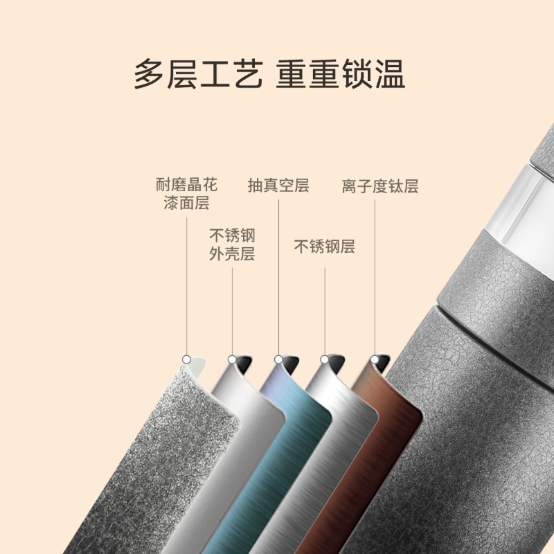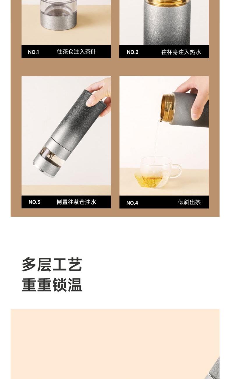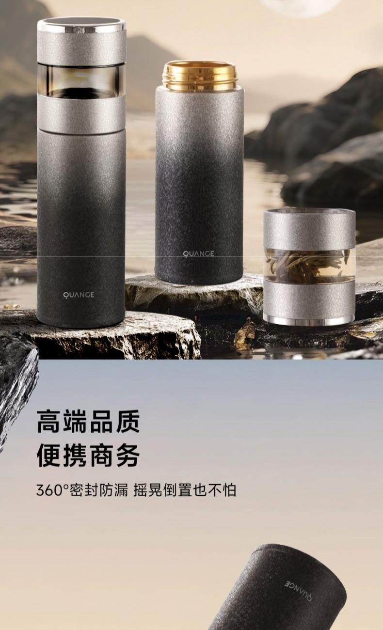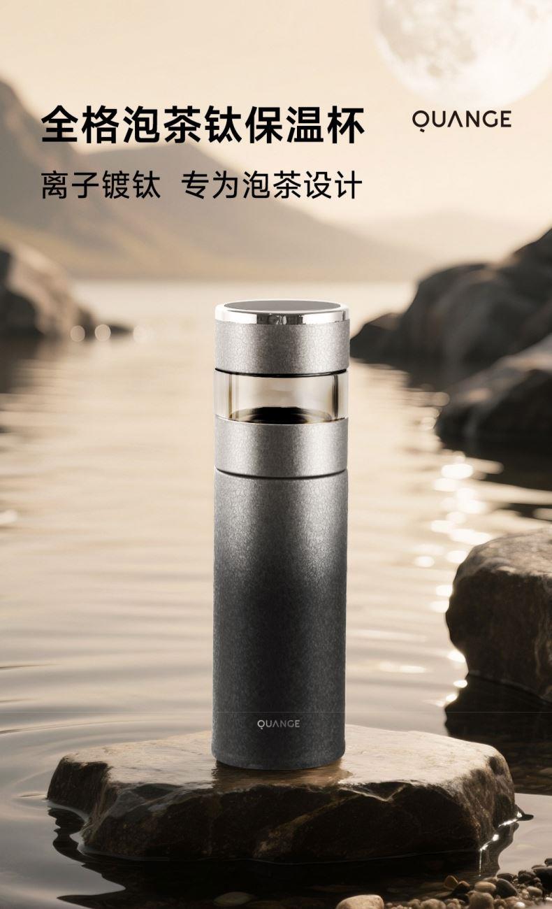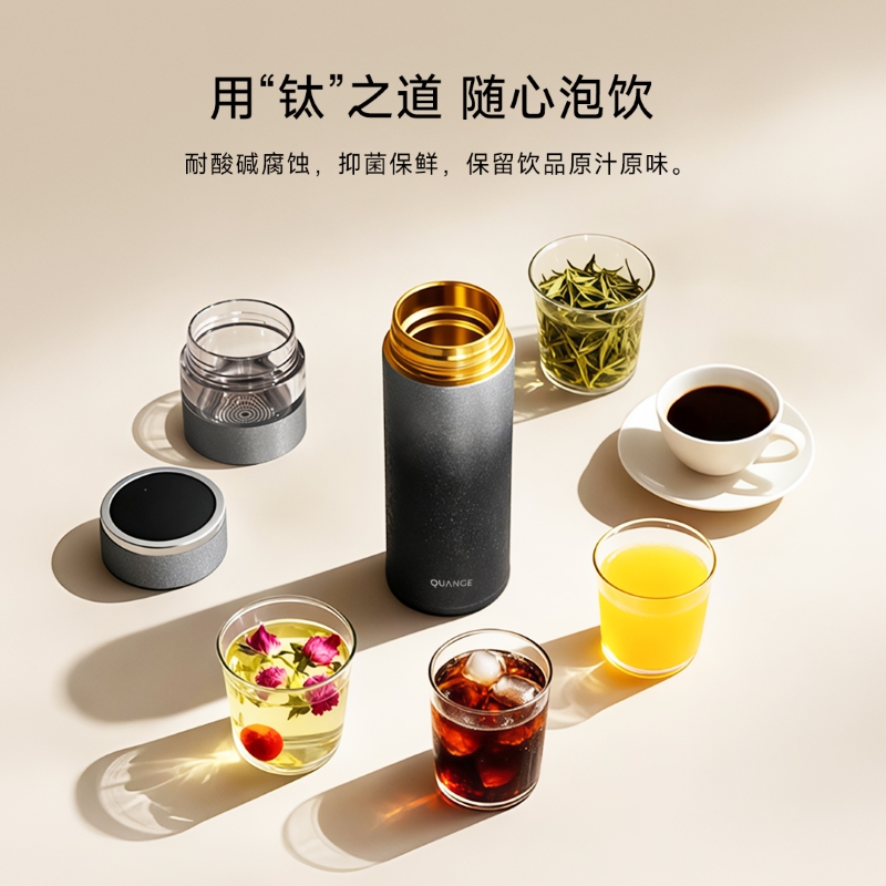 颜色:银黑 容量:450ml 材质:内胆SUS304+钛TA1(镀钛);杯盖:SUS304,茶仓塑料件:AS,杯盖:PP,密封圈:硅橡胶 配置:独立茶仓,温度显示产品尺寸:φ66*213mm 包装:彩盒,70*70*235mm 1、450ml,内胆,茶滤及内塞盖为镀钛,安心看的见 2、独立茶仓,温度显示