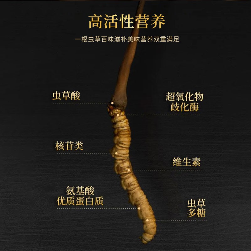 规格:3克(约12支) 卖点: 西藏是冬虫夏草的重要产区,那里的高海拔环境,如雪山、草地,昼夜温差大,紫外线强烈。这种独特的生态环境造就了冬虫夏草的高品质,它生长在这样严酷的条件下,积累了丰富的营养成分。