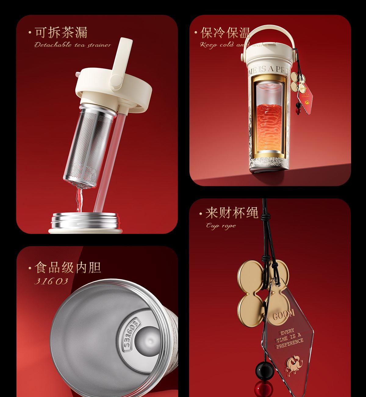 型 号:GM-23AW-B7 颜 色:添鸿运(红色) / 丰米运(米色) 材 质:内胆一奥氏体不锈钢S31603 外壳/茶漏一奥氏体不锈钢S30408 吸管-PP聚丙烯(丙烯均聚物) 杯盖-PP聚丙烯(丙烯与乙烯的聚合物) 密封件-硅橡胶,挂件-蜡绳、亚克力、锌合金珠子 容 量:600ml 单杯尺寸:101*219mm 外箱尺寸:89*89*247mm 1、一杯双饮:痛快敞口喝、精致吸管口不花妆,茶仓泡饮方便 2、密封防漏:360密封,安心无忧,多种场景放心畅饮 3、安心材质:食品级316内胆、长效锁温锁冷 4、黄金容量:600ml贴心续航,满足日常饮水需求! 5、便携随行:自带硅胶提手,出行更便捷 6、来财杯饰:细碎金光点缀,寓意美好