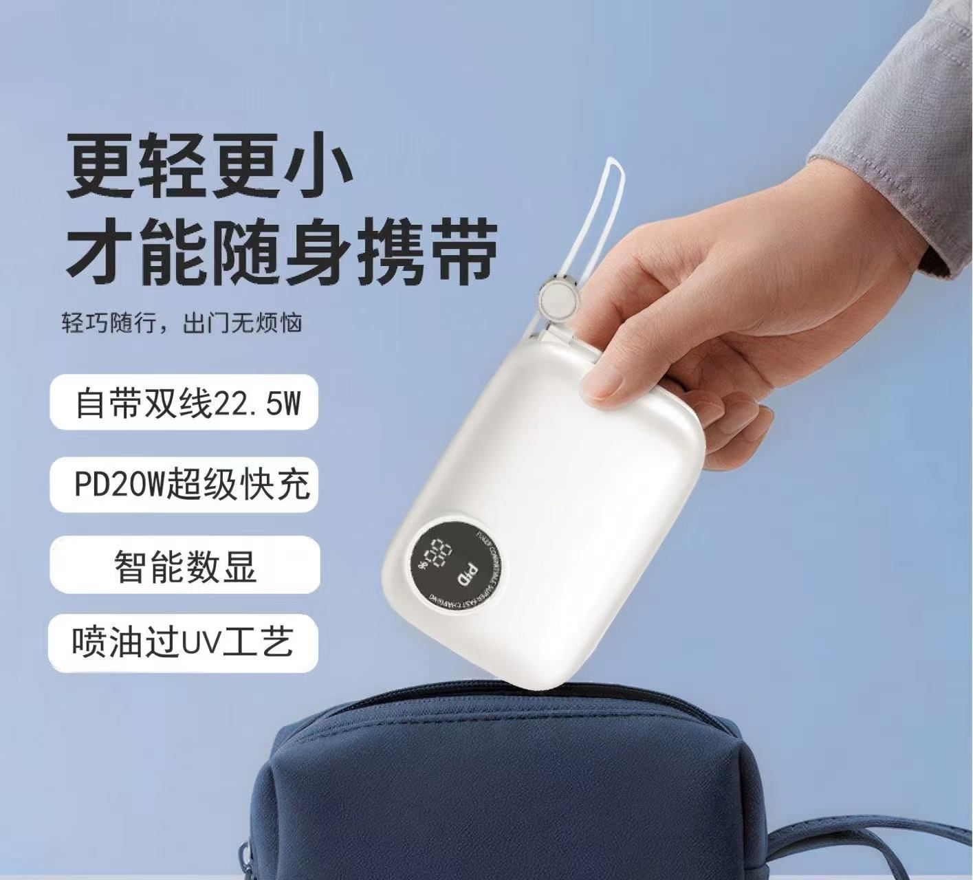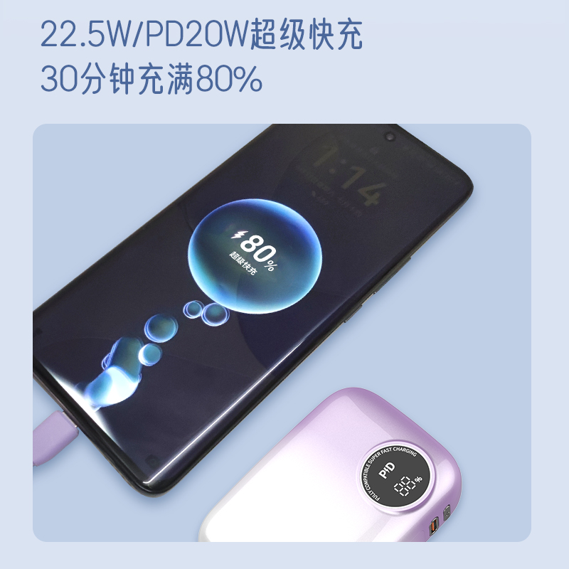 22.5W超级快充,1万毫安 3C强制质量认证体系 数字电量显示 自带双线满足各种手机充电 符合民航局标准,可随身携带