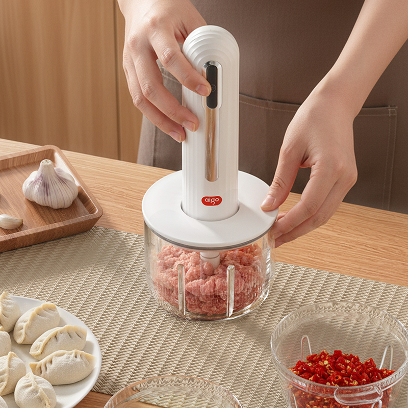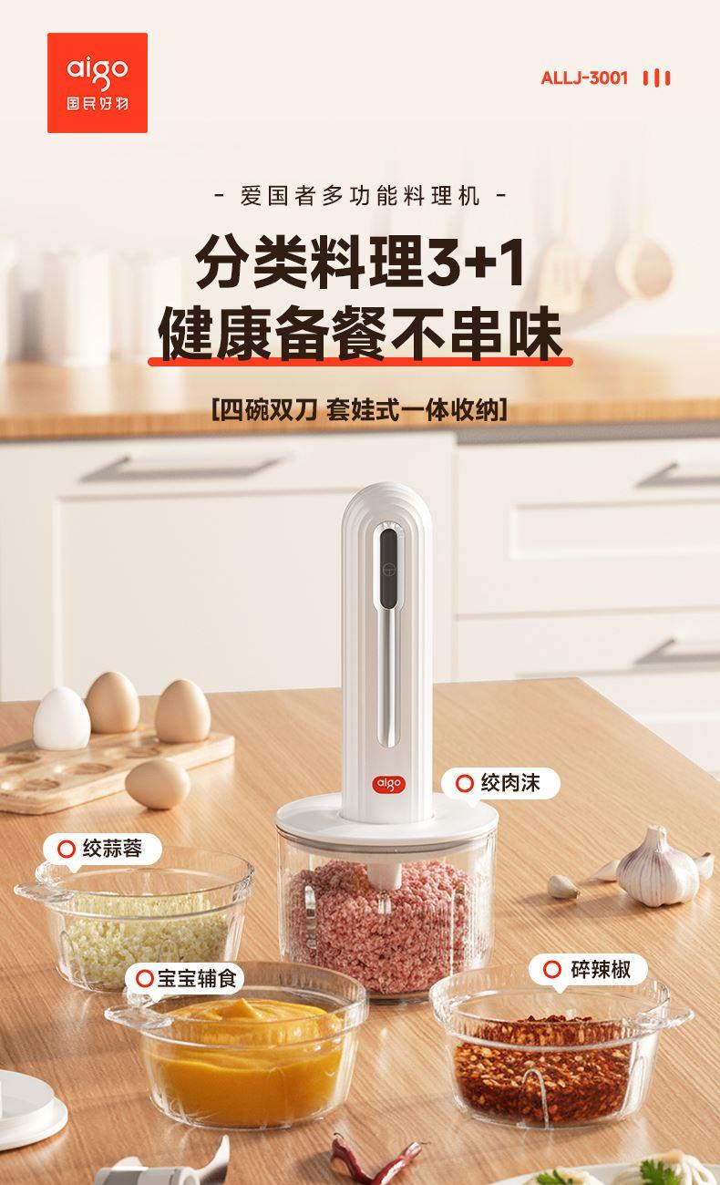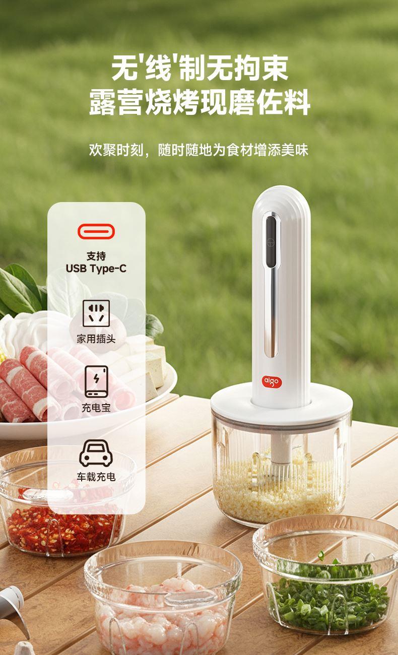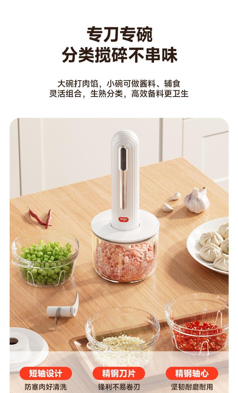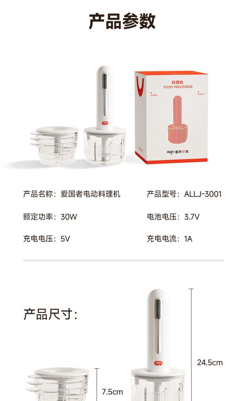 Type-C快充3-4小时,满电搅打20次; 大杯搅肉泥400mL,小杯200mL做果酱,四叶/两叶刀片按需切换; 卡刀自停+双重保护;食材过量自动断电,电压异常红灯预警,小白操作零风险; 极简料理逻辑30秒,点动开关一按即用,单手操作解放宝 妈。 功率:30W 电池容量:1300mAh 毛重:540g 包装方式:彩邮外 包装尺寸:125*125*175mm