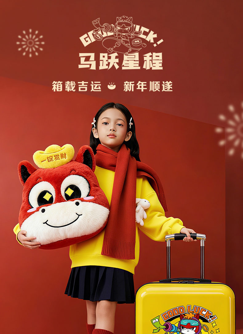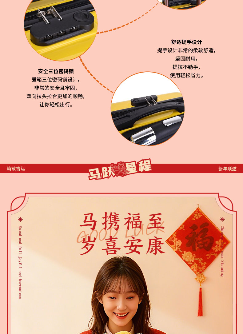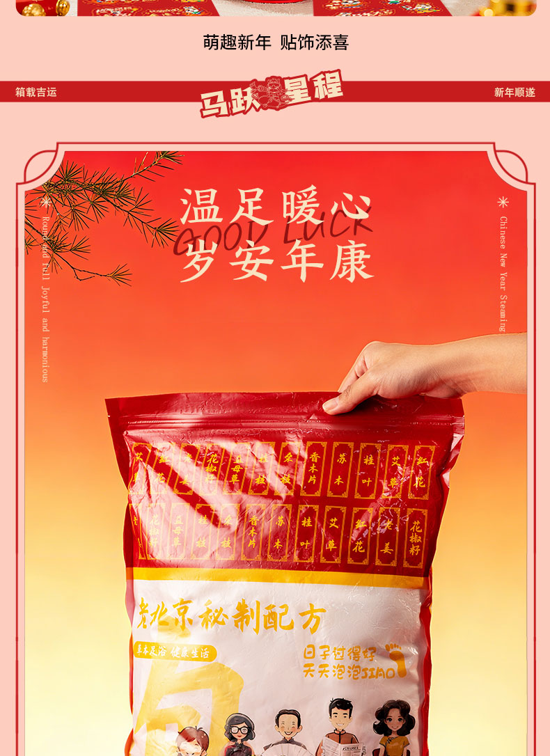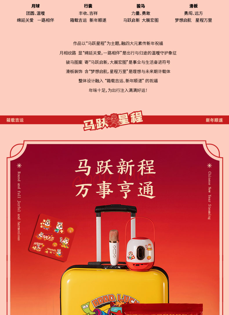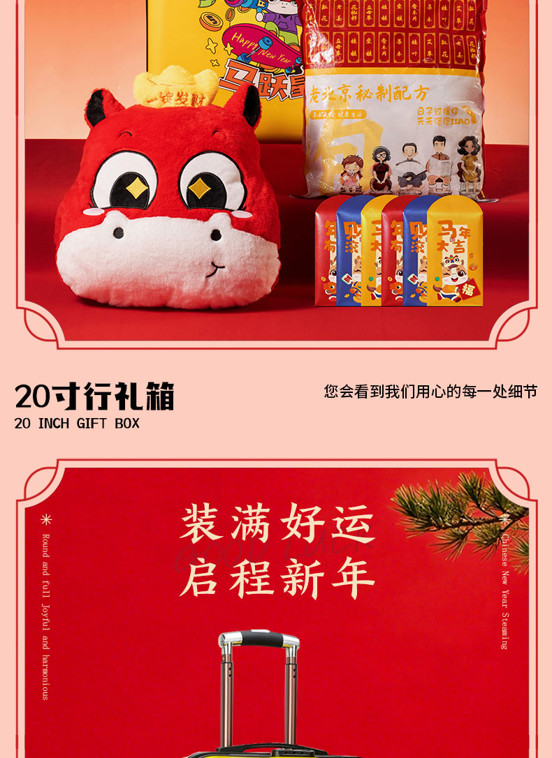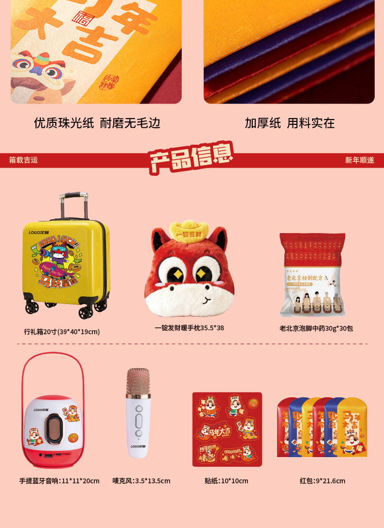 产品配置:20寸行李箱、多功能蓝牙音响加氛围灯加唛、十八味药材泡脚包30袋、一锭发财抱枕、马年大吉红包*6个