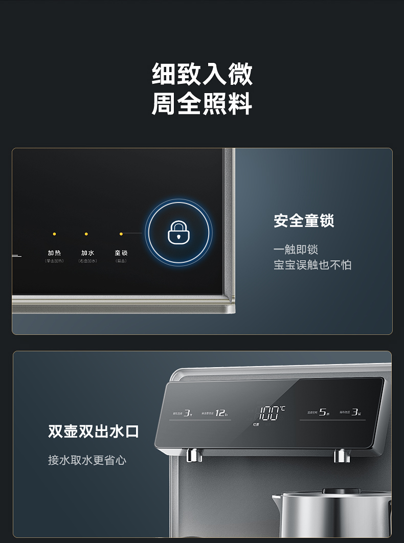 产品尺寸:340x350x1070mm 包装尺寸:415x425x1175mm 毛重:14.75kg 五档常用水温,随心应对四季冲泡; 55℃暖饮长伴,沉浸书海温热常在; 整机一体出厂,免组装 拆箱直用; 智能注水免看管,安全防溢防烫伤; 甄选健康材质,放心开怀畅饮;