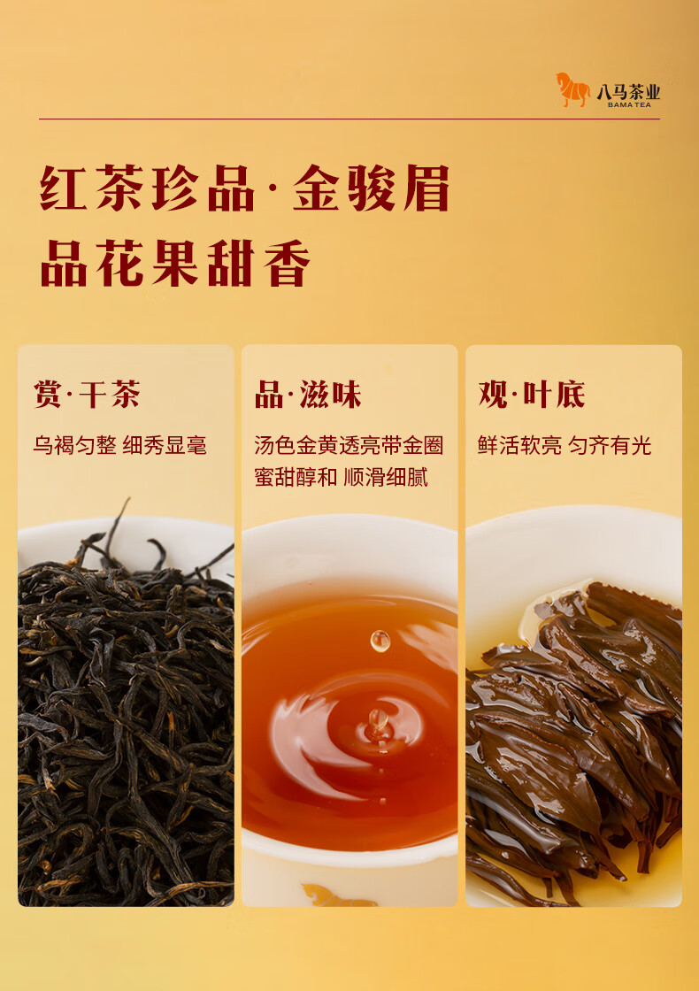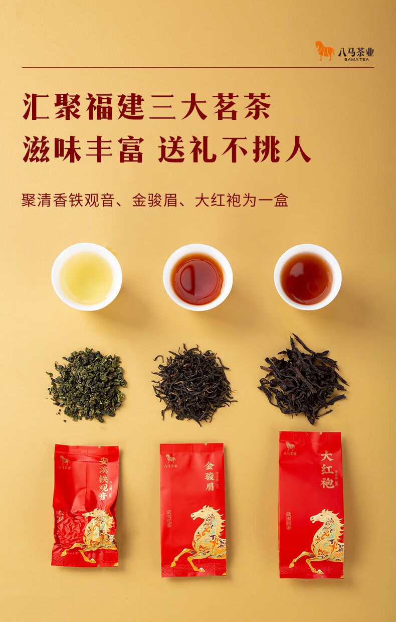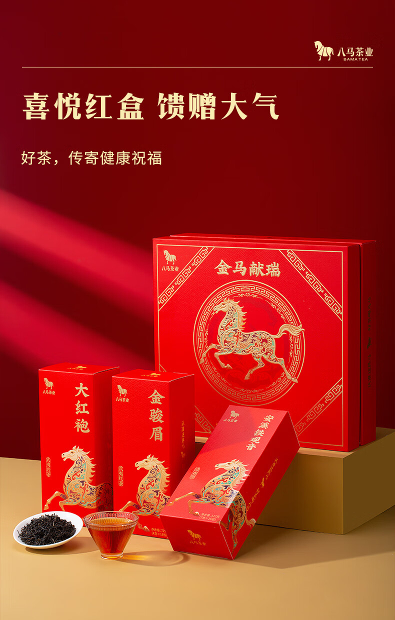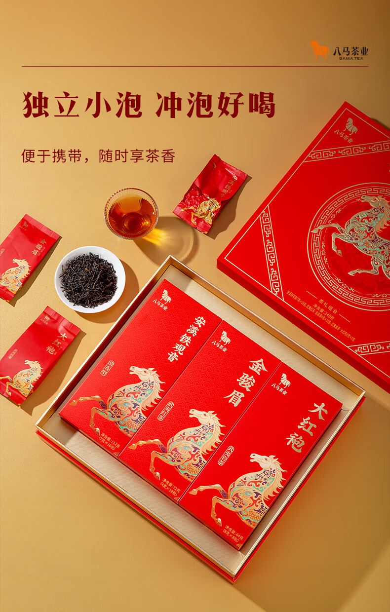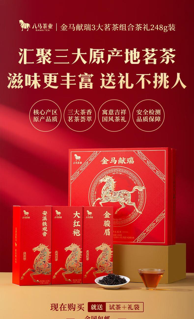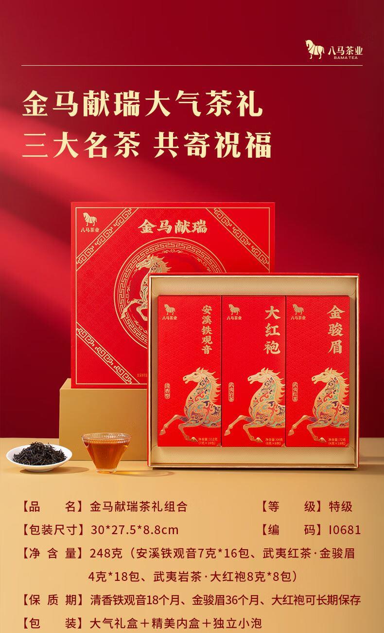 等级:特级 内配: 安溪铁观音7克*16包 武夷红茶·金骏眉4克*18包 武夷岩茶·大红袍8克*8包 净含量:248g 推荐理由: 靠谱:八马是国内茶企,品质和品控有成熟体系背书,喝茶更放心; 多品类覆盖:包含安溪铁观音、大红袍、金骏眉三大福建经典名茶,能同时满足清香(铁观音)、岩韵(大红袍)、蜜香(金骏眉)等不同口感偏好; 礼赠属性拉满:红金配色 +“金马献瑞” 的喜庆设计,包装精致有质感,适配节日、走亲访友等礼赠场景,拿得出手; 经典名茶品质:三款茶都是茶圈公认的热门品类,口感、香气都属于大众接受度高的经典款,不管是自饮还是送人均适配。