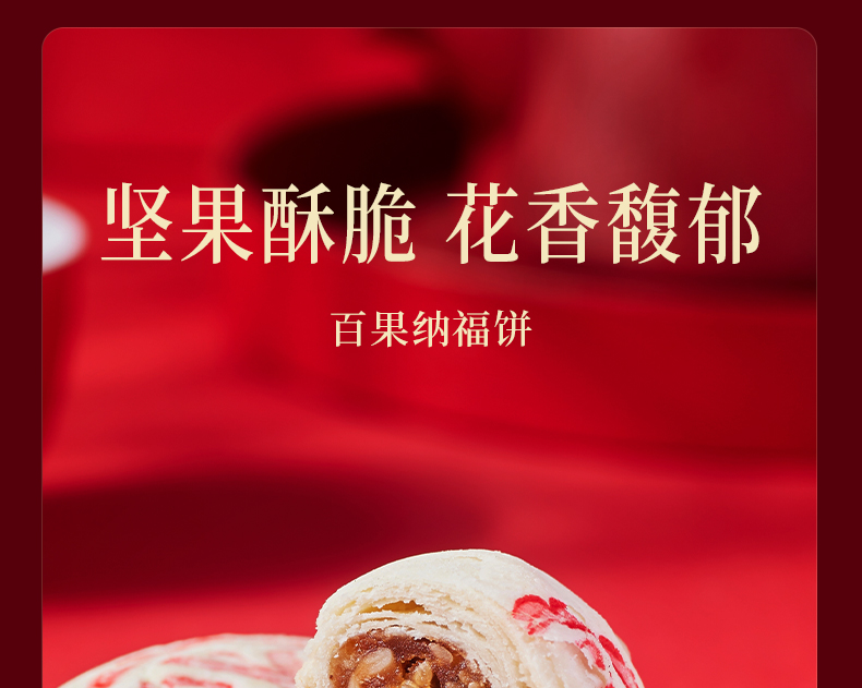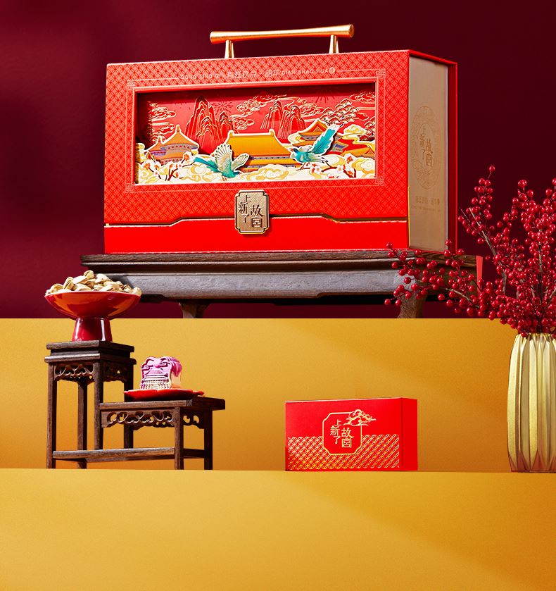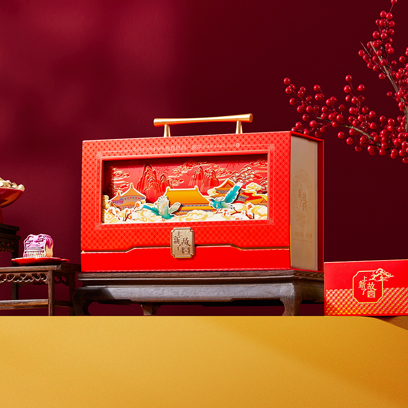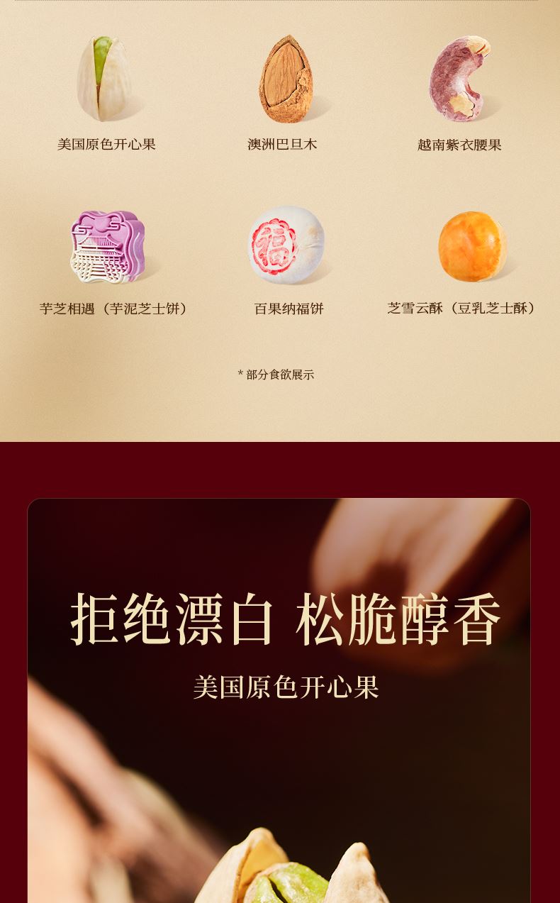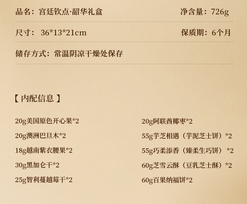 20g美国原色开心果*2 20g澳洲巴旦木*2 18g越南紫衣腰果*2 30g黑加仑干*2 25g智利蔓越莓干*2 20g阿联酋椰枣*2 55g芋芝相遇(芋泥芝士饼)*2 55g啡韵添香(炭烧咖啡饼)*2 60g芝雪云酥(豆乳芝士酥)*2 60g百果纳福饼*2 于故宫红墙之内,再现节日胜景,内衬故宫角楼建筑,配以云纹点缀,寓意吉祥康乐,尤有团圆意境; 净含量:726g,内含3种坚果、 3种果干、4款糕点,独特手提盒型,送礼尽显新意与美感。