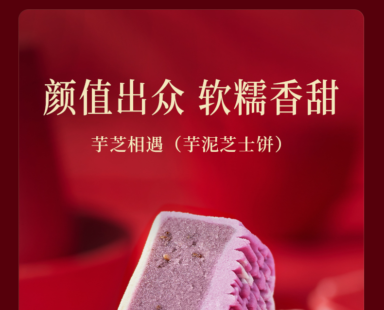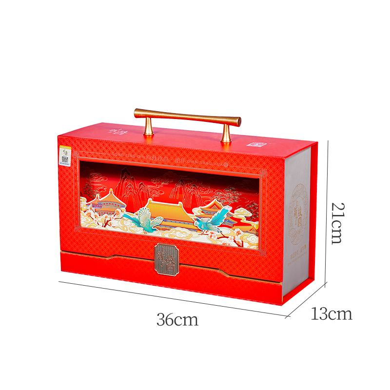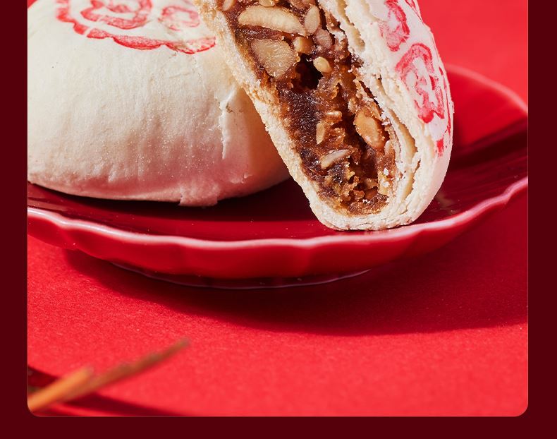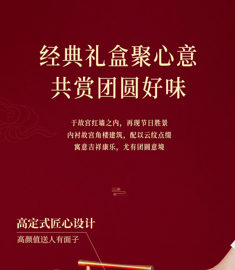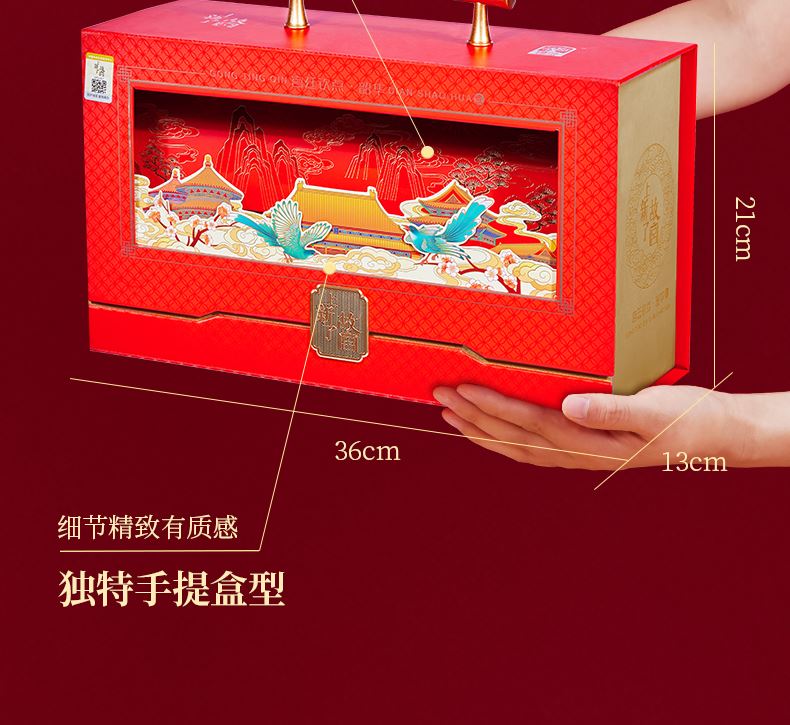 20g美国原色开心果*2 20g澳洲巴旦木*2 18g越南紫衣腰果*2 30g黑加仑干*2 25g智利蔓越莓干*2 20g阿联酋椰枣*2 55g芋芝相遇(芋泥芝士饼)*2 55g啡韵添香(炭烧咖啡饼)*2 60g芝雪云酥(豆乳芝士酥)*2 60g百果纳福饼*2 于故宫红墙之内,再现节日胜景,内衬故宫角楼建筑,配以云纹点缀,寓意吉祥康乐,尤有团圆意境; 净含量:726g,内含3种坚果、 3种果干、4款糕点,独特手提盒型,送礼尽显新意与美感。