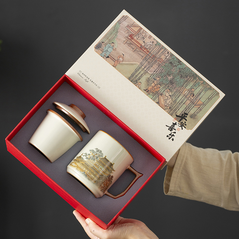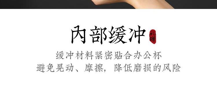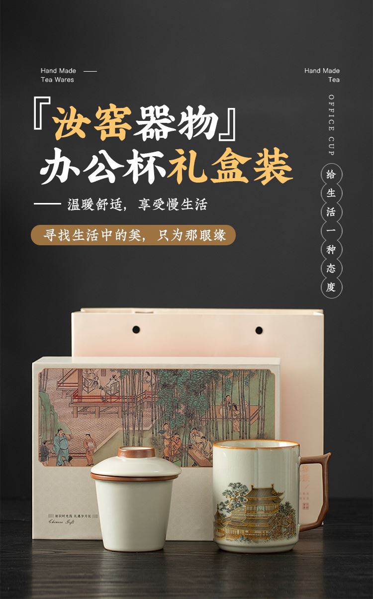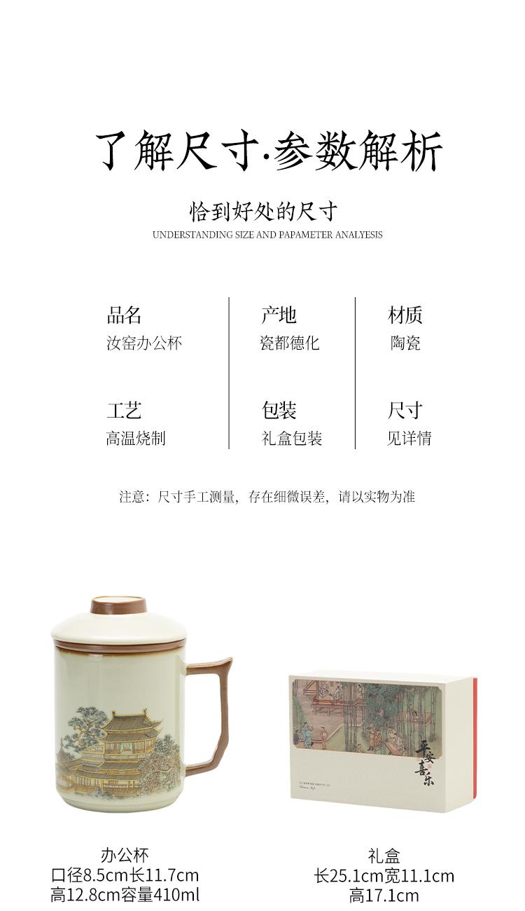 配置:办公杯三件套*1 礼盒*1 手提袋*1 材质:汝窑 礼盒尺寸:25cm*11cm*17cm 产品尺寸:办公杯:直径8.5cm 宽11.7cm*高12.8cm 容量410ml