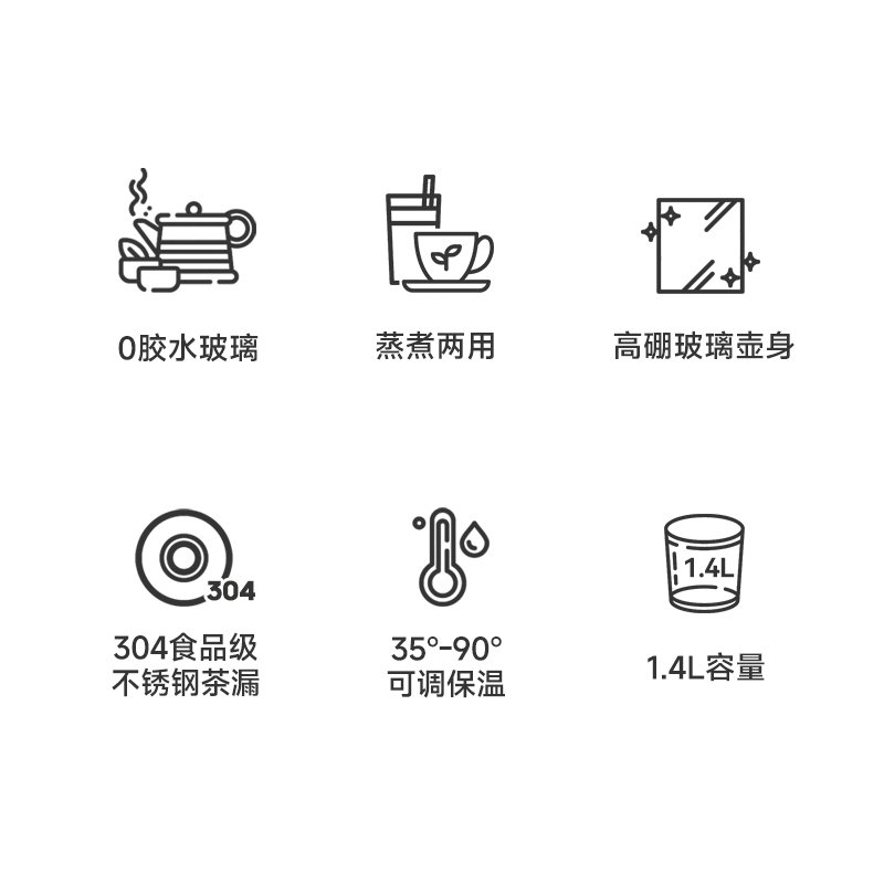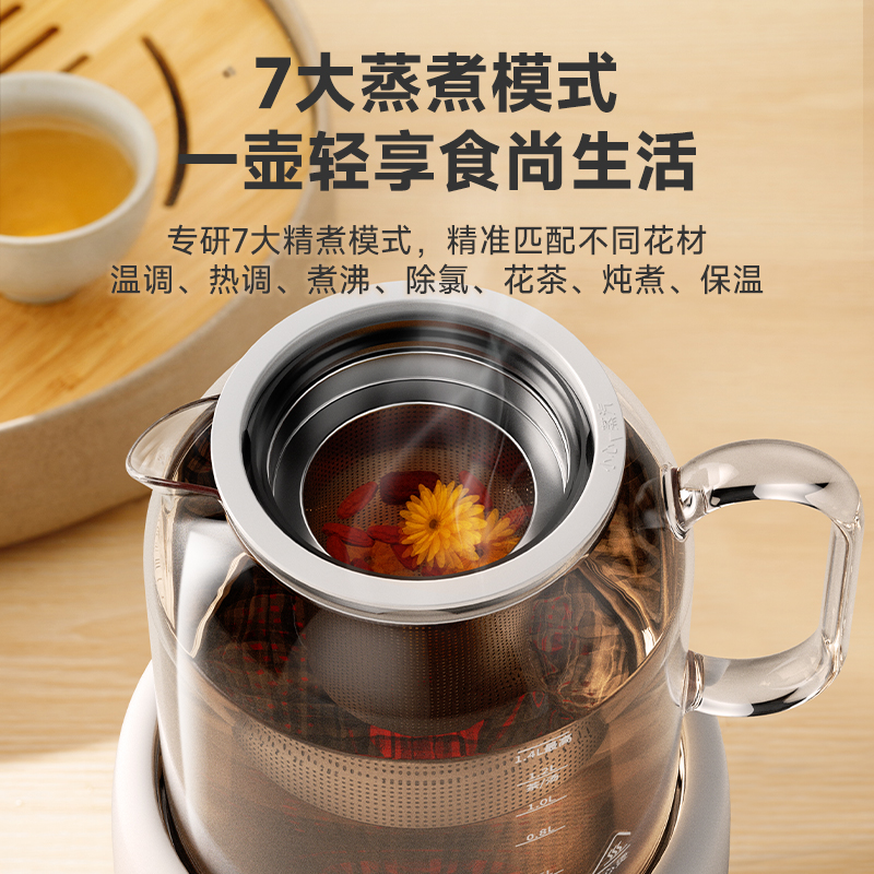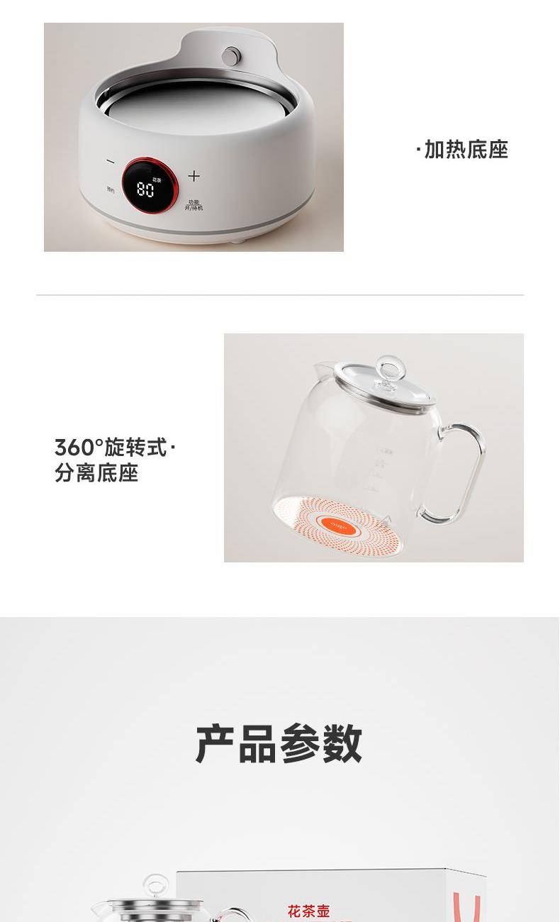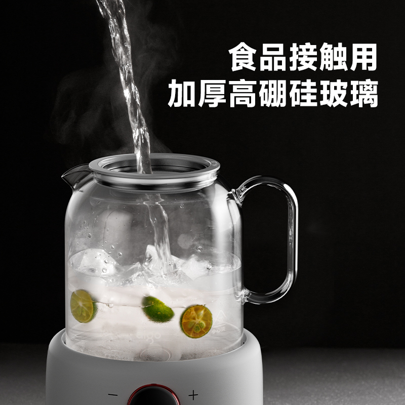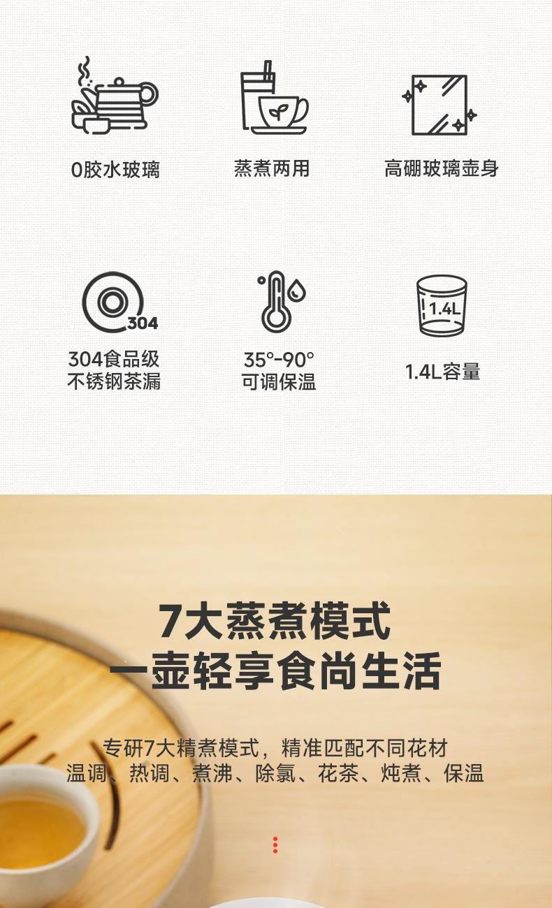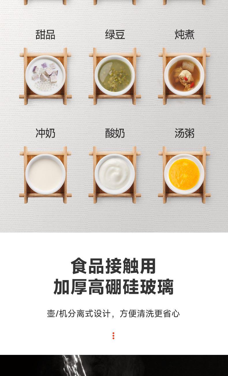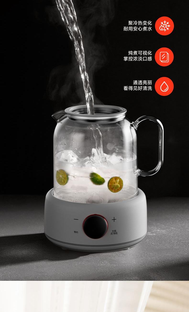 采用高硼硅玻璃壶身,耐高温骤冷骤热不爆裂 时尚、高 端灵敏触摸式感应按键+微电脑控制 10大功能,24小时预约,保温40-90度可调 防干烧功能,静音设计,液晶屏显示 烧水、花茶、银耳、甜品、绿豆、炖煮、冲奶、酸奶、汤粥、保温 功率:800W 容量:1.5L 包装尺寸:290*238*230mm 包装方式:彩邮外 毛重:1.5kg