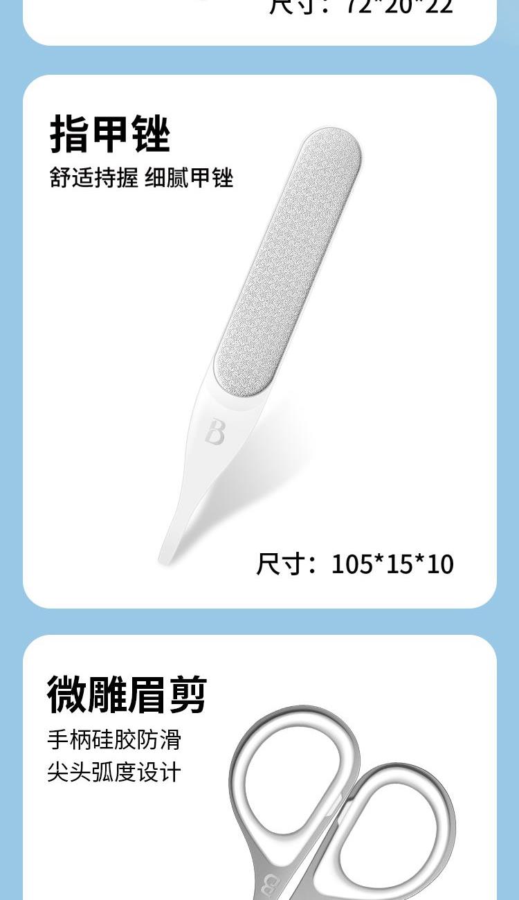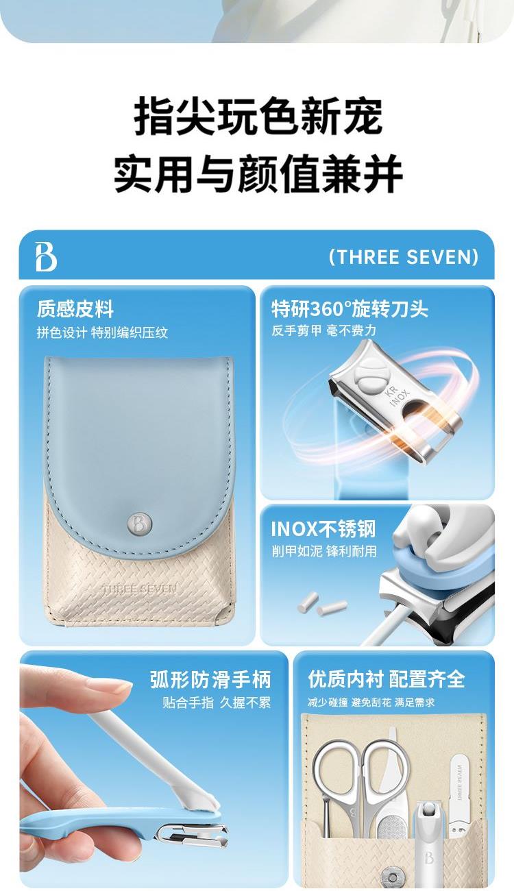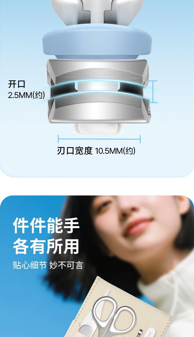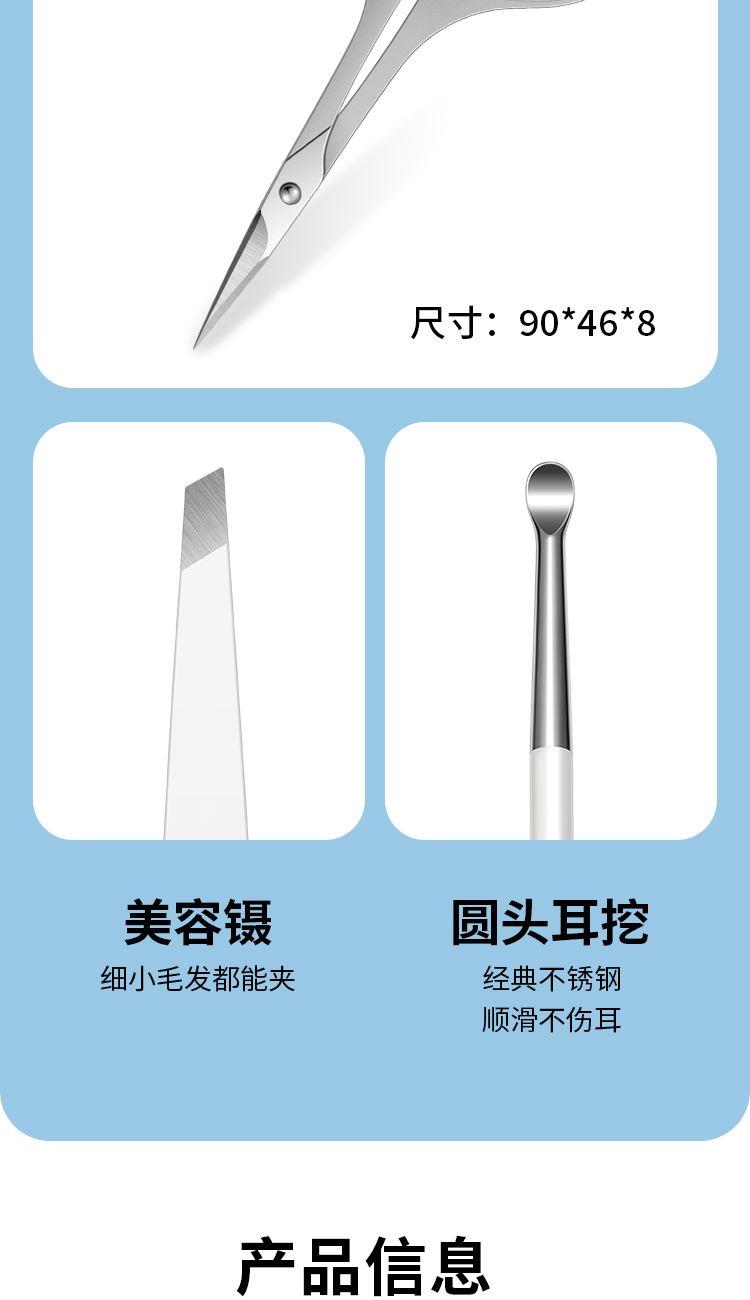 材质:优质不锈钢 规格:115*73*33mm 产品颜色:蓝色 套装内容:5件套 产品配件:弧口指甲刀、锉片、耳挖、眉夹、眉毛剪 产品卖点: 1)工具齐全,各显神通:套装里的每一件工具都有专属用途,指甲修剪、死皮处理等需求,都能满足,呵护指尖细节。 2)便携皮套,精致随行:采用小巧便携的皮套设计,如同卡片般易携带,无论是外出还是居家,都能轻松拿取,开启精致美甲护理。 3)细节贴心:从工具的工艺到皮套的设计,处处体现贴心巧思,使用时顺畅顺手,让每一次指尖护理都成为愉悦享受。