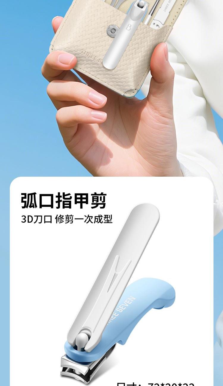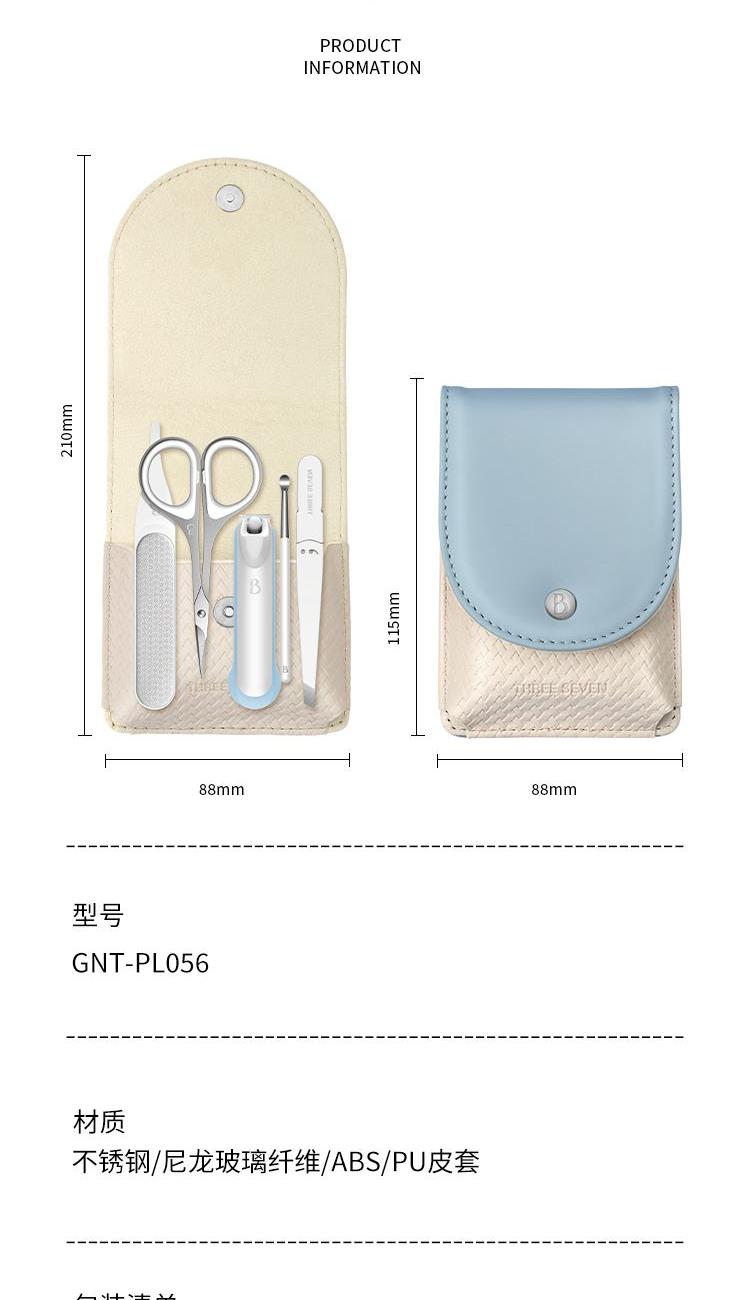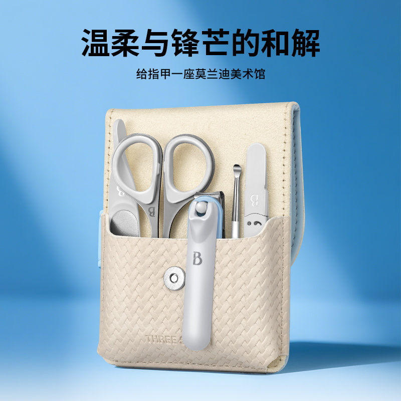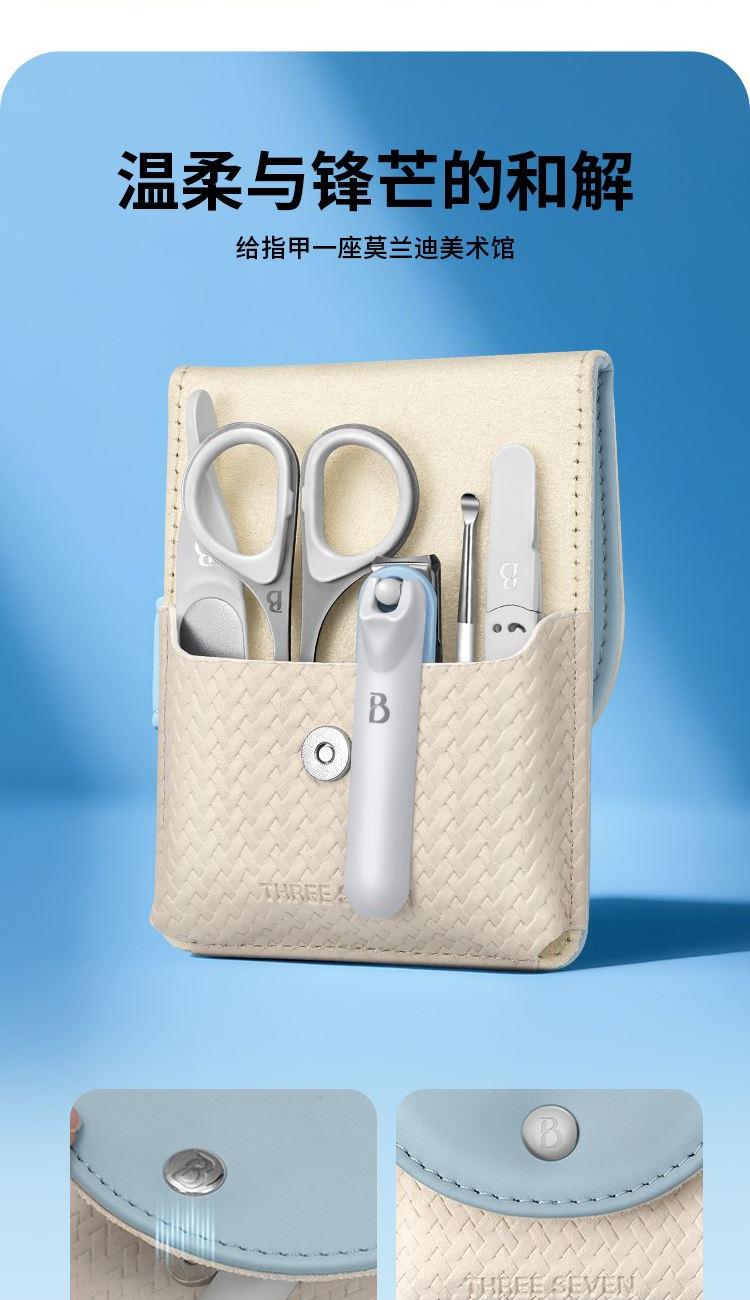 材质:优质不锈钢 规格:115*73*33mm 产品颜色:蓝色 套装内容:5件套 产品配件:弧口指甲刀、锉片、耳挖、眉夹、眉毛剪 产品卖点: 1)工具齐全,各显神通:套装里的每一件工具都有专属用途,指甲修剪、死皮处理等需求,都能满足,呵护指尖细节。 2)便携皮套,精致随行:采用小巧便携的皮套设计,如同卡片般易携带,无论是外出还是居家,都能轻松拿取,开启精致美甲护理。 3)细节贴心:从工具的工艺到皮套的设计,处处体现贴心巧思,使用时顺畅顺手,让每一次指尖护理都成为愉悦享受。
