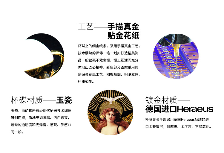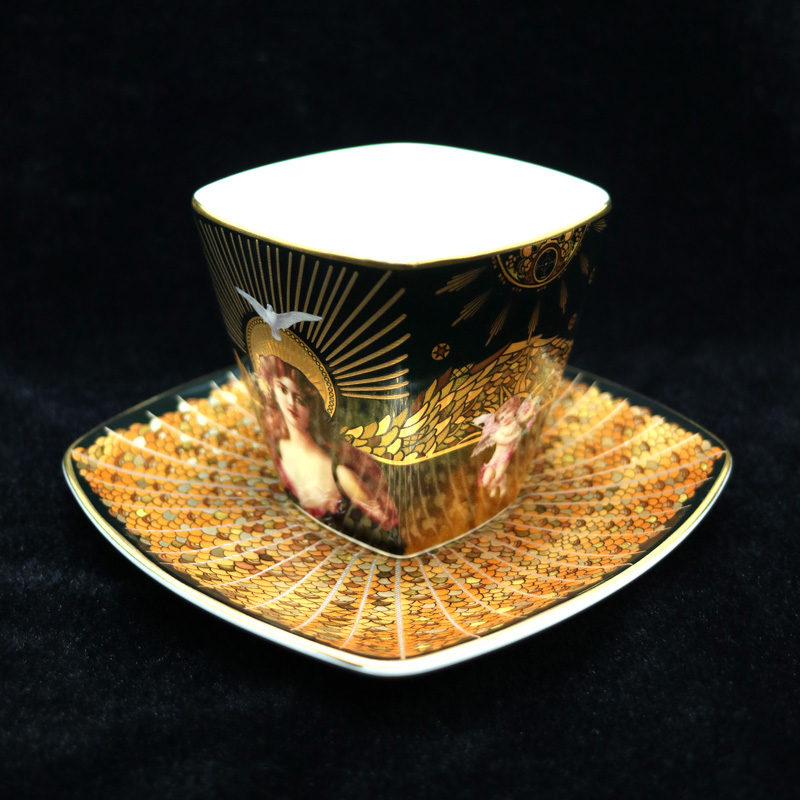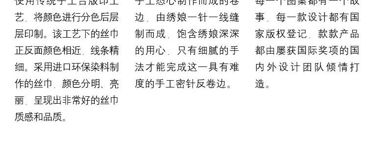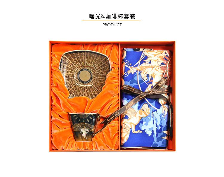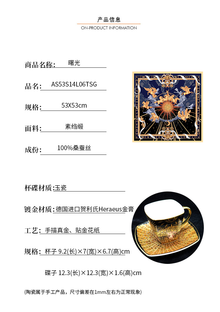曙光小方巾 规格:53X53cm 面料:素绉缎 成分:桑蚕丝 杯碟材质:玉瓷 镀金材质:德国进口贺利氏Heraeus金膏 工艺:手描真金、贴金花纸 规格:杯子 9.2(长)x7(宽)x6.7(高)cm 碟子 12.3(长)x12.3(宽)x1.6(高)cm (陶瓷属于手工产品,尺寸偏差在1mm左右为正常现象)