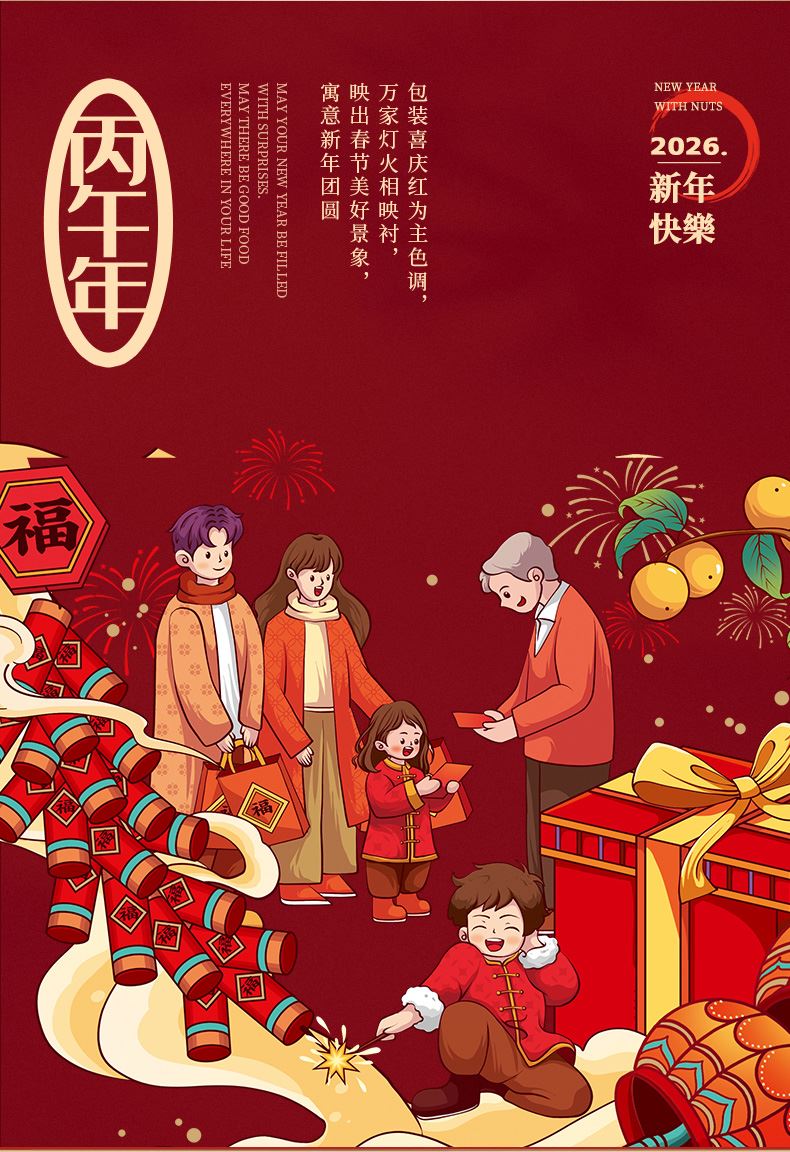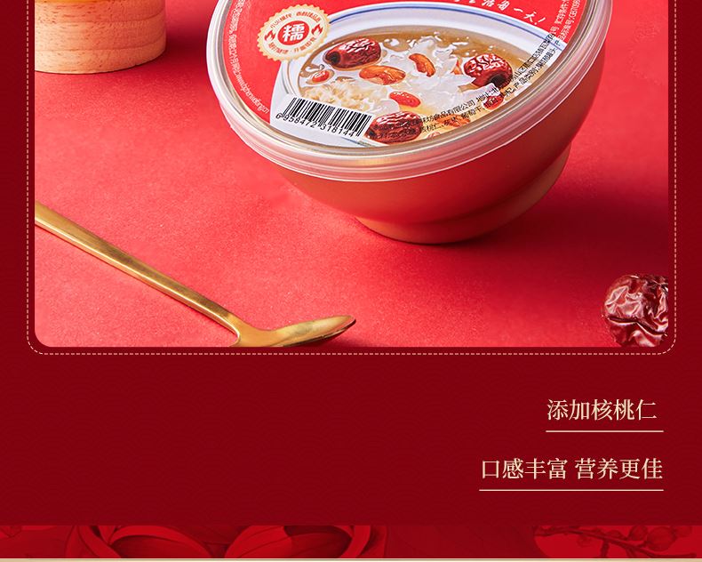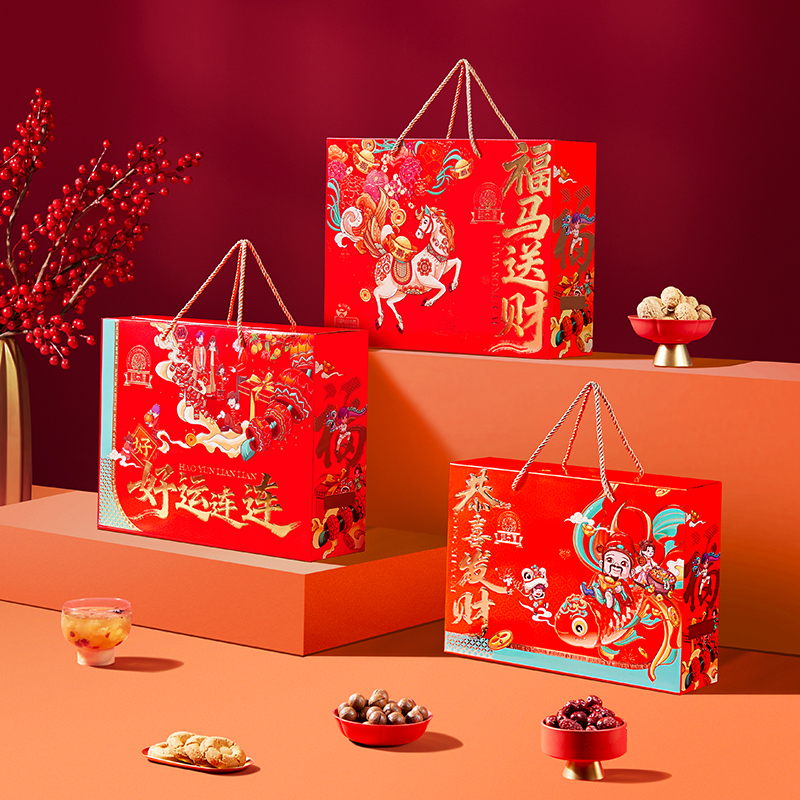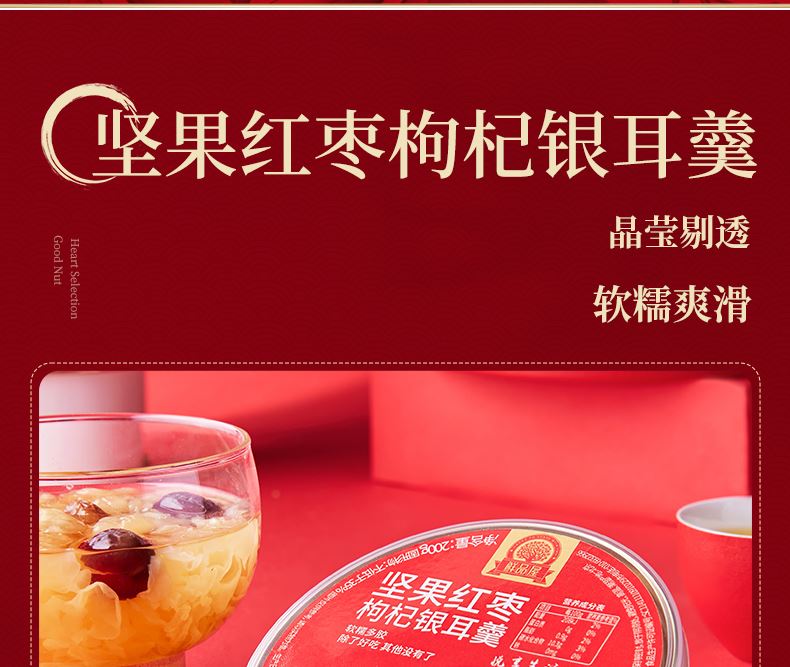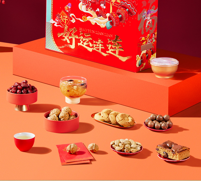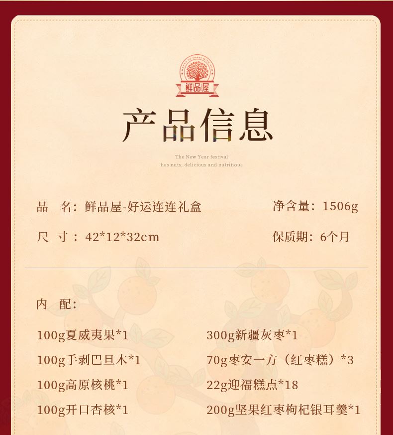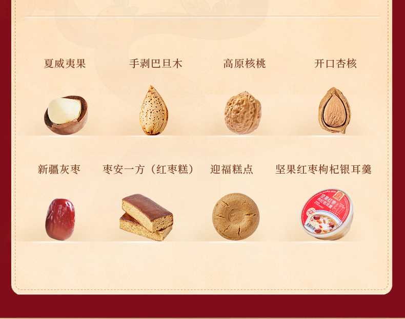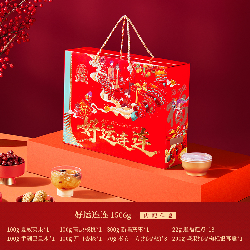 100g夏威夷果*1 100g手剥巴旦木*1 100g高原核桃*1 100g开口杏核*1 300g新疆灰枣*1 70g枣安一方(红枣糕)*3 22g迎福糕点*18 200g坚果红枣枸杞银耳羹*1 包装喜庆红为主色调,万家灯火相映衬,映出春节美好景象,寓意新年团圆; 净含量:1506g,内含8种美味,送亲朋好运连连,传递美好祝愿。