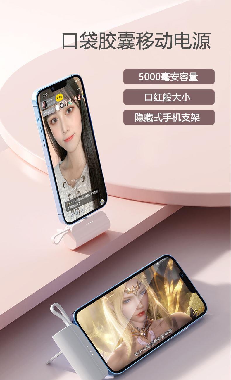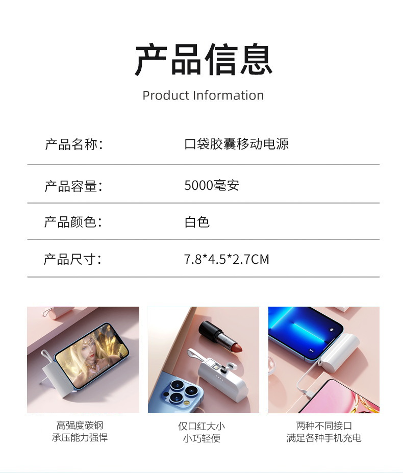 1、5000毫安口袋胶囊自带线电源 苹果直插接口,华为小米自带线 口红般大小精致可爱 符合民航局标准,可随身携带 2、66W超级快充一拖三伸缩数据线 兼容苹果15系列 五档伸缩调节 1.2米长度设计 TPE材质经久耐用 三种充电接口满足各种手机