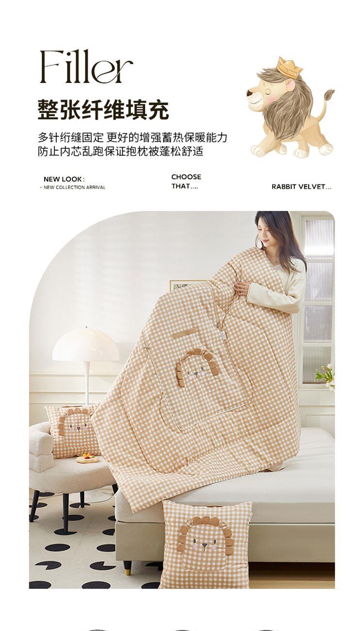 花色:手提款大象;手提款小狮子 规格:折叠40*40cm展开105*150cm 面料:洛卡棉(聚酯纤维 ) 填充:整张羽丝棉(聚酯纤维 ) 工艺: 立体绣花 是抱枕也是被子,萌趣立体的卡通造型,全部采用绗缝 +四周彩棉+立体绣花等工艺美手提款,别出心裁的设计,柔软罗卡棉面料, 柔软亲肤细腻, 手感软糯,不是棉胜是棉。