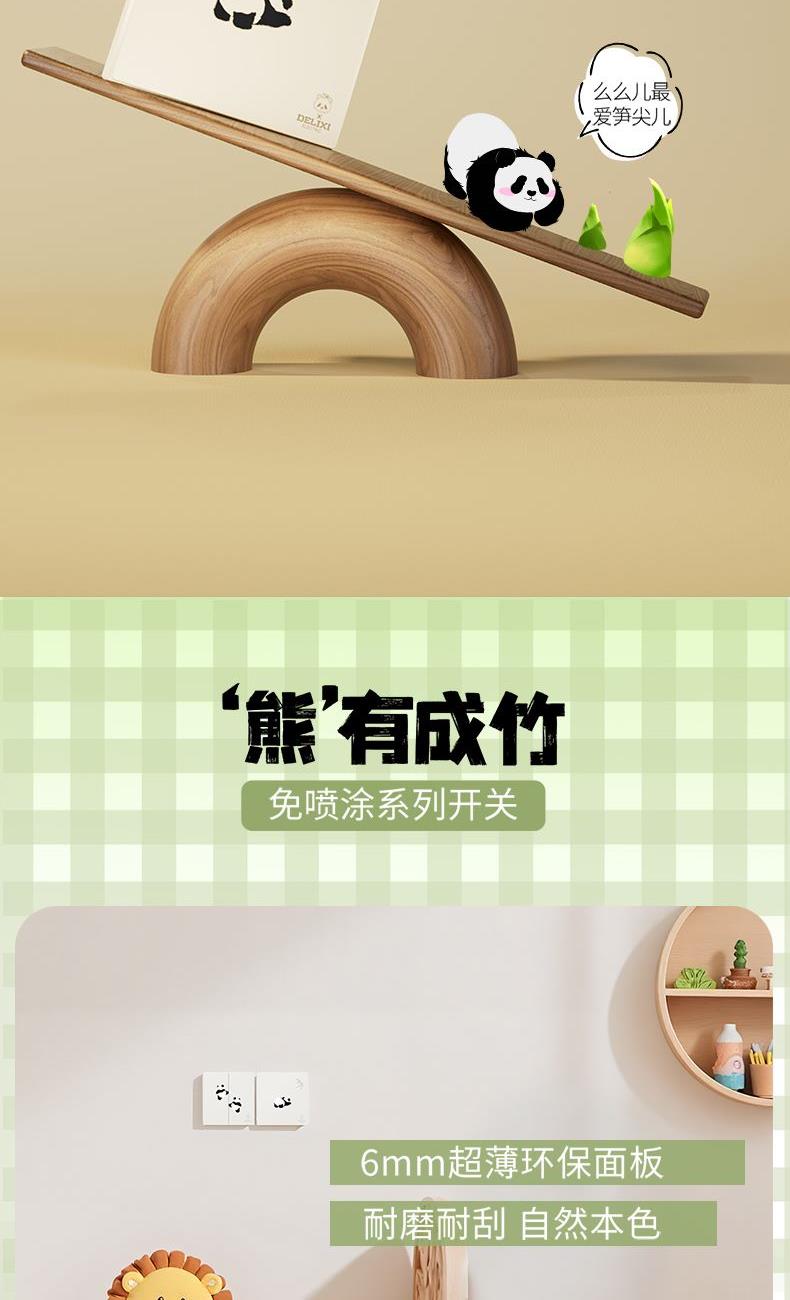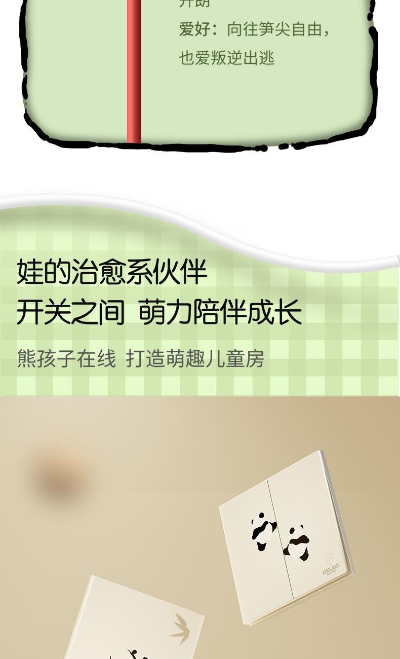 产品型号:HUP86K2 MLA(汉玉白) 产品描述: 1、1.2mm安装钢架; 2、16A高负载开关; 3、2度小摆角; 4、850度高温阻燃。 产品卖点: 1、国宝熊猫IP,重视文化符号象征; 2、IP联名提升产品附加值; 3、采用萌兰熊猫的卡通形象,为家居增添活泼氛围,满足年轻用户对个性化装饰的需求。