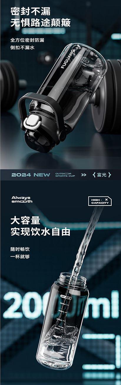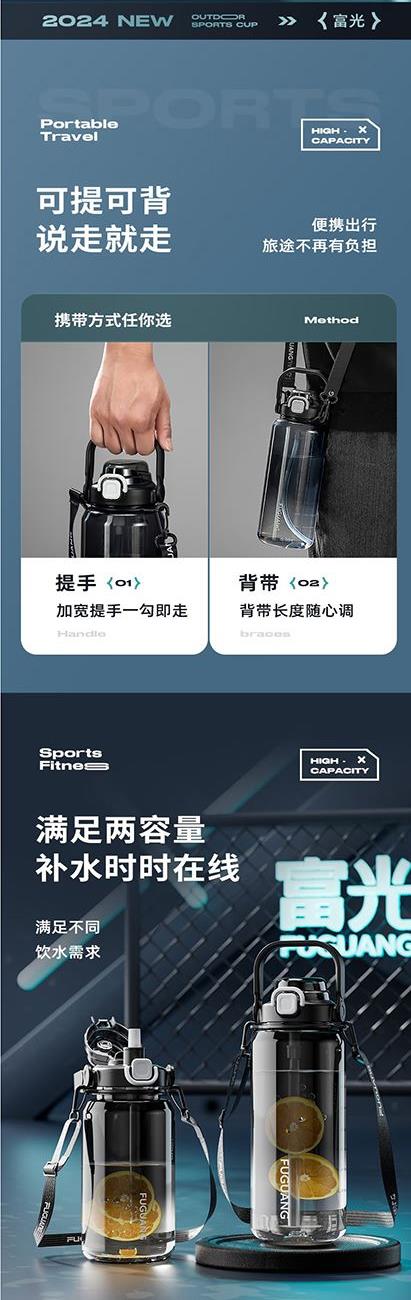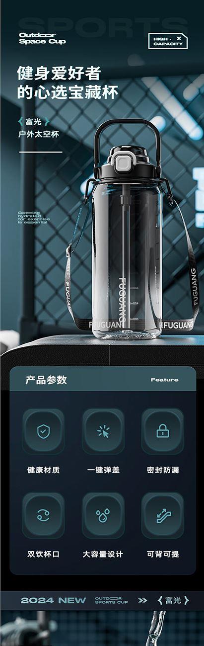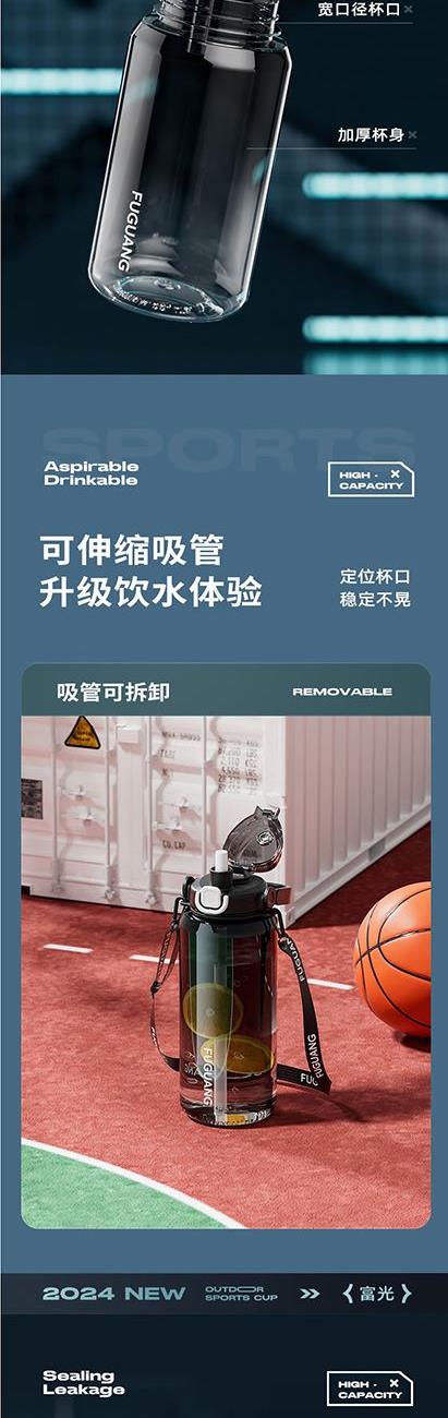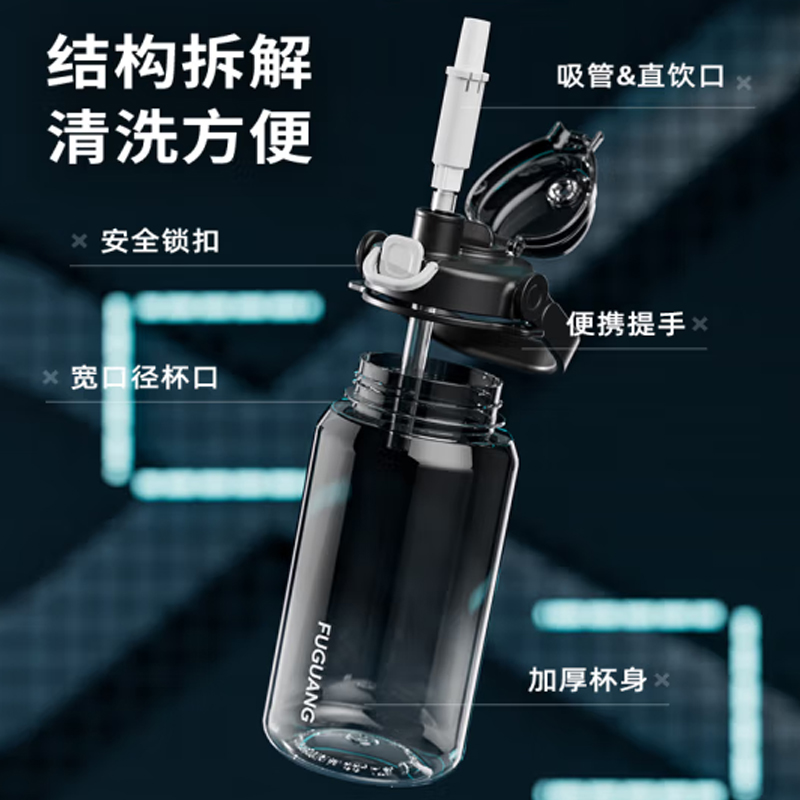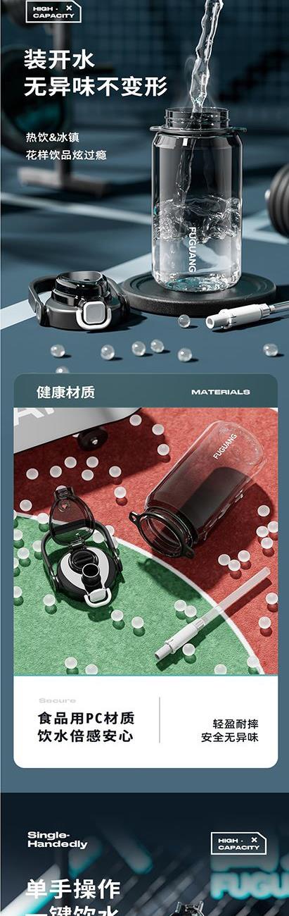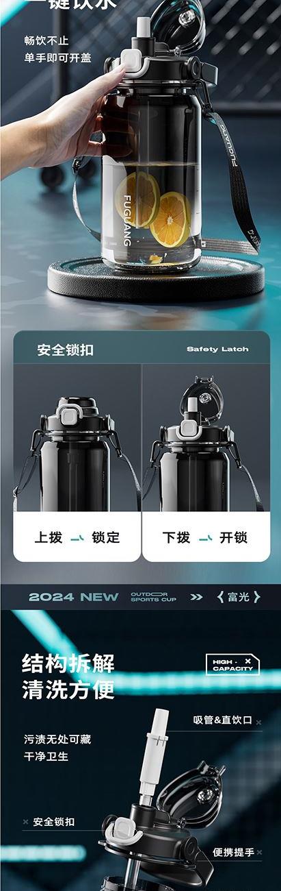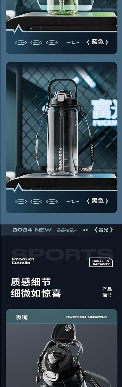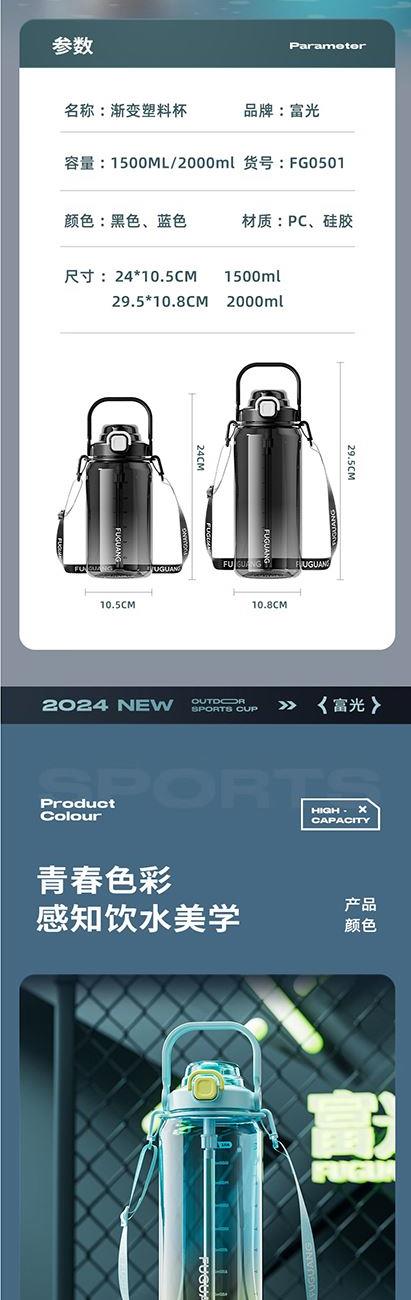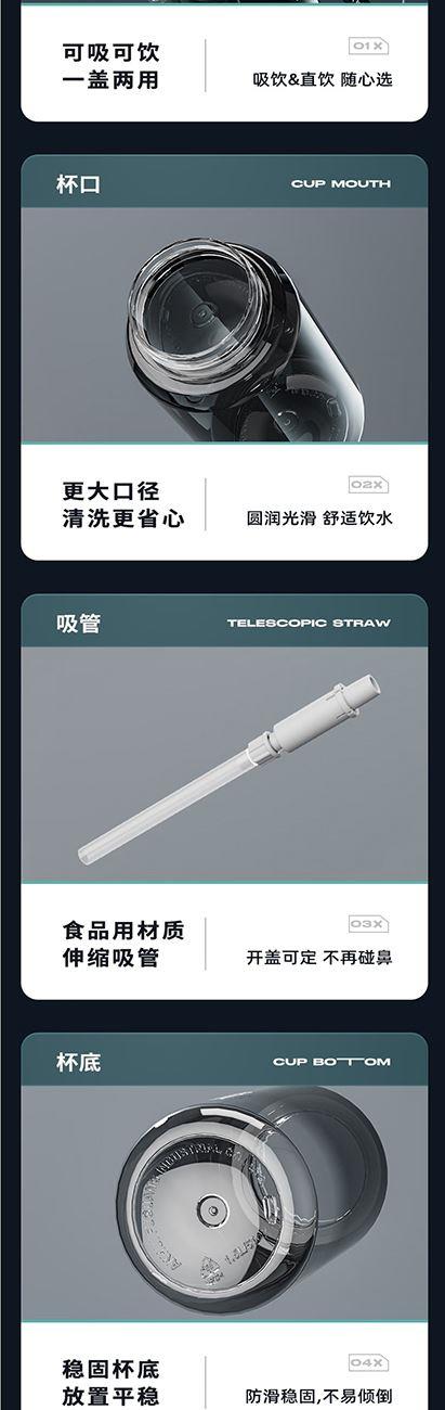 容量:1500ml 颜色:黑色 蓝色 尺寸:24*10.5cm 材质:食品级别PC材质,食品级别pp吸管,提手可背可提升级独立结构吸嘴,360°无死角清洁方便。 包装:OPP抽绳袋
