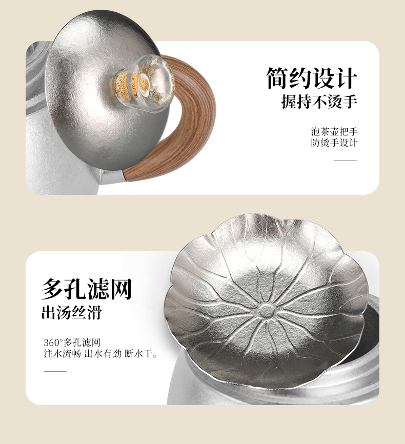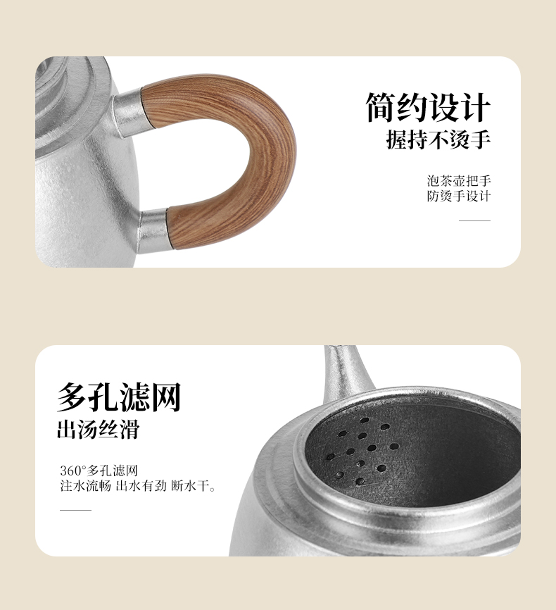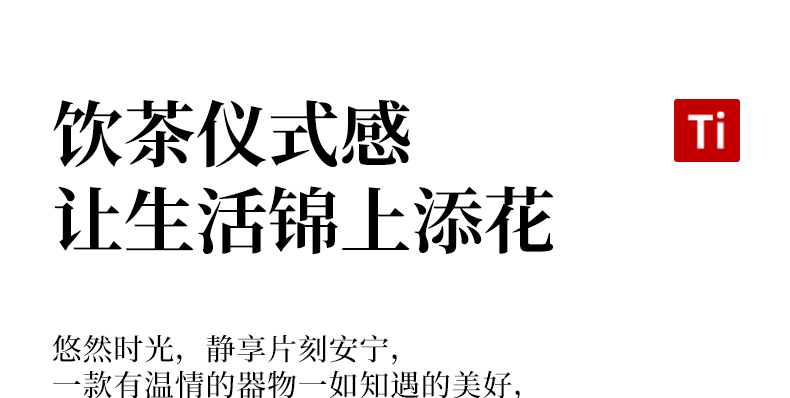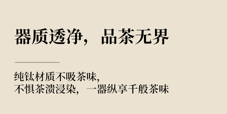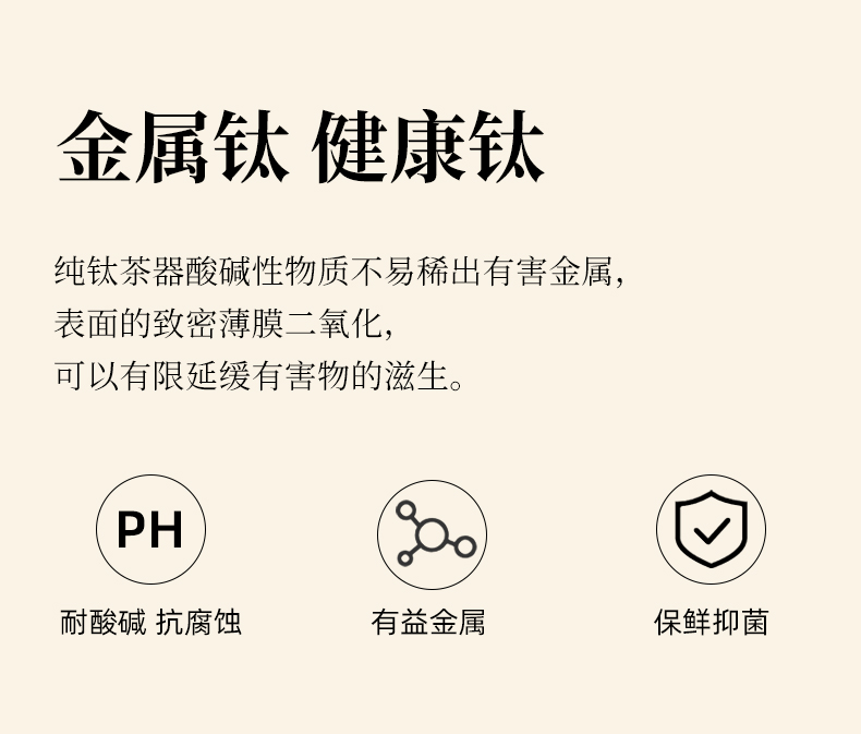 参数: · 茶壶材质 : 内外纯钛 · 茶杯材质 : 内外纯钛 · 茶托材质 : 纯钛 · 配 置 :茶壶*1+茶杯*4+茶托*1 · 容 量 : 茶杯容量35ML/壶容量350ML · 颜 色 :盖碗钛本色、茶杯1蓝/1绿、茶托钛本色 · 彩盒尺寸 :24*13*9.5CM · 外箱尺寸 :34.5*13.5*19.5CM · 毛重(带礼盒)455g 卖点: · 杯体采用纯钛材质,含钛量达99.8%。 · 保冷保温,健康锁鲜。 · 材质健康安全,不与各类酸碱性饮品产生化学反应,安 全无析出,放心盛放日常饮品。 · 表面不喷漆上色,钛材质本色,长期使用不掉色。