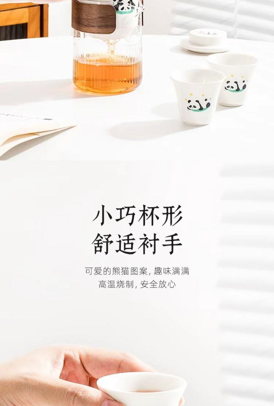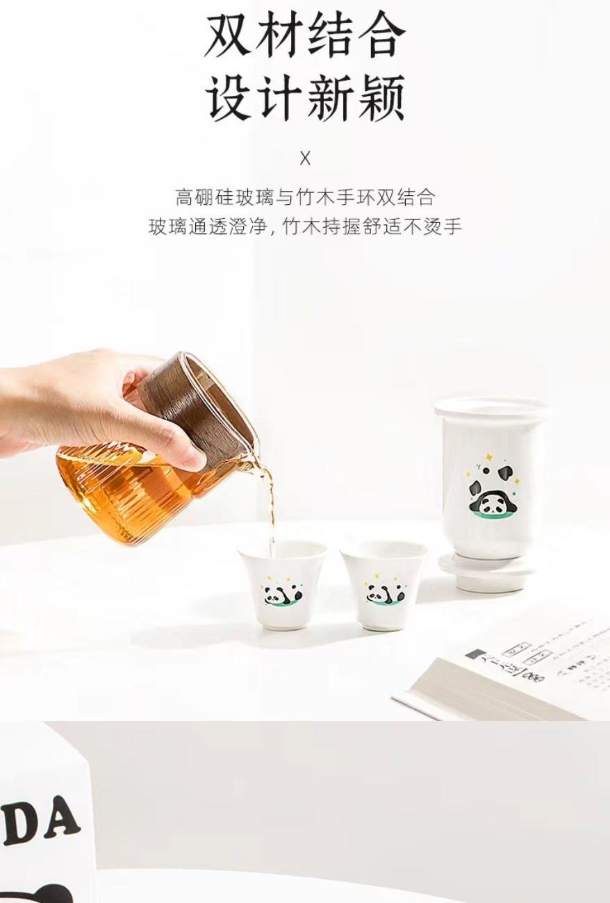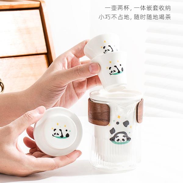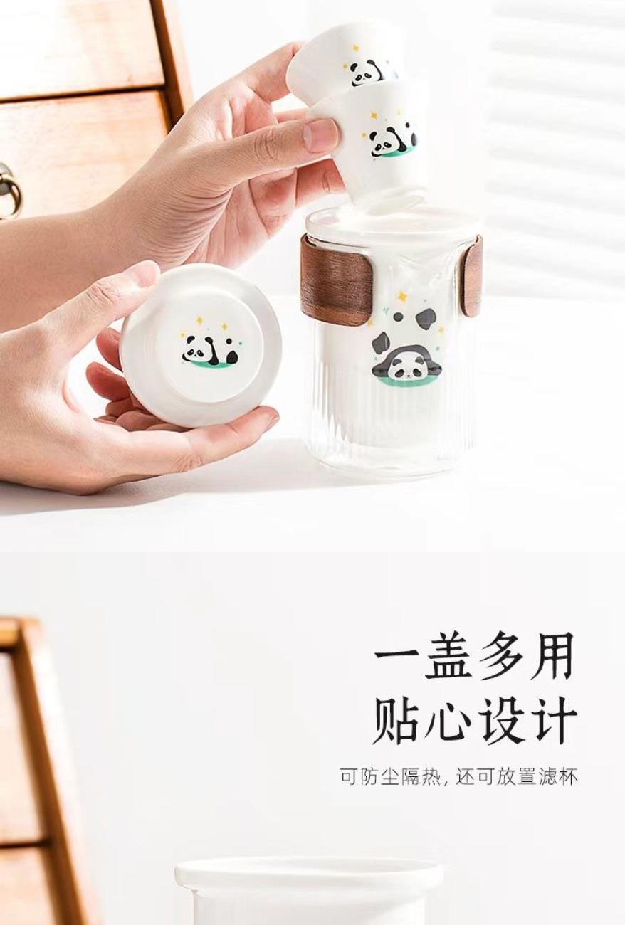 熊猫玻璃茶具 双材结合设计新颖高硼硅玻璃与竹木手环双结合玻璃通透澄净,竹木持握舒适不烫手,一盖多用贴心设计 可防尘隔热,还可放置滤杯,嵌套收纳不占空间 一壶两杯,一体嵌套收纳小巧不占地。