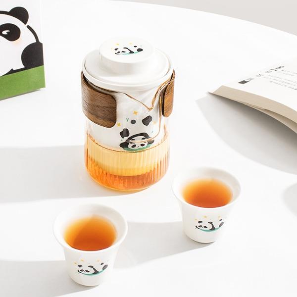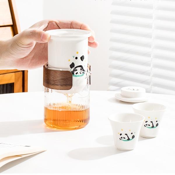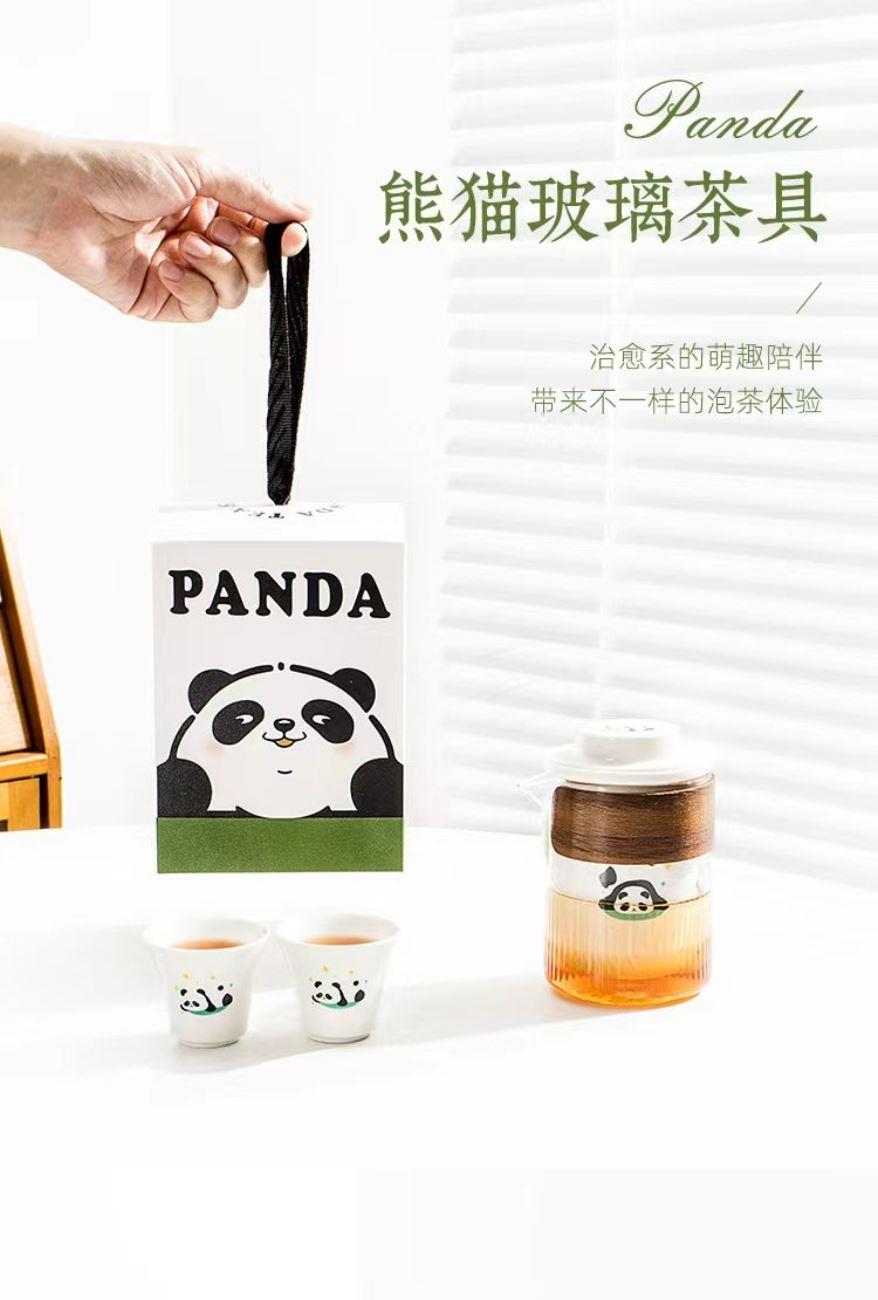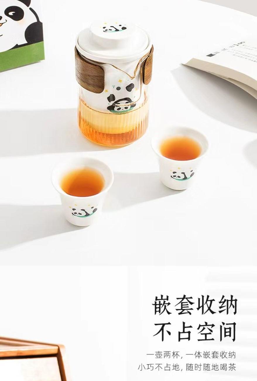 熊猫玻璃茶具 双材结合设计新颖高硼硅玻璃与竹木手环双结合玻璃通透澄净,竹木持握舒适不烫手,一盖多用贴心设计 可防尘隔热,还可放置滤杯,嵌套收纳不占空间 一壶两杯,一体嵌套收纳小巧不占地。